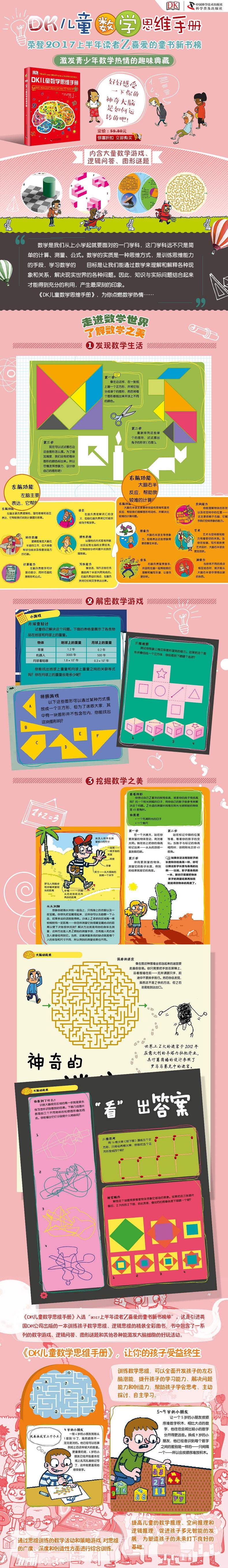 10个小朋友10分钟能吃10个香蕉,多少个小朋友能在100分钟里吃100根香蕉? 用一把小小的尺子测算出地球的周长,你行吗? 你知道密码是怎样编写出来的吗? 你见过只有一个面的纸条吗? 你想设计一个自己的迷宫吗? 从掉落的物品,到桥梁的长度,再到动听的音乐……你知道它们有什么共同点吗? 如果你对上面这些内容感兴趣,就快点翻开这本《DK儿童数学思维手册》吧! 《DK儿童数学思维手册》是英国DK公司出版的一本训练青少年数学思维、逻辑思维的精装全彩图书,书中仔细研究了历史上一些不错的数学大脑——从古希腊数学家阿基米德到第二次世界大战期间破译密码的专家阿兰•图灵;还包含了一系列的数字游戏、逻辑问答、图形谜题和其他各种能激发大脑细胞的好玩活动,让我们一起来看看,你的数学思维能力到底有多强! 激发你内在的潜能,让神奇的数字为你服务。准备好迎接一场头脑风暴吧!