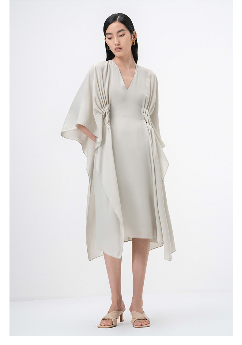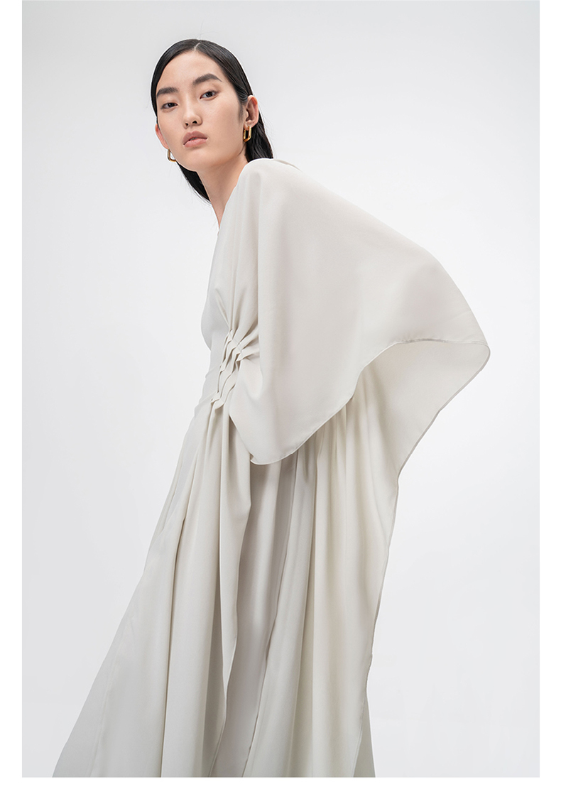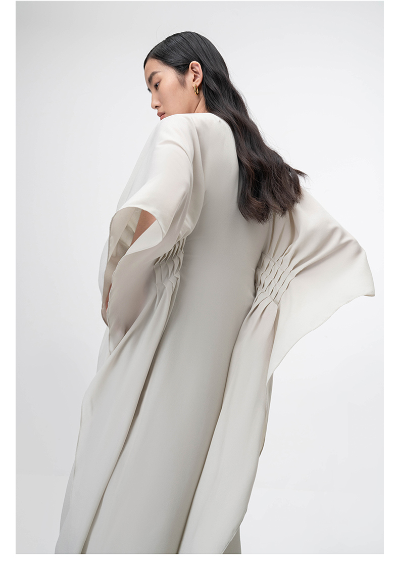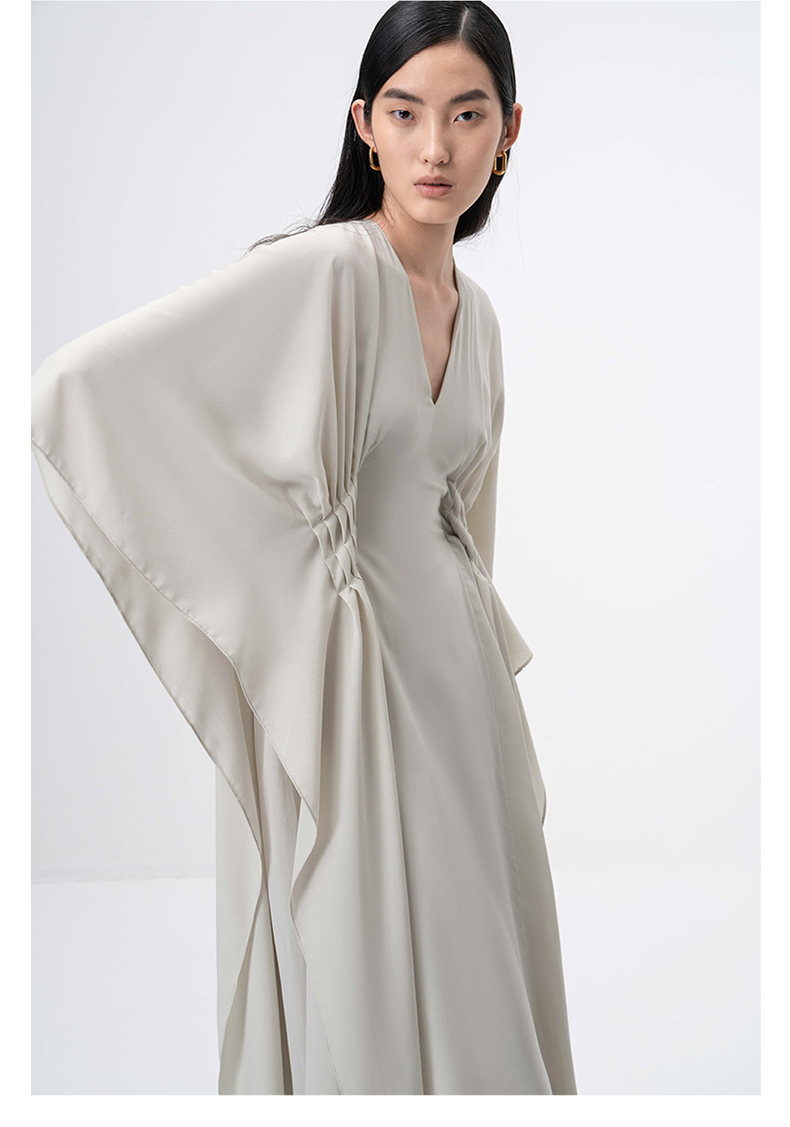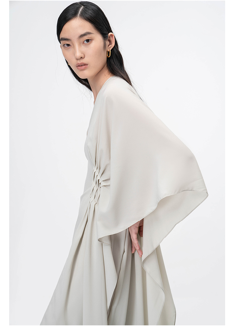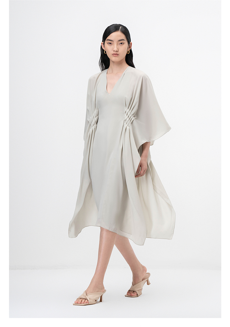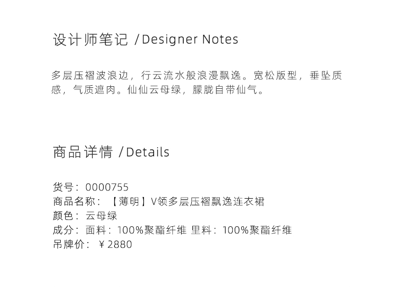 【薄明】云母绿V领多层压褶立裁飘逸连衣裙/0000755