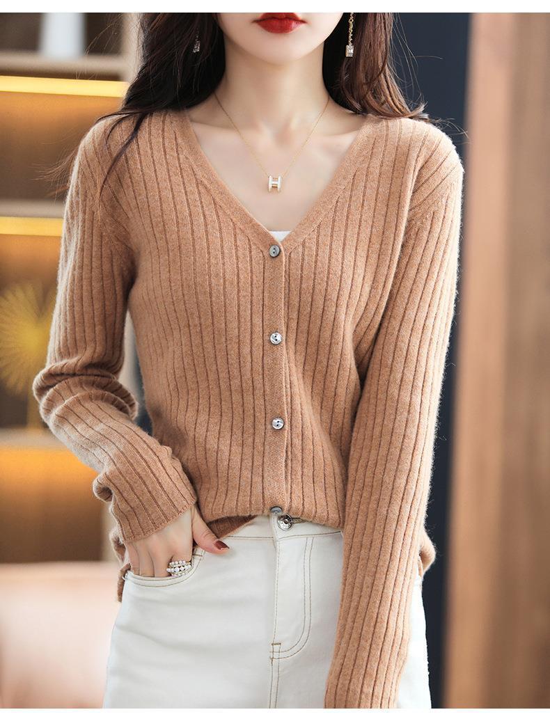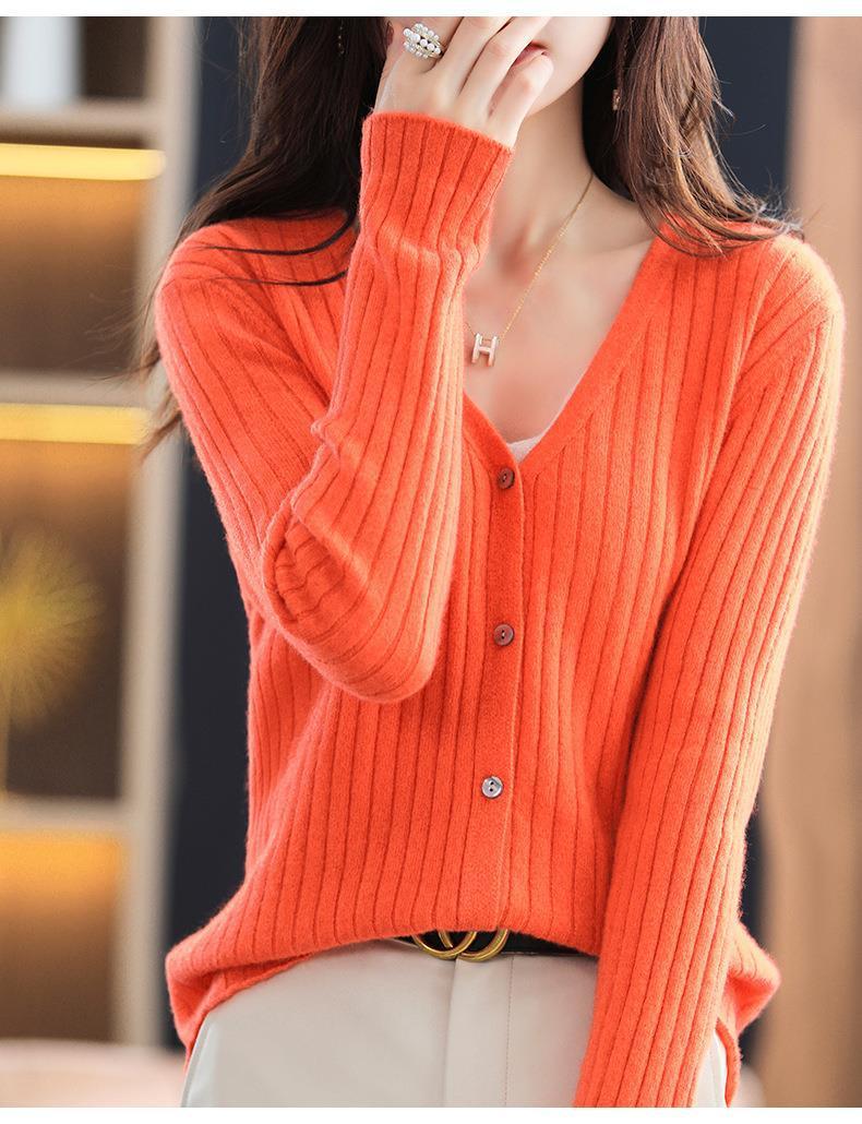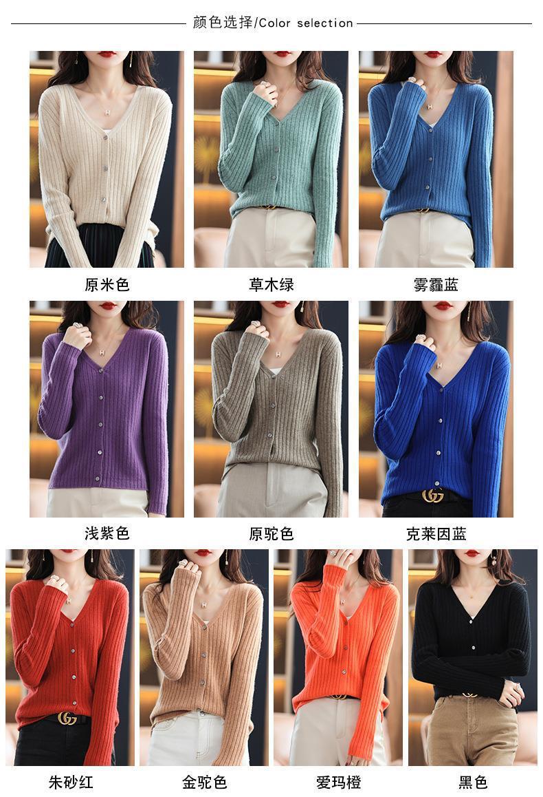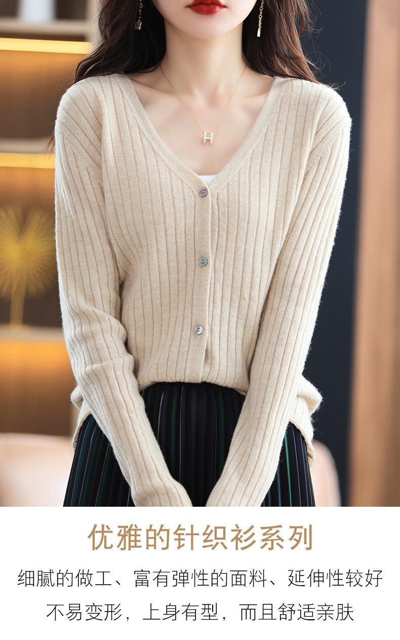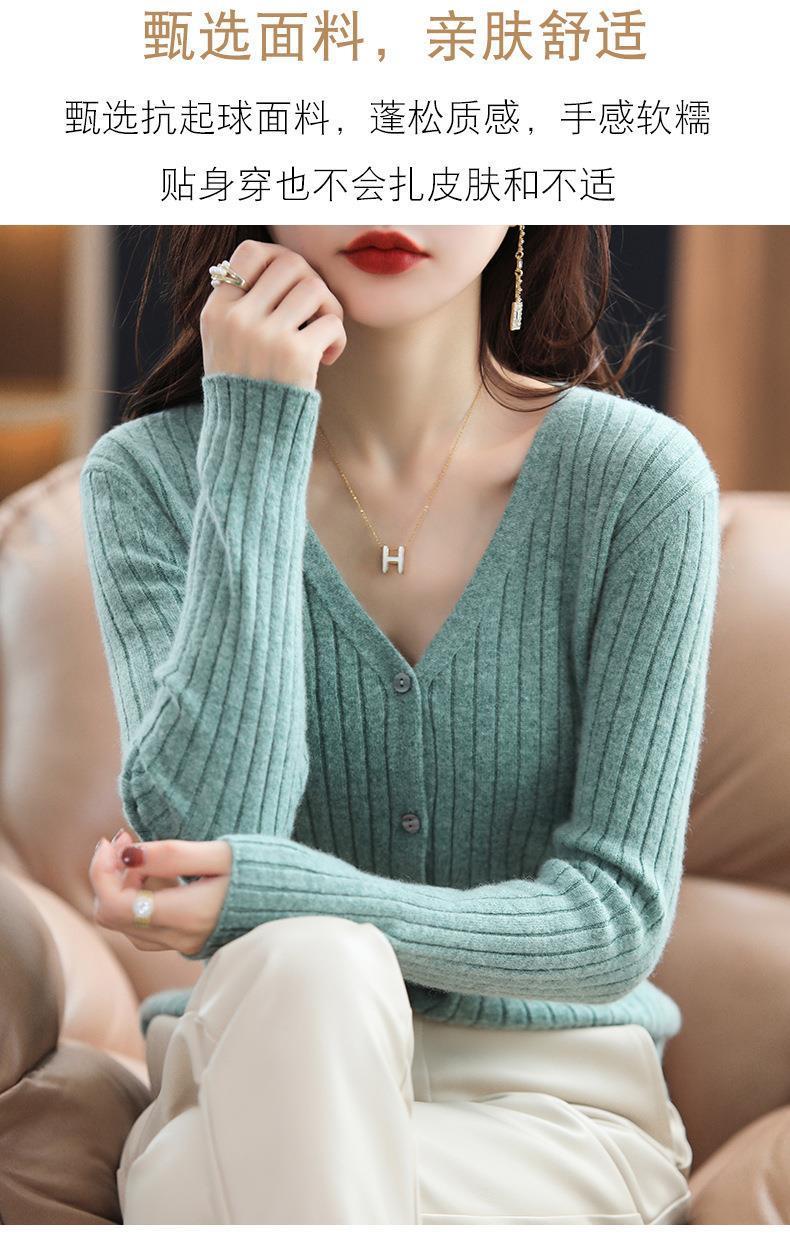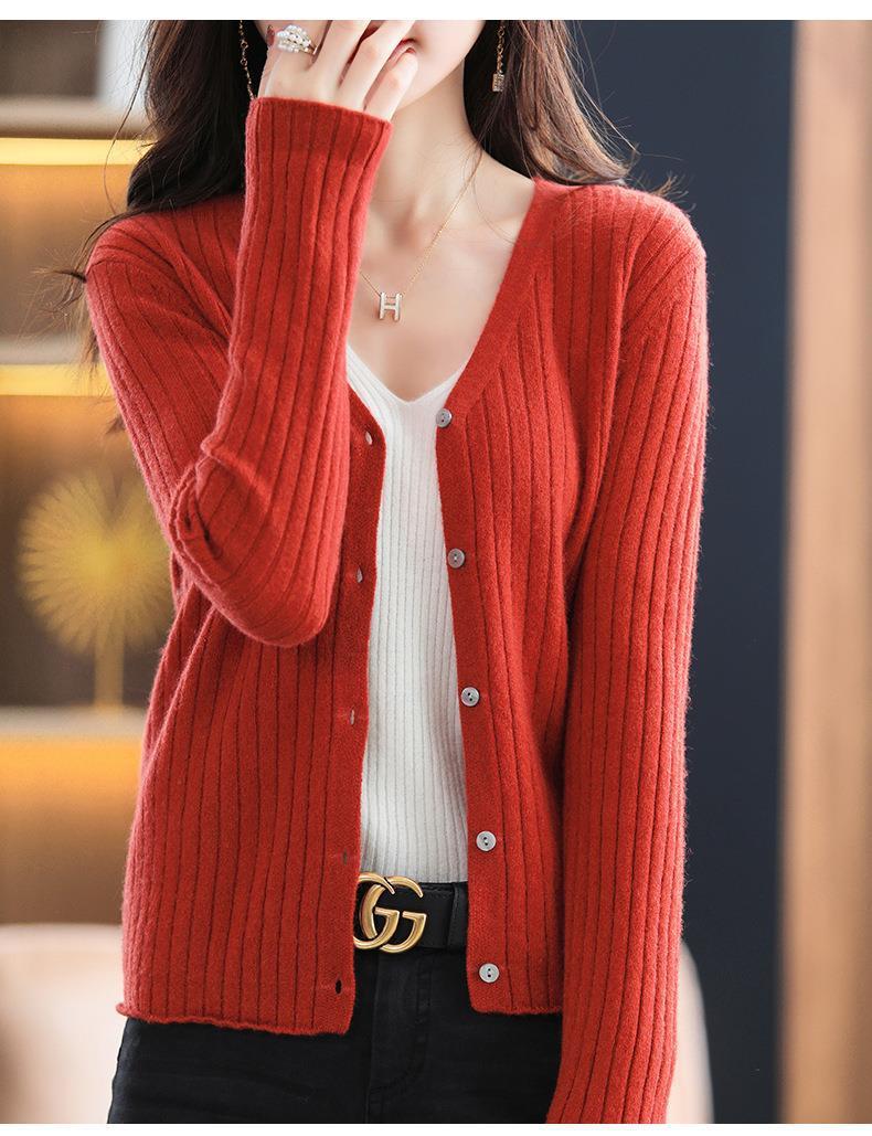 朱砂红色开衫女V领针织衫抽条开衫百搭显瘦打底休闲针织外套上衣