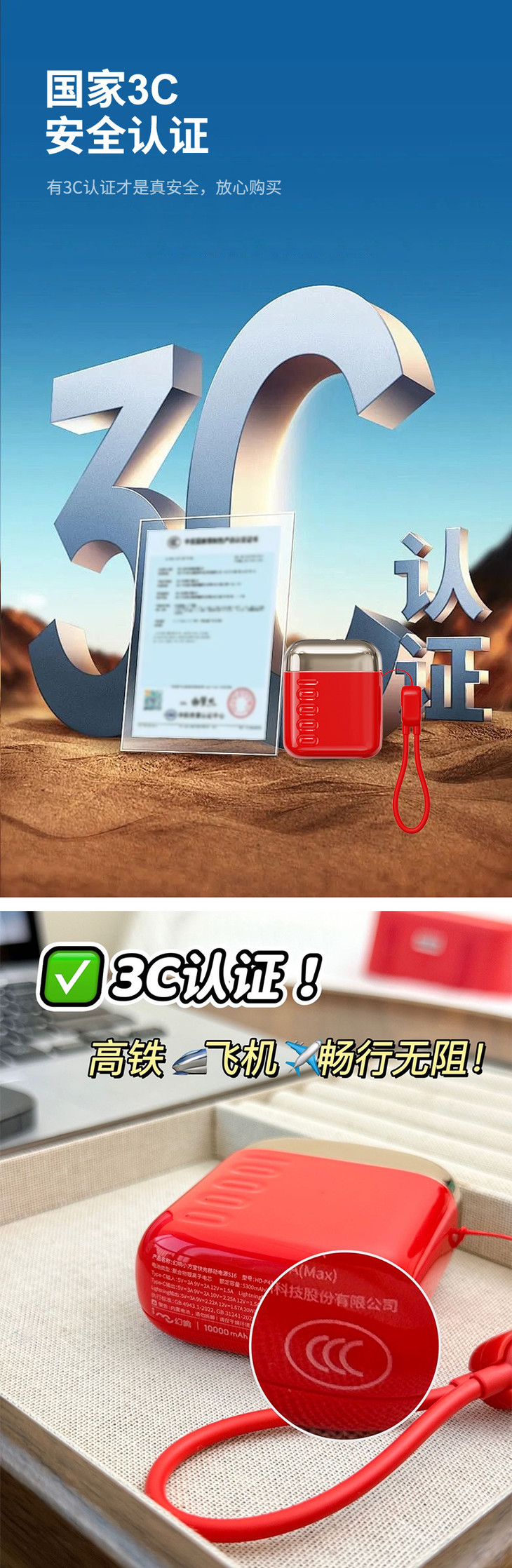 ✅通过国家3C认证,品质有保障❗️ 这可是充电安全最权威的“保护伞”🛡 ⚠3C认证可是电子产品质量的重要标准 从原材料的选择,到生产工艺的把控,每一个环节都经过了严格的检测和把关,确保产品的安全性和可靠性👍 而且它还符合国际UN38.3国际空运安全标准,这意味着不管是坐飞机翱翔蓝天✈, 还是搭乘高铁风驰电掣🚄, 都能妥妥地带上它,陪伴你去往世界各个角落, 随时随地为设备“续命”, 安全感满满当当,出行充电毫无顾虑💪