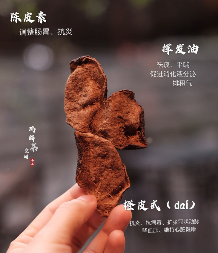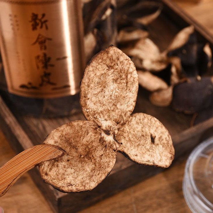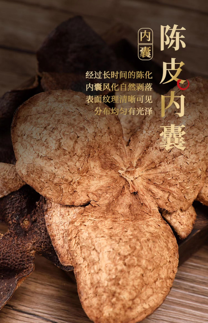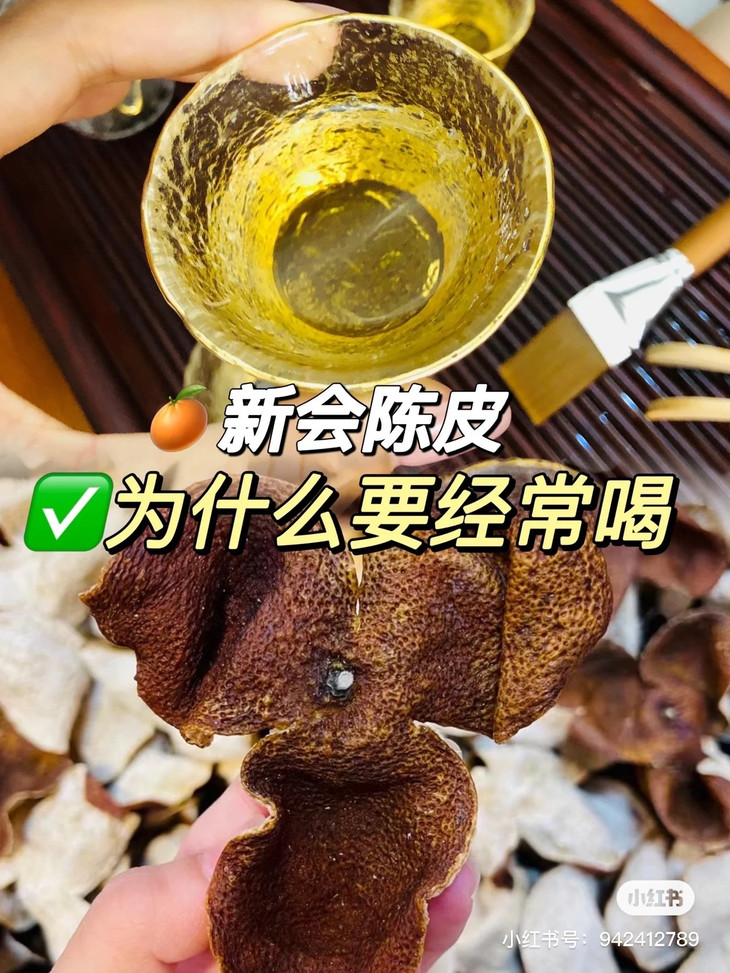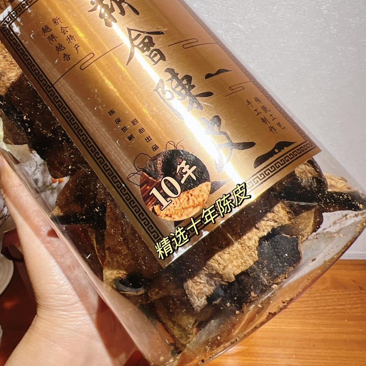 新会陈皮顾名思义,以陈为胜。很多人理解的陈皮就是橘子皮,其实是不对的。正宗陈皮只能以新会茶枝柑柑皮为原料。而且不是所有的“陈皮”都具备价值。 储存三年以上的新会陈皮,烈性和果酸味会随着时间减少,陈香味逐渐增加,才适合使用。三年陈皮,越陈越香,决定了陈皮的年份越久,它的香味越浓,营养越高 通透明亮 味足浓郁 冲泡一壶,茶色黄红,通透自然,气味清香 香气陈化陈香,茶汤明亮。 🌸🌸🌸最简单的就是泡水喝,陈皮不用清洗, 开水倒入,等待20s, 把第一泡水倒掉, 第二泡就可以喝了, 汤色金黄清亮,柑橘香会慢慢扩散,越喝越醇香 🍵🍵正宗的新会陈皮是3瓣晒干, 泡一次只需要一瓣,一瓣就可以泡一天 而且每一泡,都能体会到不同的醇香