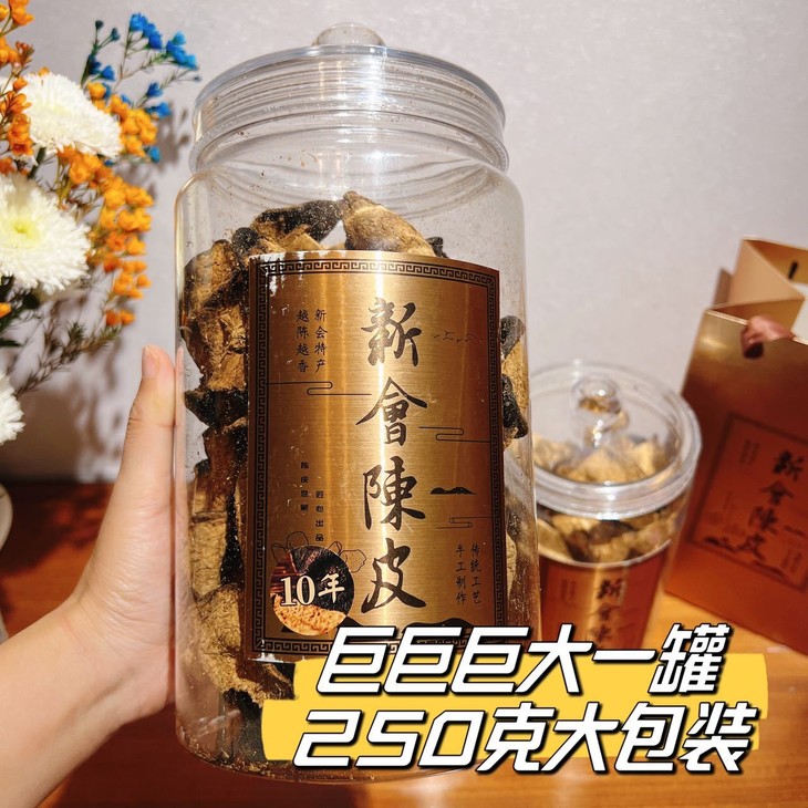 1.【产品配方】:新会陈皮 2.甄选原料:甄选新会十年陈皮,真自然生晒自然陈化 3.陈皮250g*2罐/500g自然生晒传统手造,陈香四溢旧青未变 4.外皮油室均匀明显,凹凸有致陈香袭人;内囊风化自然剥落,表面纹理清楚;历经岁月香浓醇厚,柑香醉人回味无穷 5.饮用方法:取出适量陈皮放入煮茶壶中,待水烧开即可饮用;煲汤时也可取出适量陈皮放入
