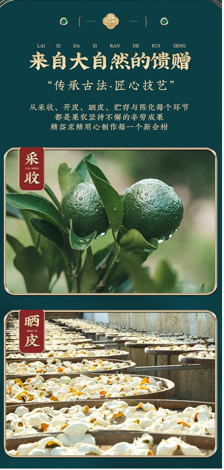 晒制工艺 我们家陈皮使用的全是来自广东省江门市的新鲜大红柑,种植过程中不打农药,使用灭虫等预防和除虫; 肥料都是自己家制作的天然邮寄肥料(主要是花生饼粉碎施肥),坚持有机种植的高品质陈皮。 整个开皮的过程我们也始终坚持传统的人工开皮手法,分两刀三片和三刀三片两种手法 在开皮之后,需要将果皮置于阴凉通风处,进行晾晒4-5个小时,让柑皮中的水分缓慢蒸发的同时有效保留柑皮内的营养物质