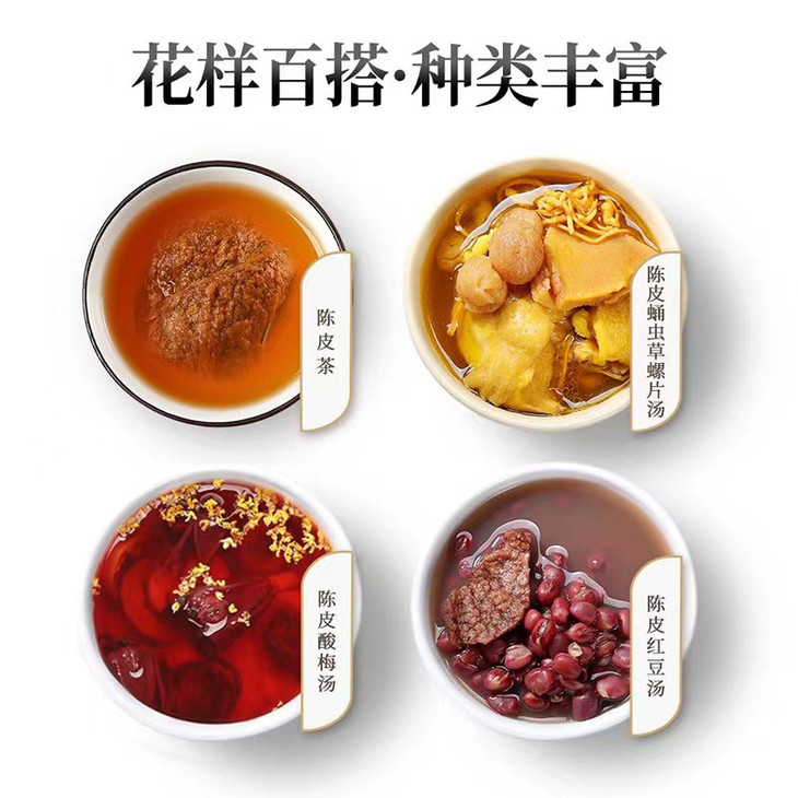 ✅✅每颗都是纯手工制作,10生晒新会陈皮。货真价实。让您买的放心喝的安心 🌈🌈🌈陈皮多种吃法,可以搭配很多食材烹煮出更美味更健康的食物 ⭐️陈皮是有着非常高的药用价值的 ❣️陈皮同补药一起用则补虚,同沉降药一起用则沉降,跟不同食物的搭配,不但可以放大功效治疗百病,还能做成药膳,和不同的食材泡水或者煮粥,更能缓解不同的疾病症状。
