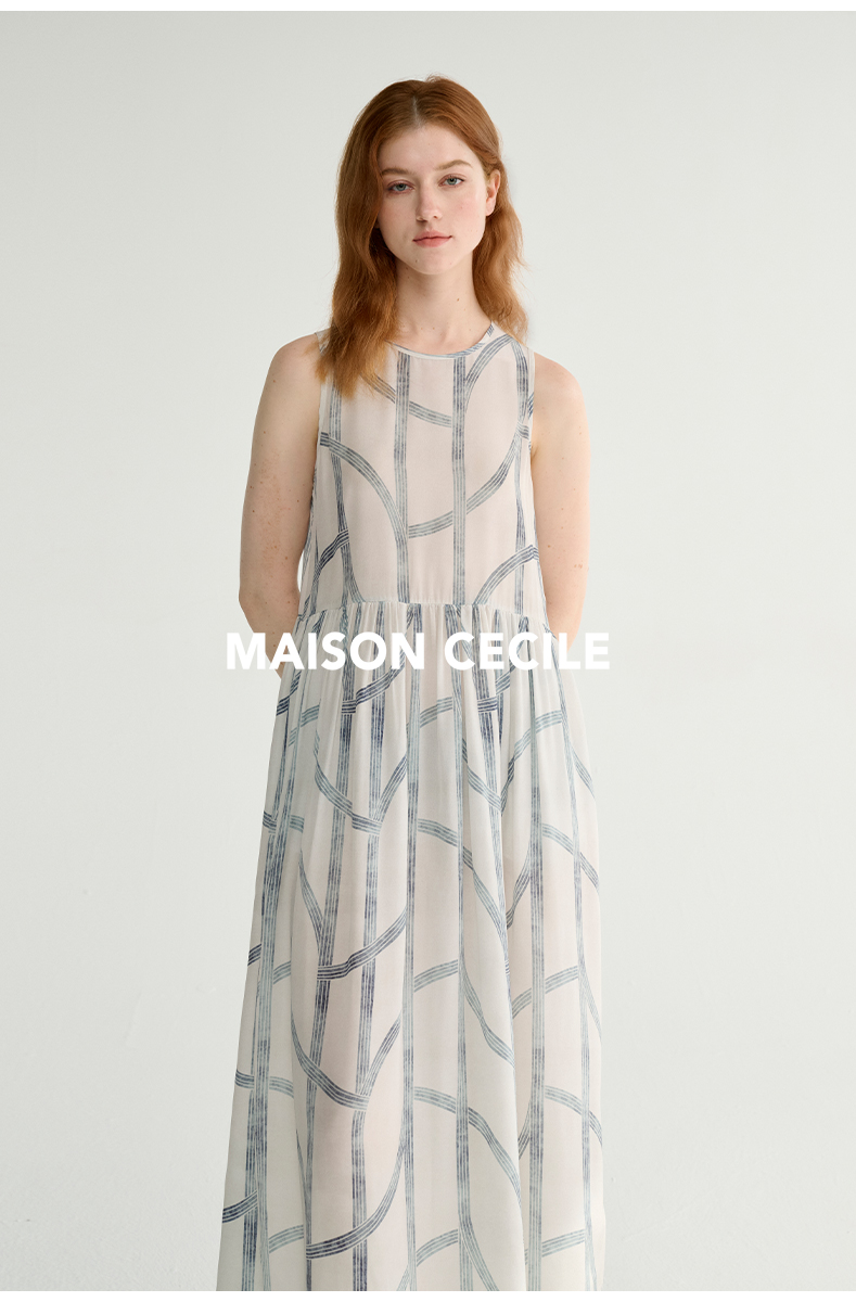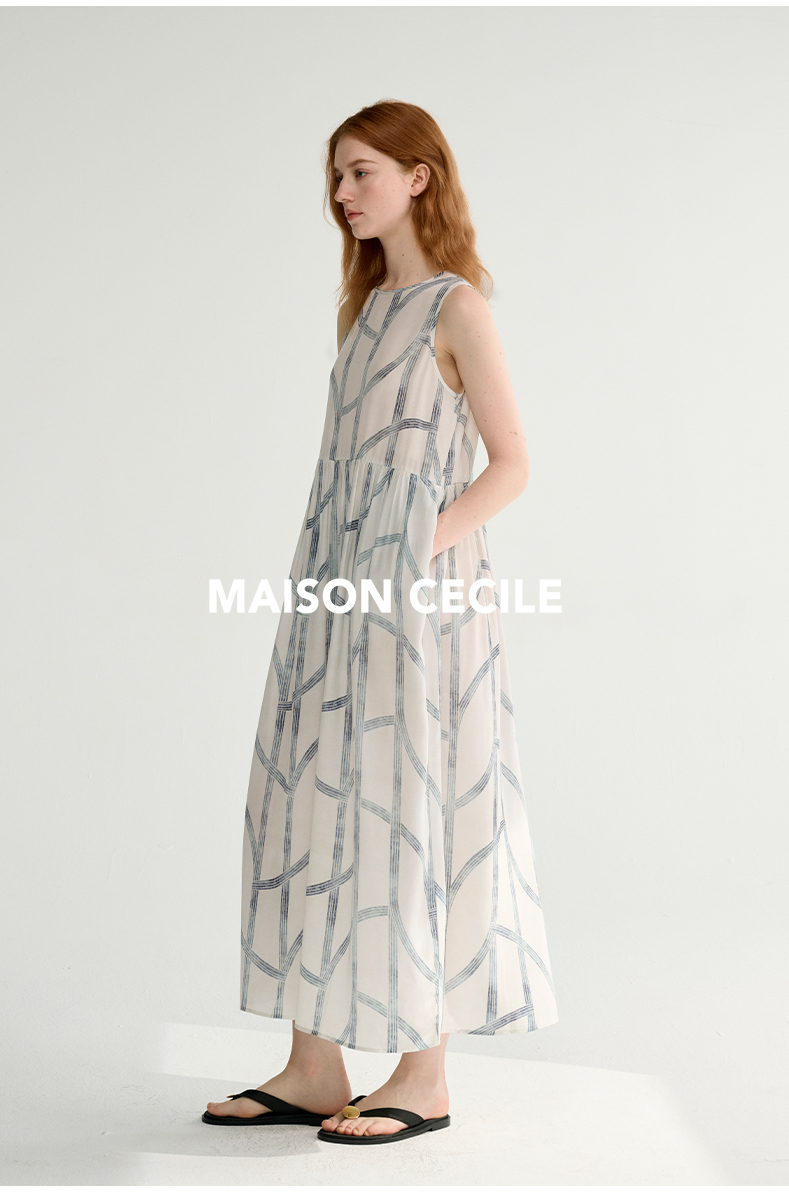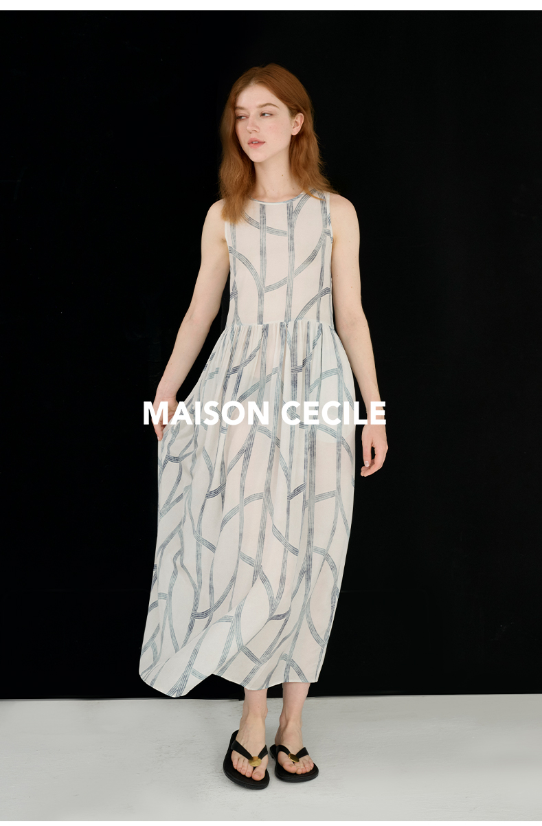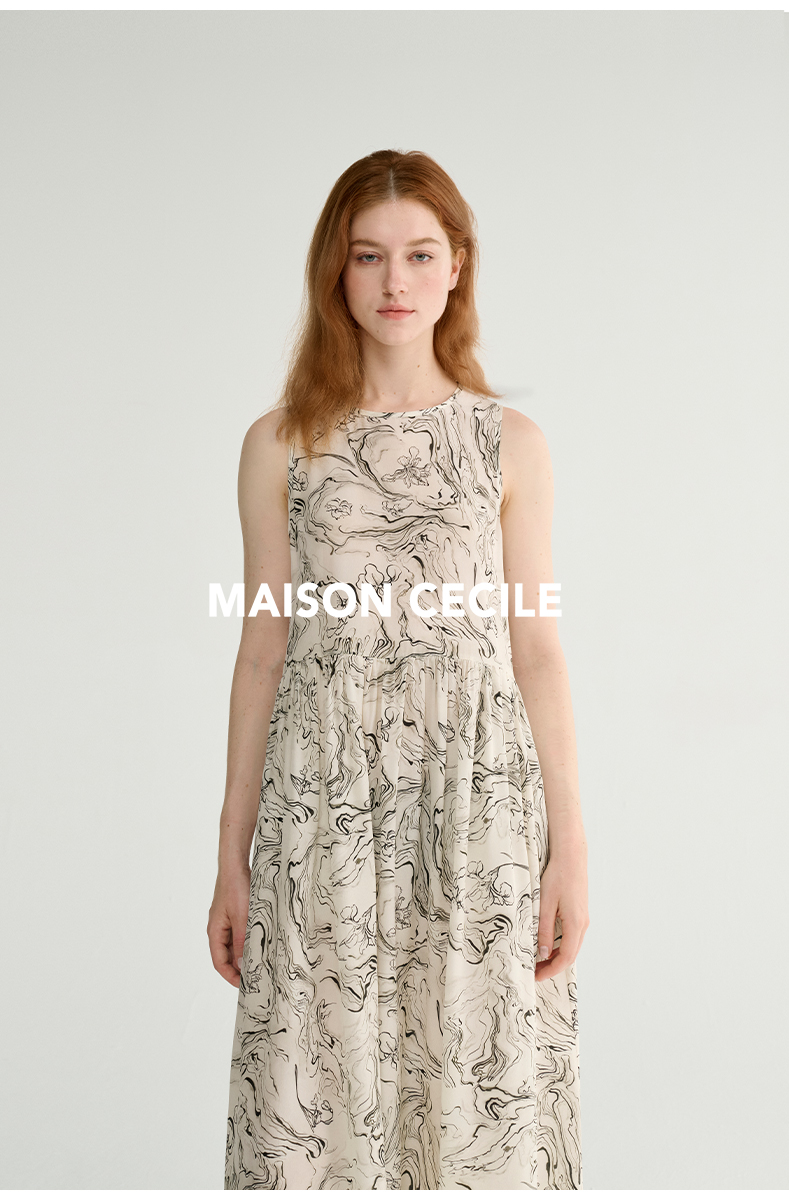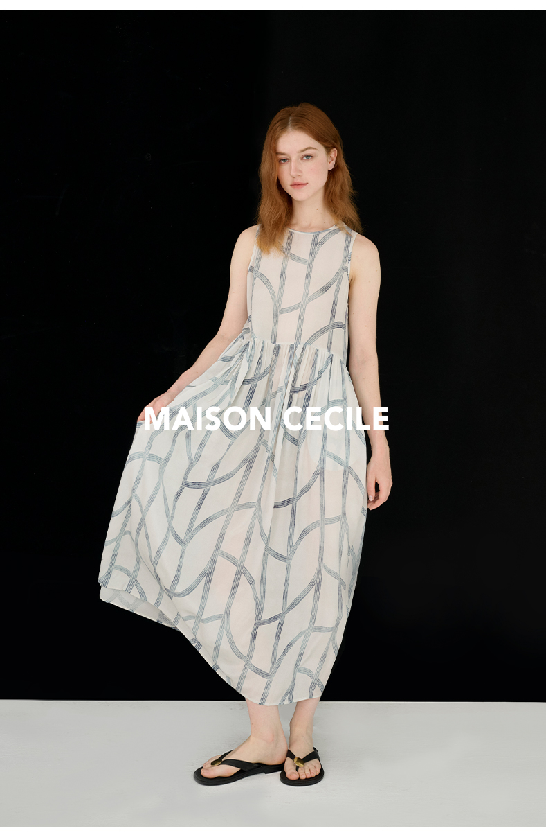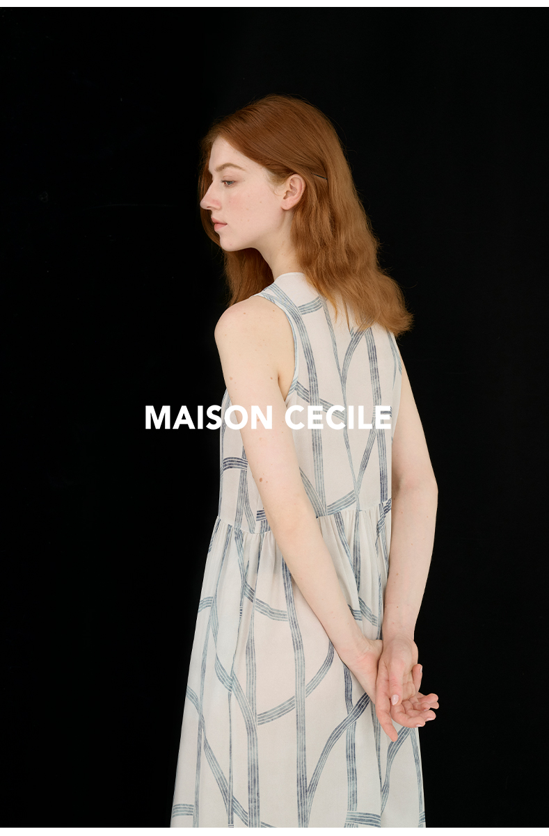 MAISON CECILE 设计师印花/桑蚕丝不规则艺术线条无袖背心连衣裙