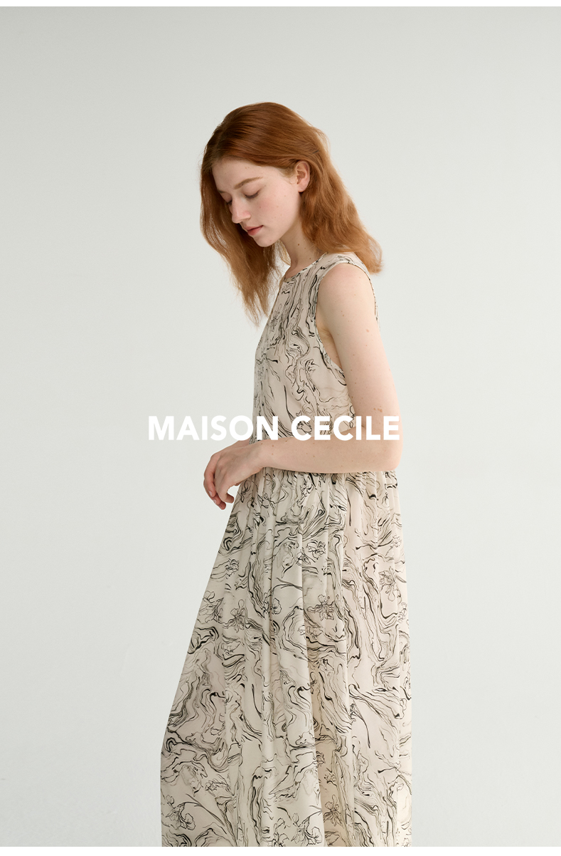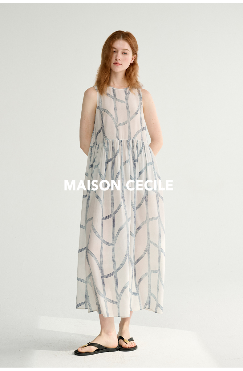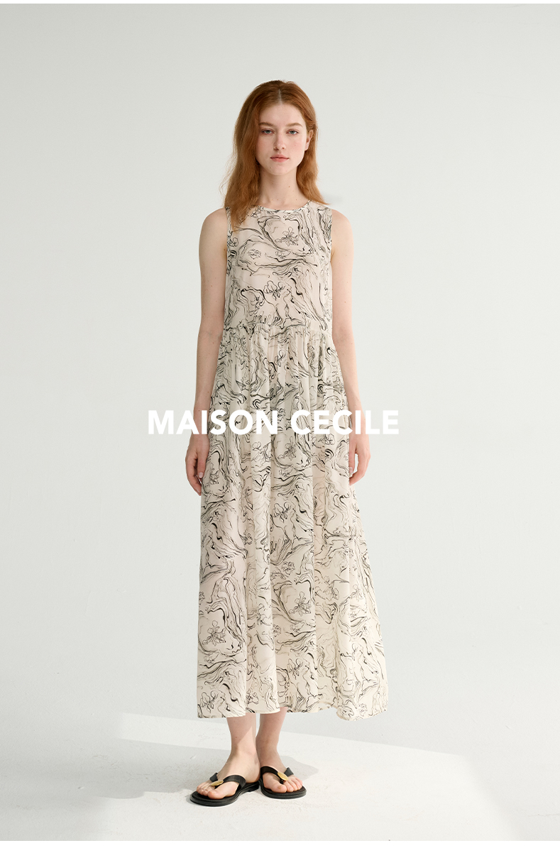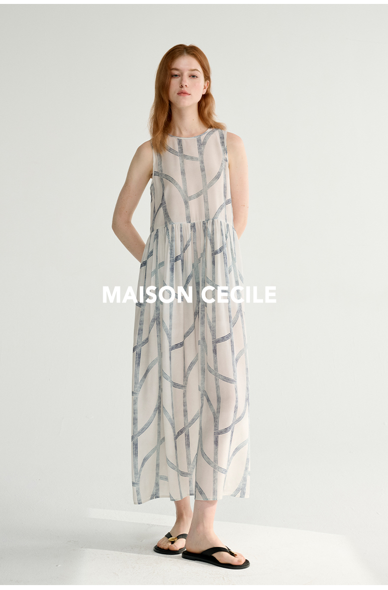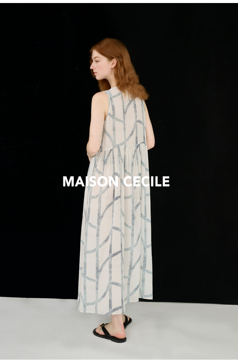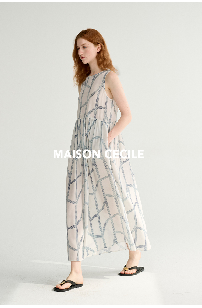 MAISON CECILE 设计师印花/桑蚕丝不规则艺术线条无袖背心连衣裙