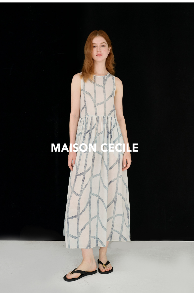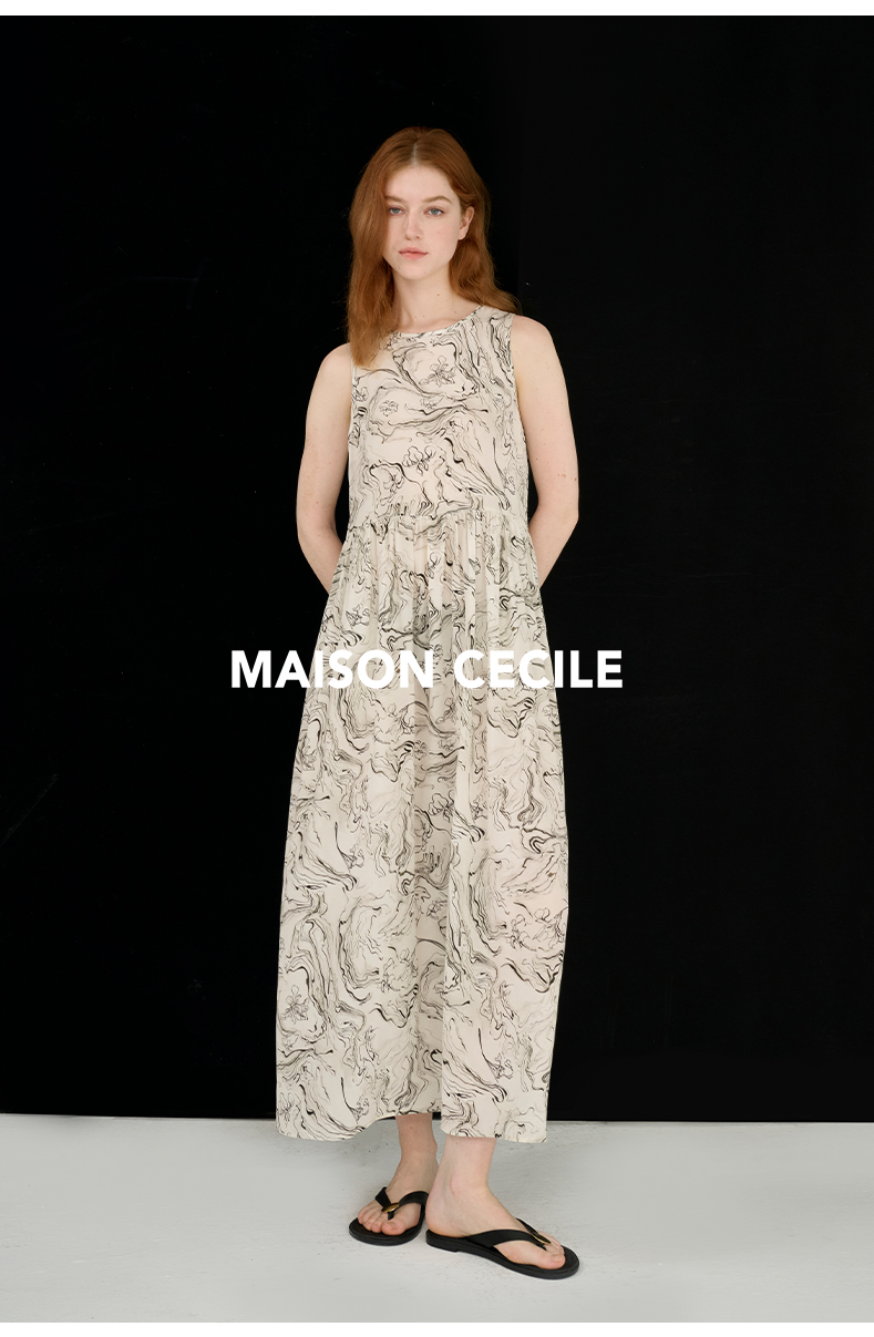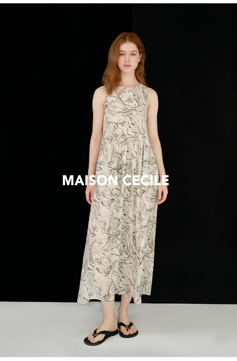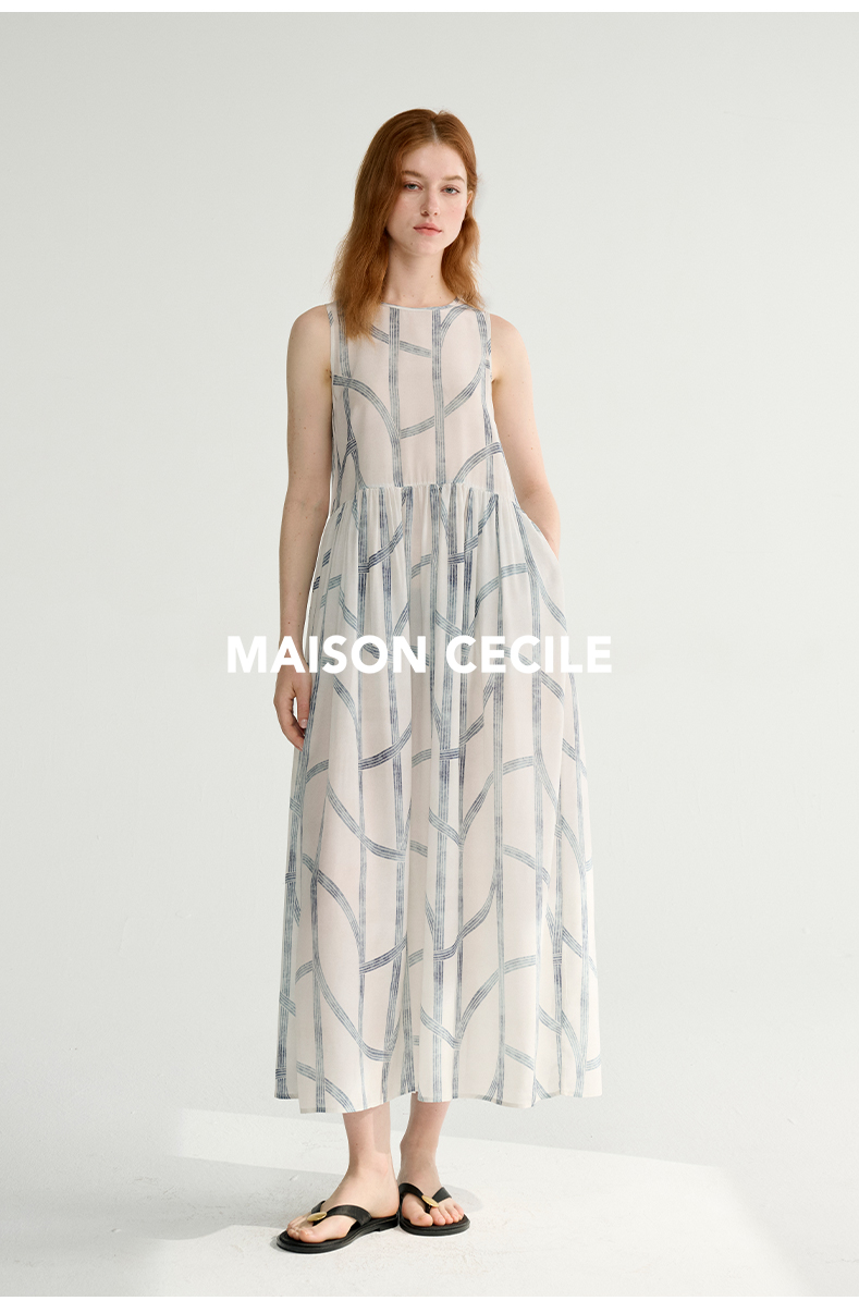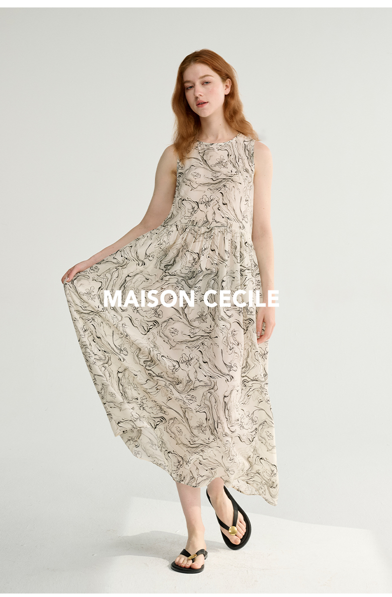 MAISON CECILE 设计师印花/桑蚕丝不规则艺术线条无袖背心连衣裙