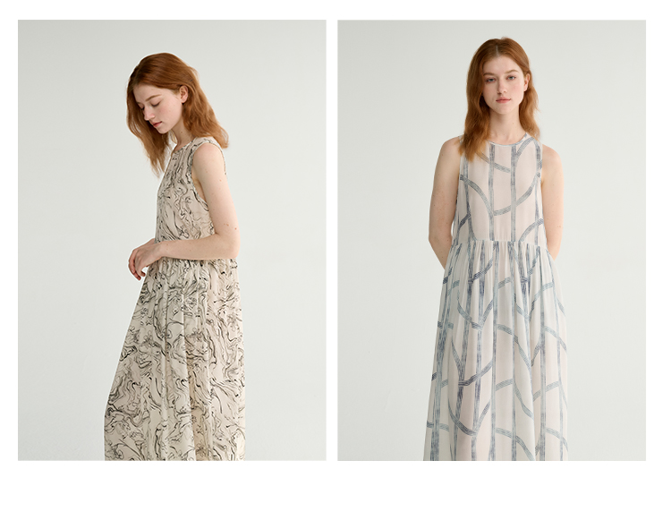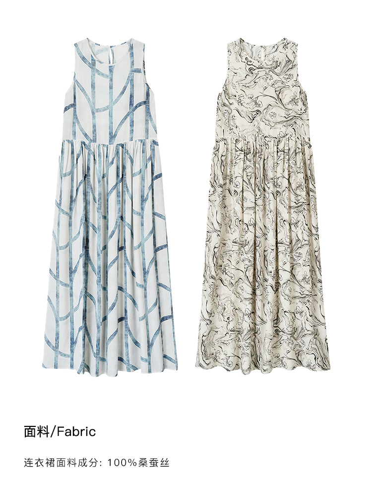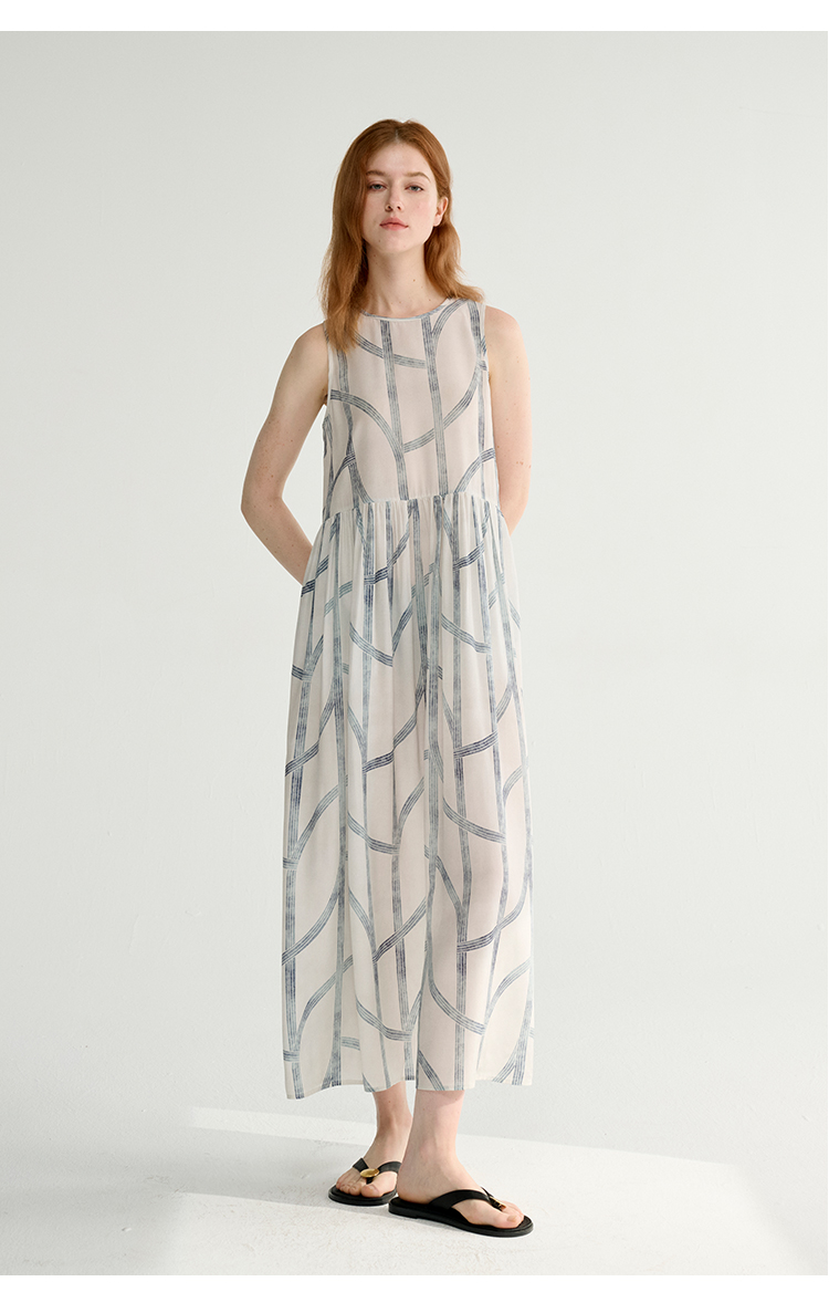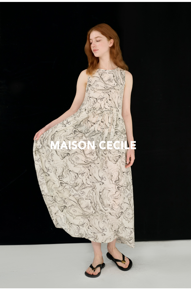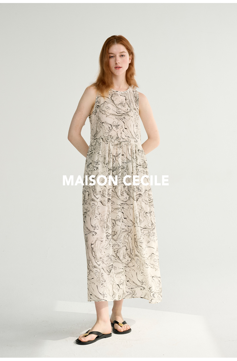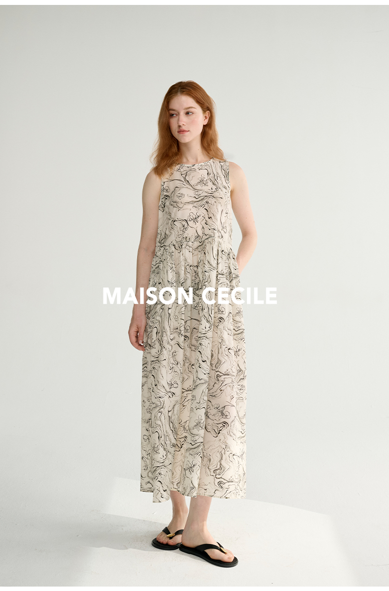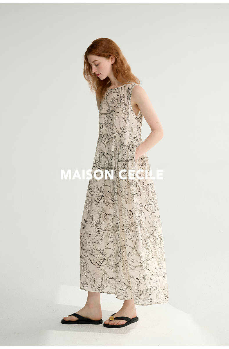 MAISON CECILE 设计师印花/桑蚕丝不规则艺术线条无袖背心连衣裙