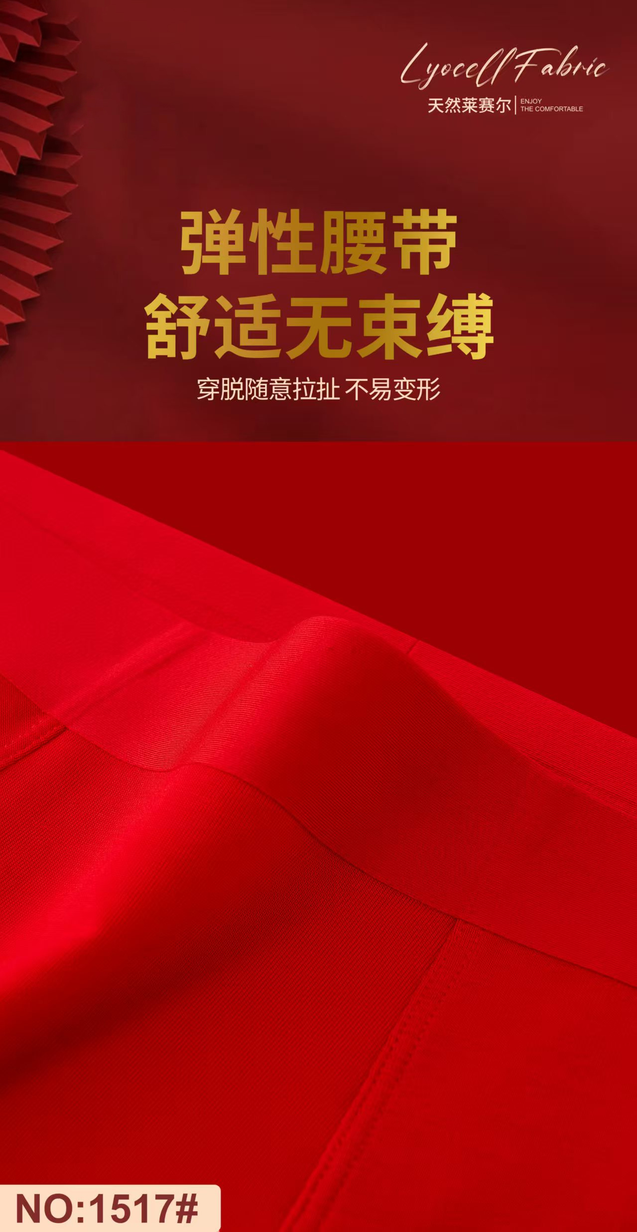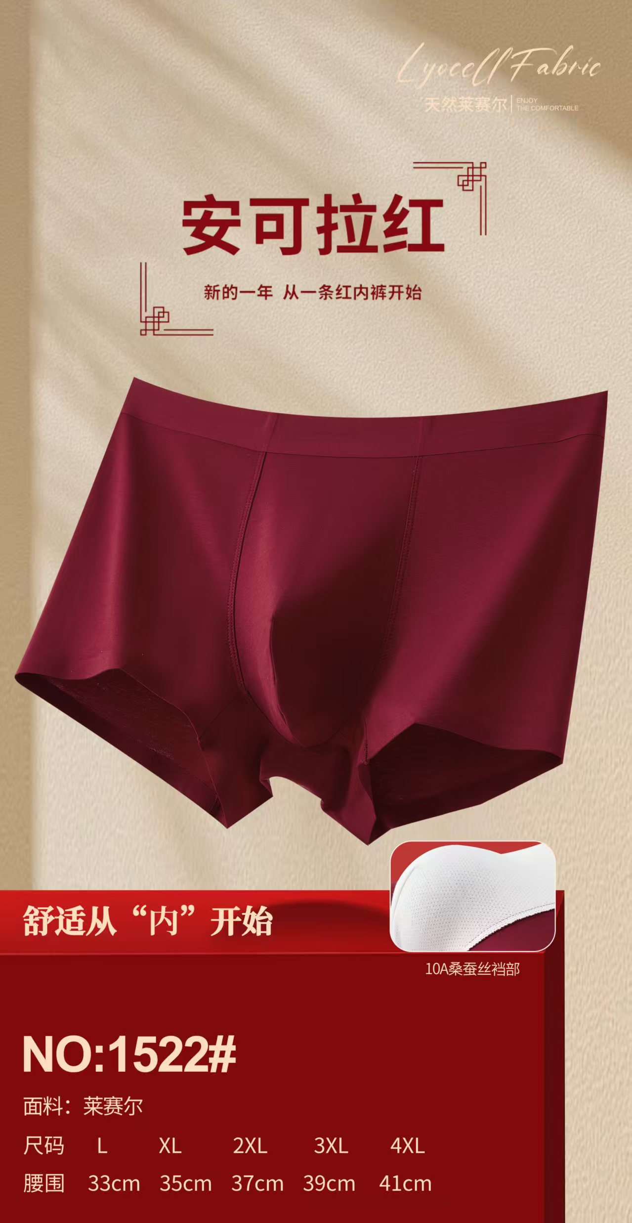 男士莱赛尔净色无痕平角内裤大红安可拉红节日平角裤1517/1522
