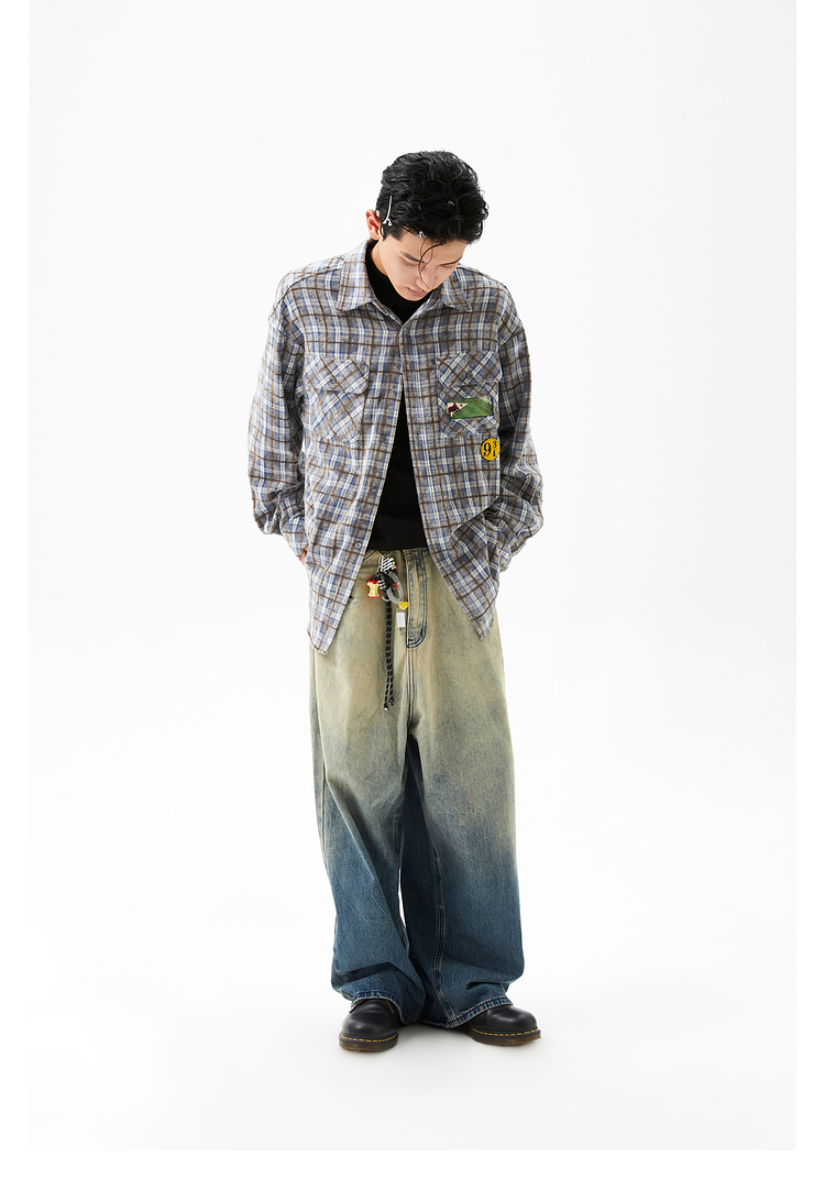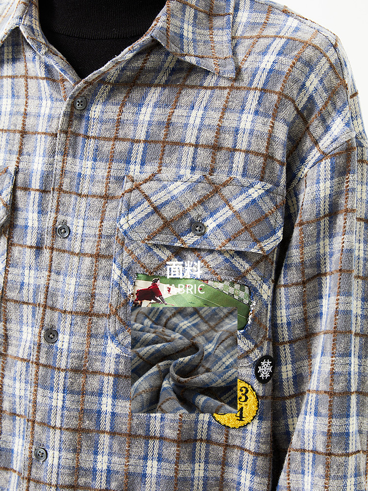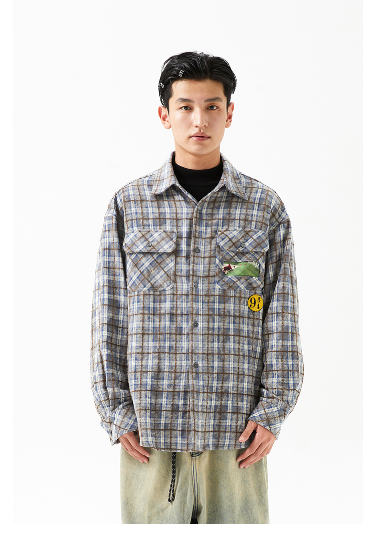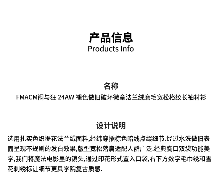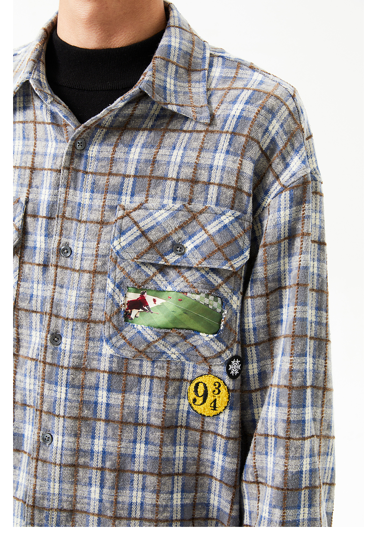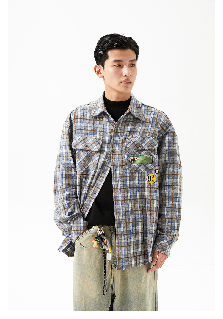 FMACM/CS24200/褪色做旧破坏徽章宽松格纹长袖衬衫