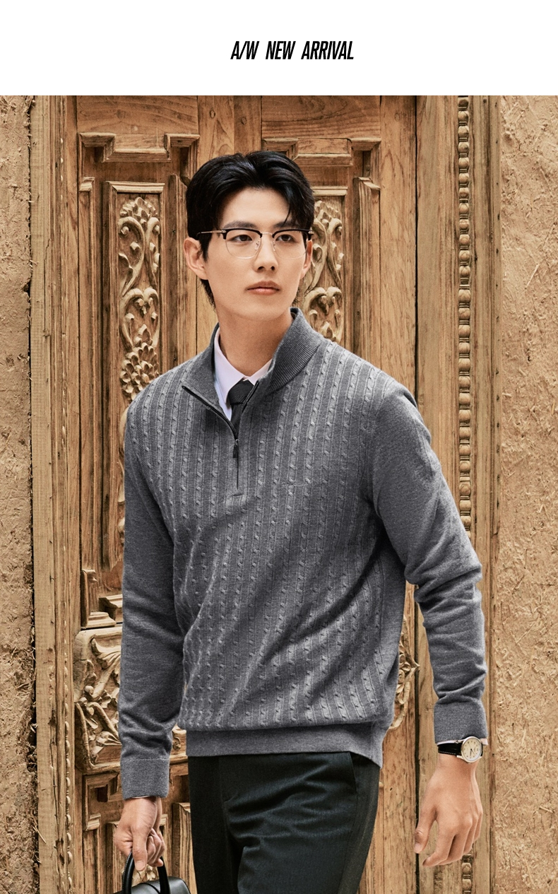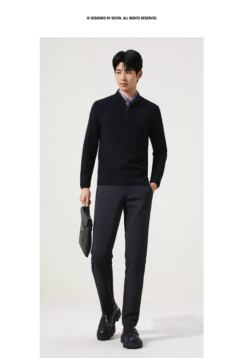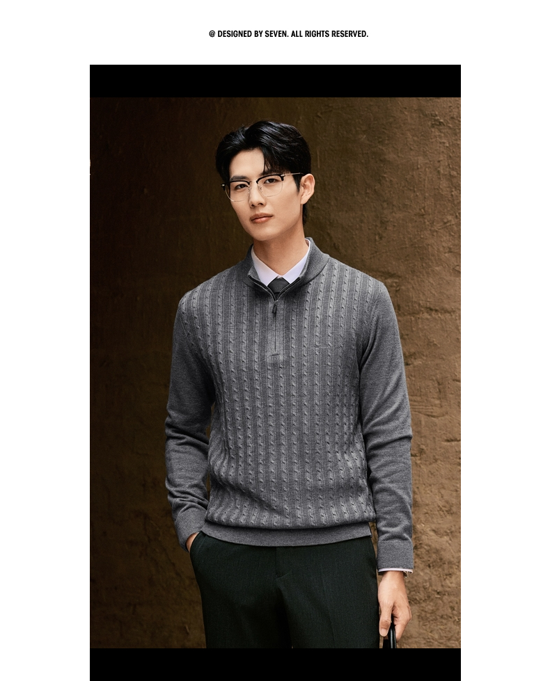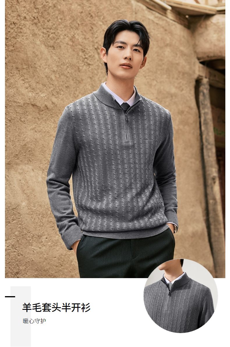 【含羊毛/可机洗/抗静电】柒牌男装秋季新品半开衫立领套头薄毛衫129Y70560