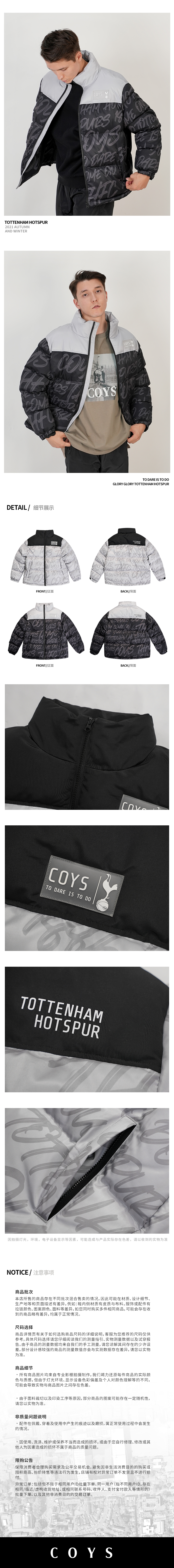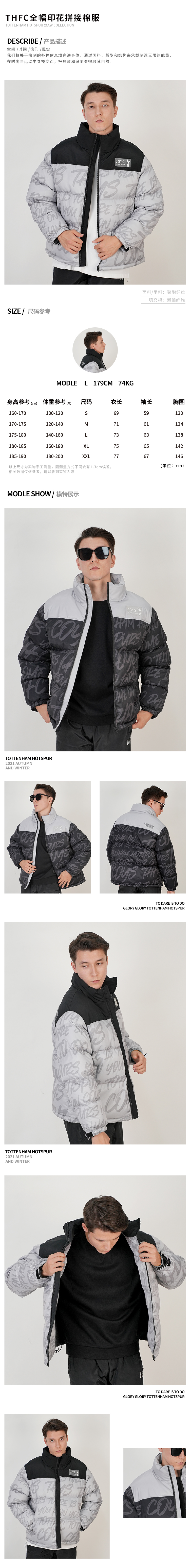 托特纳姆热刺潮流字母印花拼接运动休闲保暖棉服成人男
