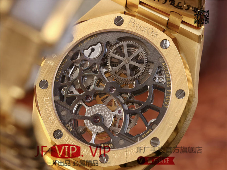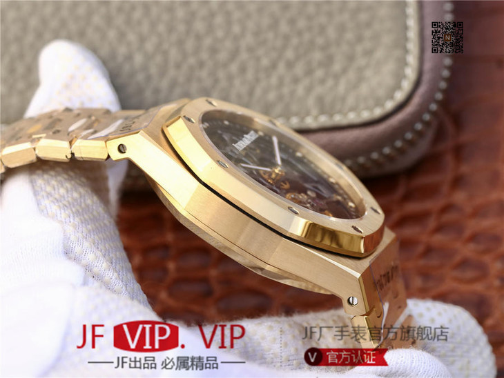 爱彼V2升级版皇家橡树26518真陀飞轮男士腕表。这是一项对精度密要求极其严苛的高级制表工艺,丝毫分差都可能会影响机芯的走时精度或防震效果。这款全新腕表均搭爱彼自主研发的镂空Camber 2924手动上链机芯,动力储存为80小时,表壳直径41mm厚度12.4毫米。早在1930年代,爱彼就已经掌握镂空装饰这一精密高级工艺,时至今日依然保持着传统制作方式:通过锉削、装饰、直至最终的装饰打磨,出于美学与技术的双重考量,需要完全通过手工完成。