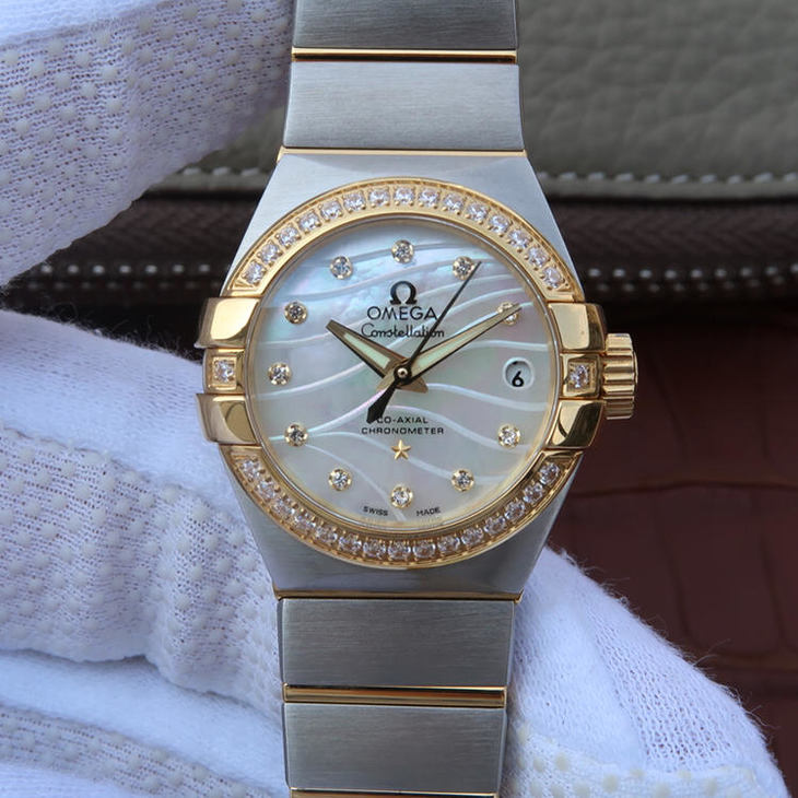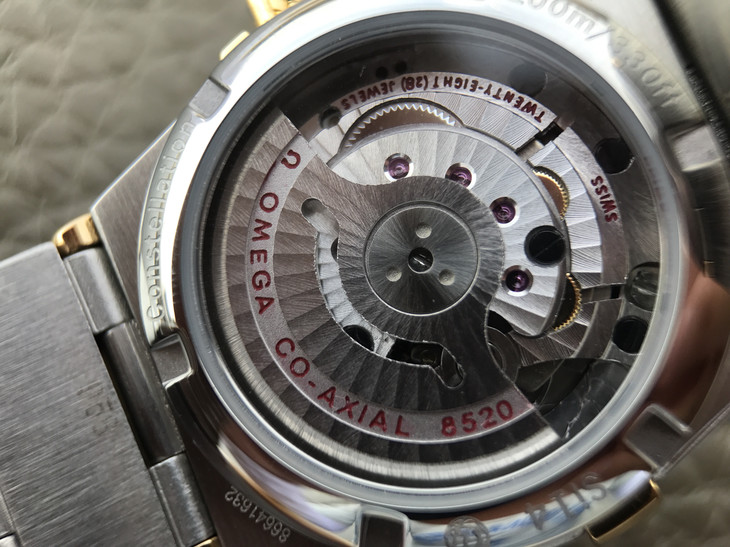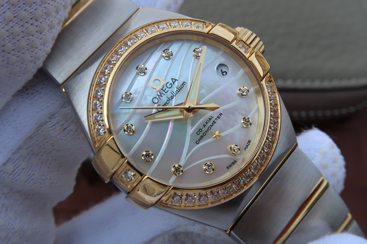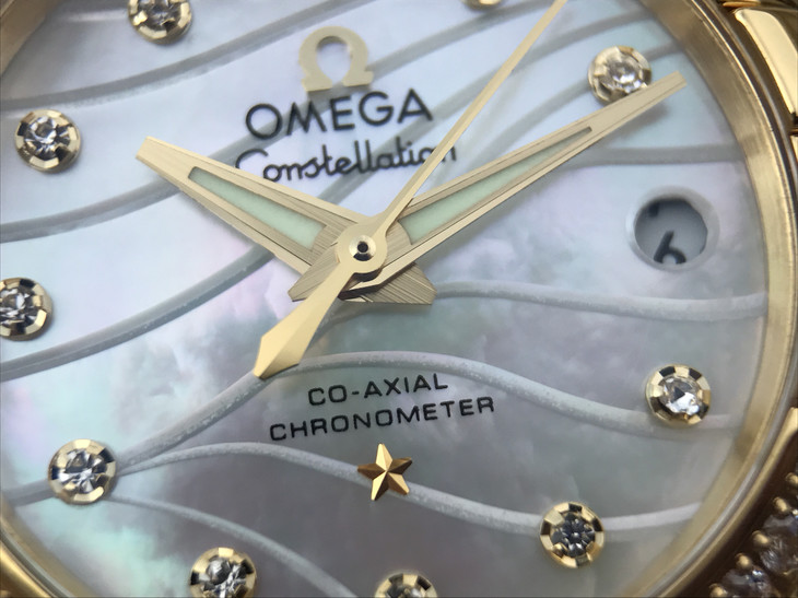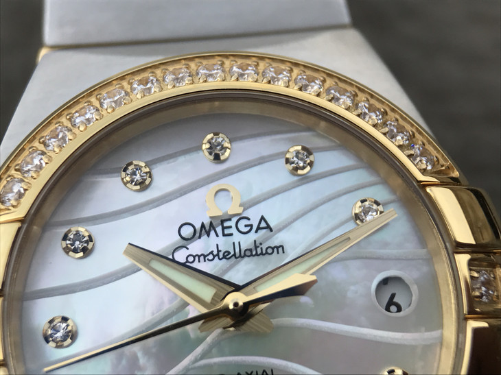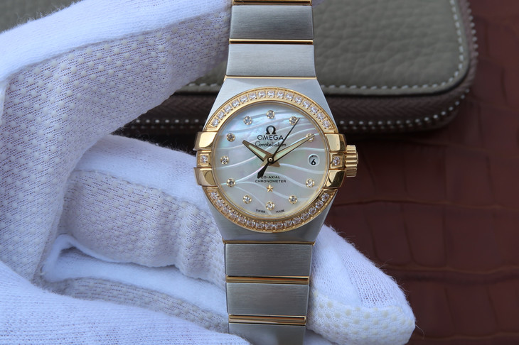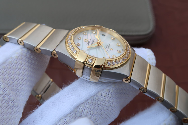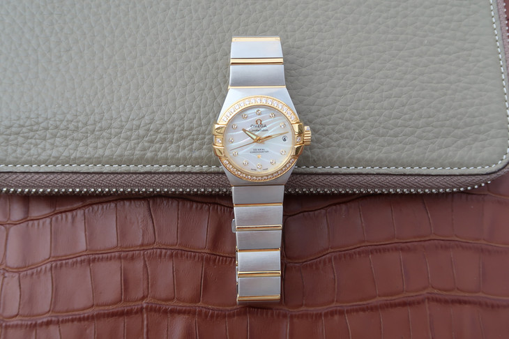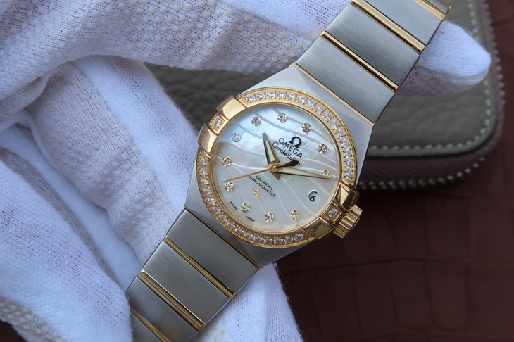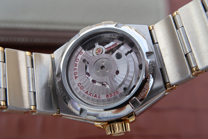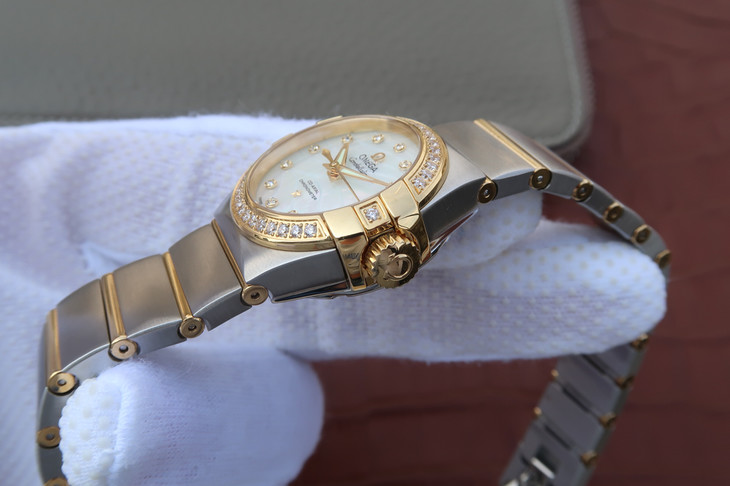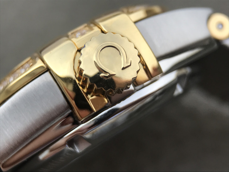 V6欧米茄星座系列27mm直径机械女士手表,精钢镀18k表链表壳,搭载定制版8520全自动机械机芯,尺寸:27*13毫米,具备诸多新颖设计