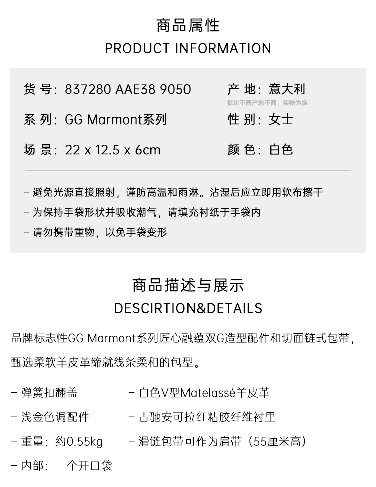 GUCCI 古驰 女士 GG Marmont系列 小号单肩背包 白色 837280 AAE38 9050