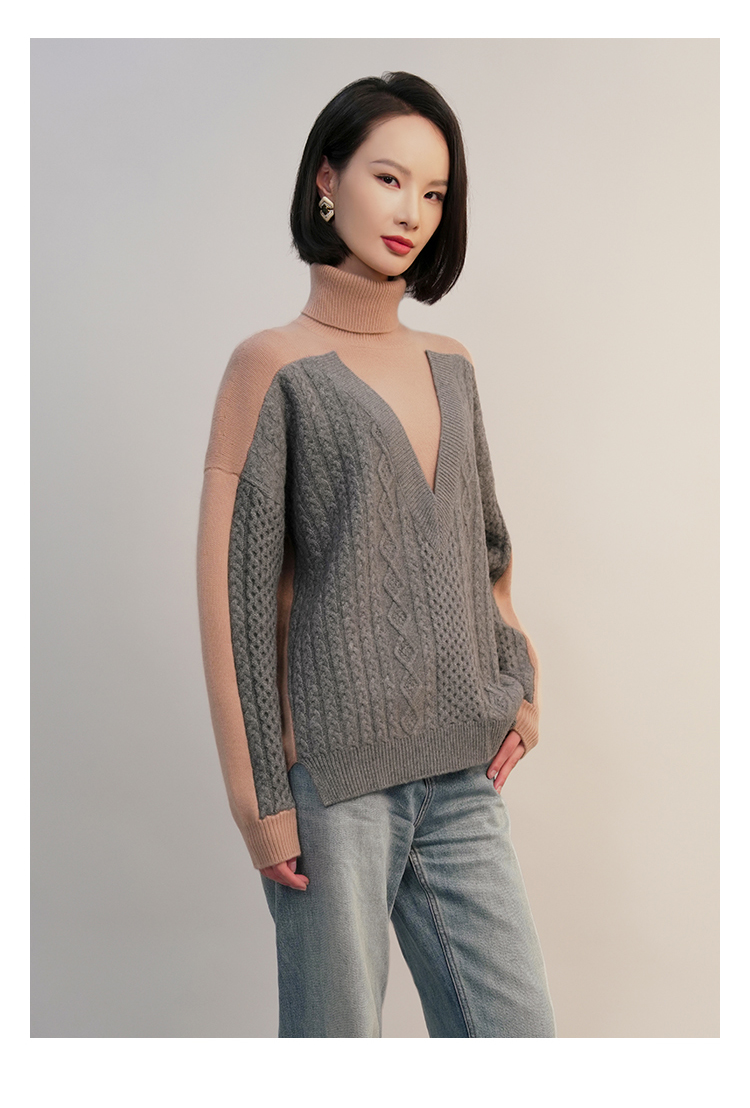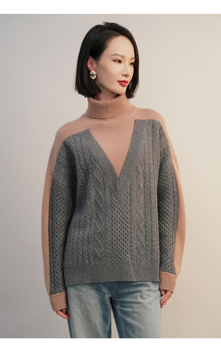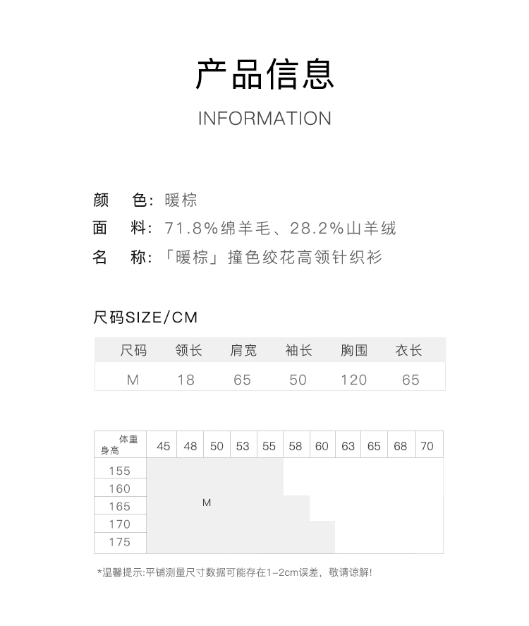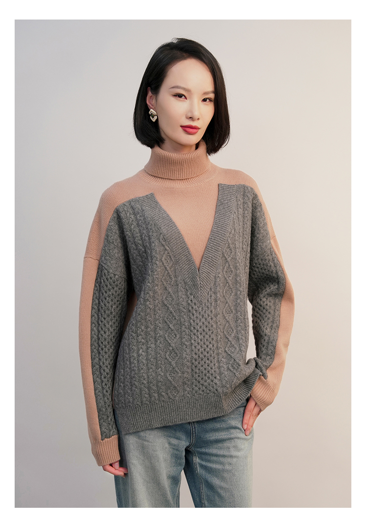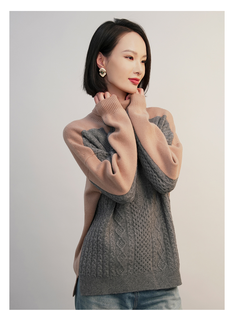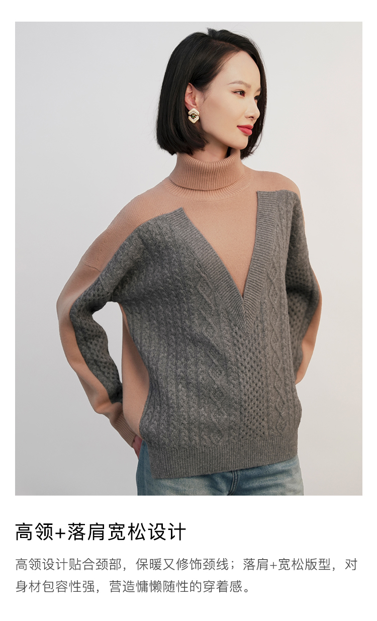 郭培成衣RSG2025秋冬新款毛衣暖棕撞色绞花高领保暖针织衫中长款