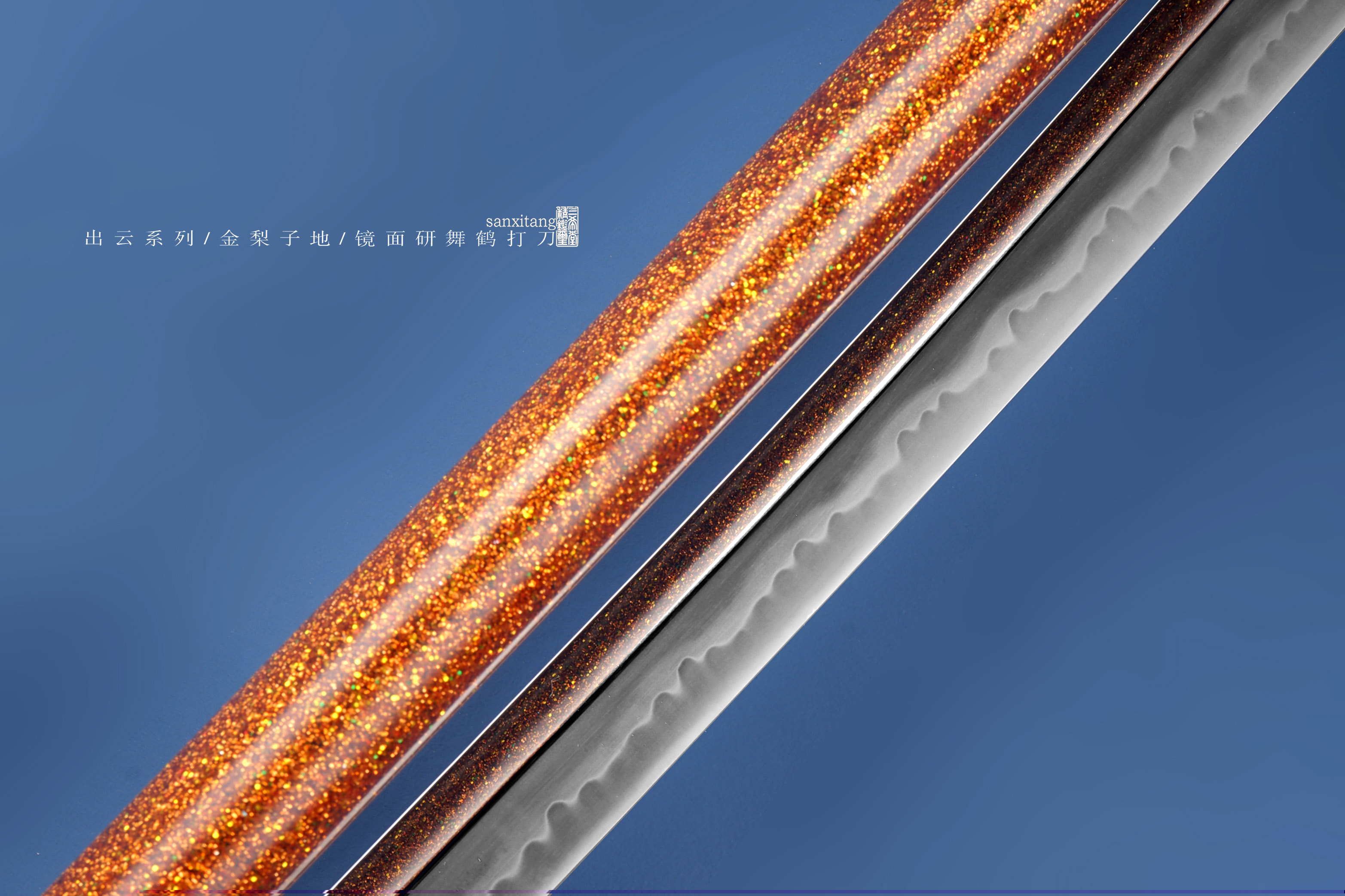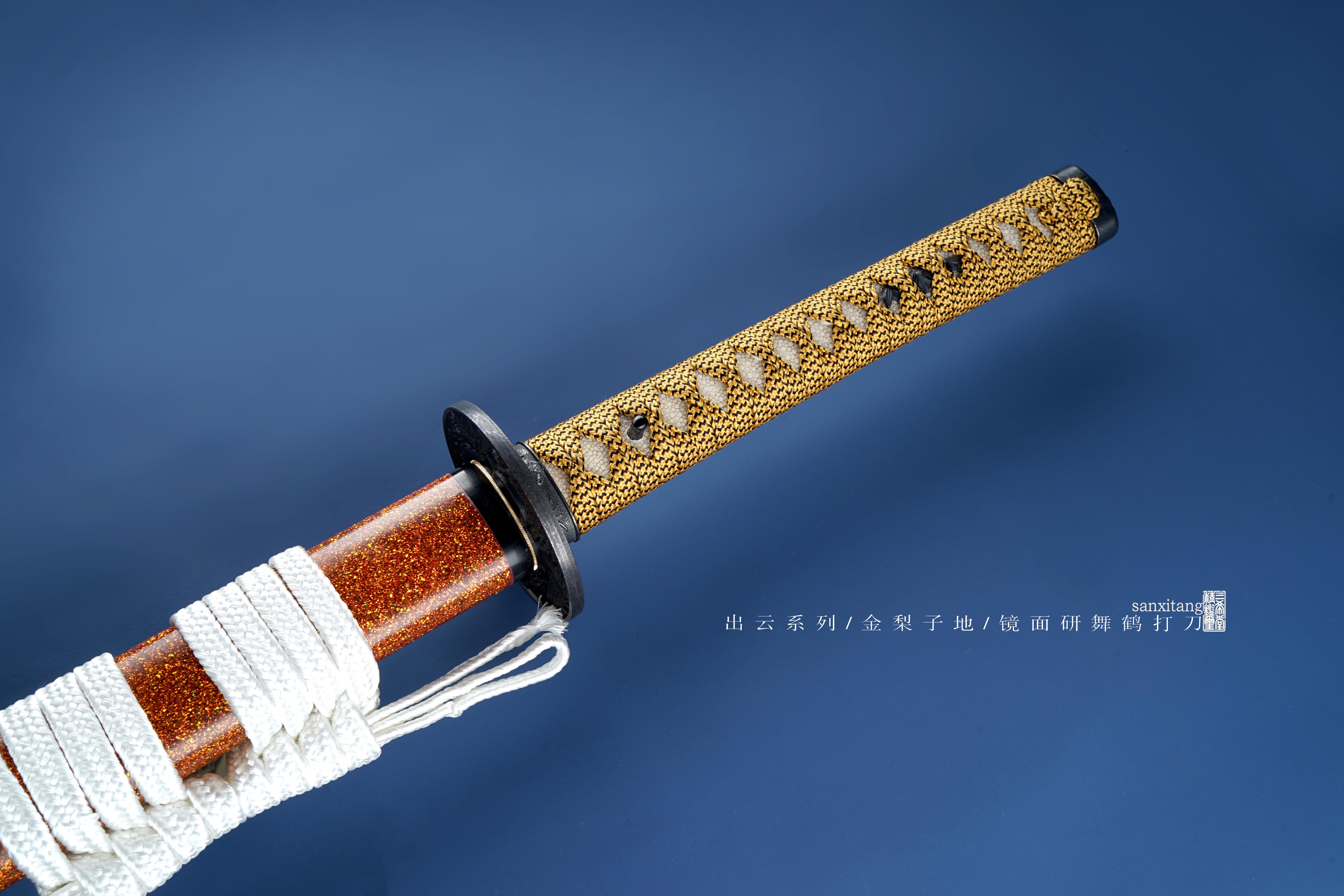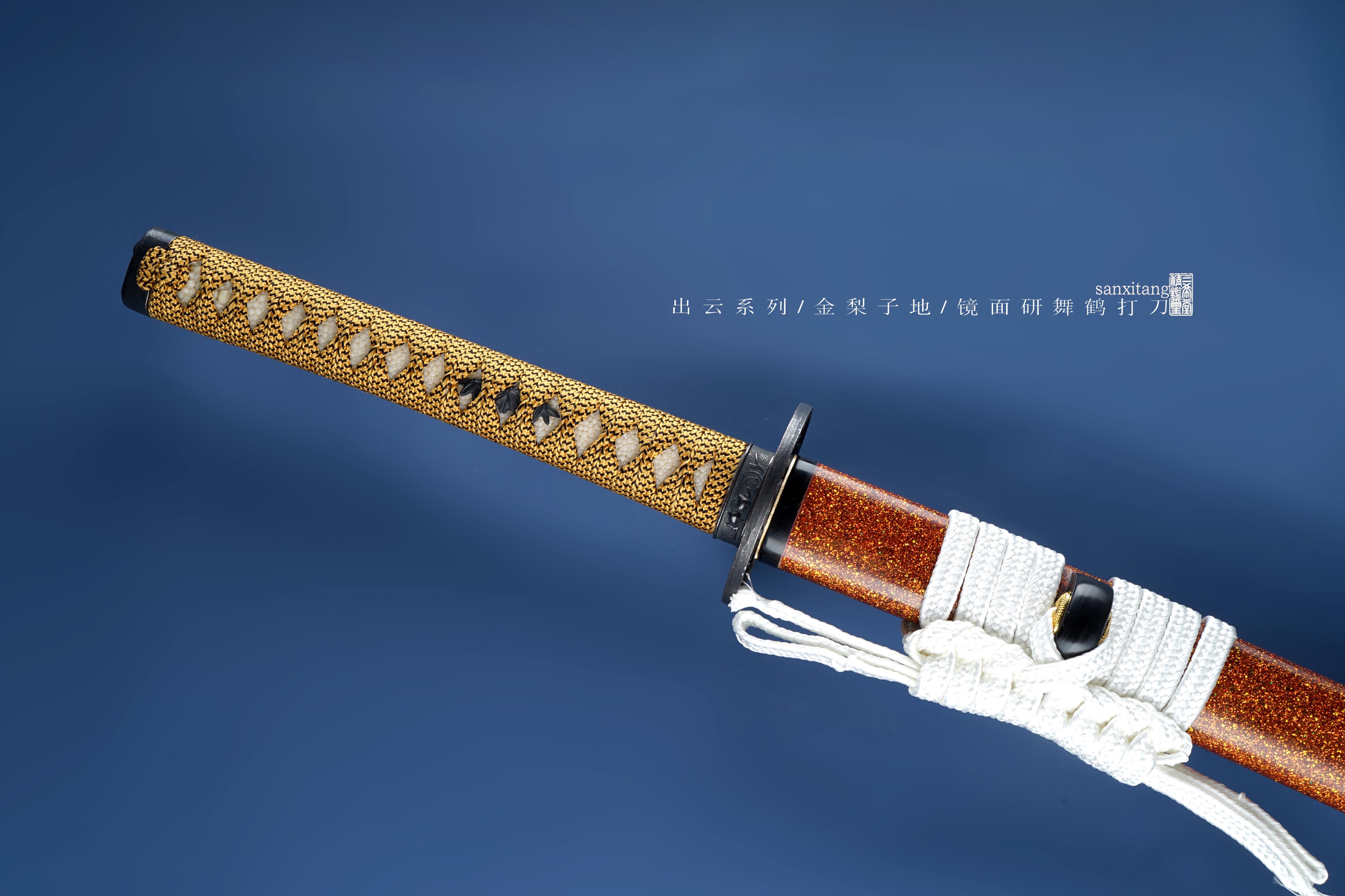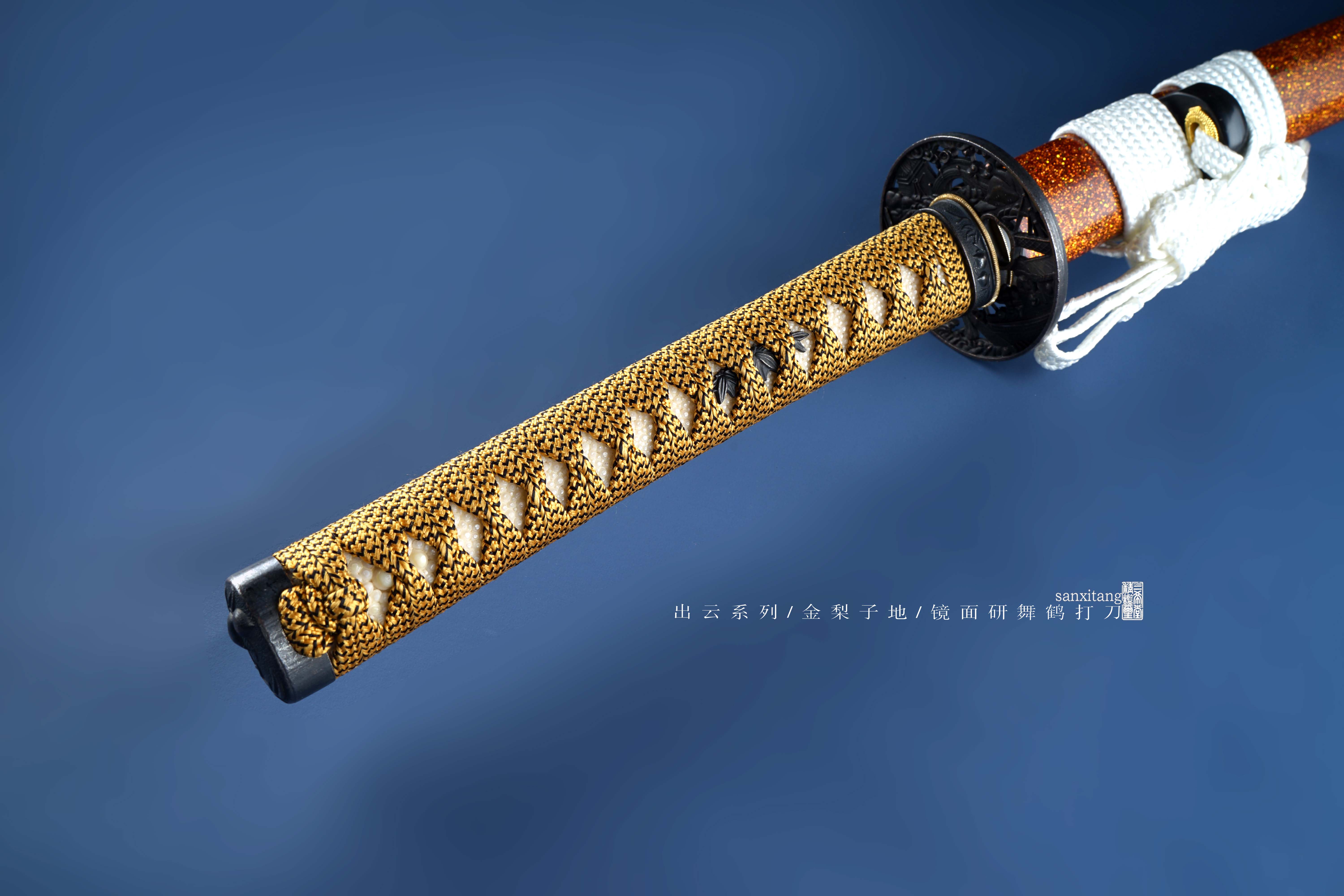 主打日本刀系列终于出来了 我们非常用心的一个系列作品 自己锻打的8000余层高碳钢 传统方法覆土烧刃 刀的弧度是淬火的时候自然形成的 手工用各种磨刀石一道一道磨出来的 点线面清晰分明 线条挺拔立体 我们核心的镜面研工艺 表面柔顺细腻 定做尺寸的鞘 和刀条匹配 镶天然牛角还原日式味道 这一步的成本能买一把入门级别的刀了 日本进口真丝柄卷+大颗粒珍珠鱼皮 按日本传统方法手工缠绳 缠一只柄要几个小时 非常紧防滑性能很好 质感相当不错 日本天然金梨子地大漆鞘 档次高 这只作品可以说是现代美学和传统工艺的完美结合 我自己很满意的一把好刀 非常感谢各位支持 这只作品大家自己玩或者送礼都相当合适!!