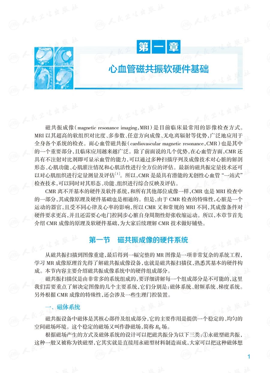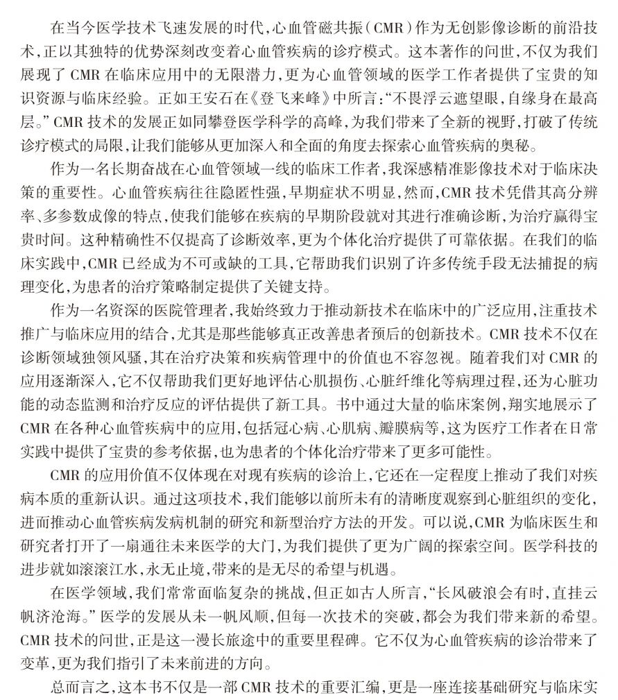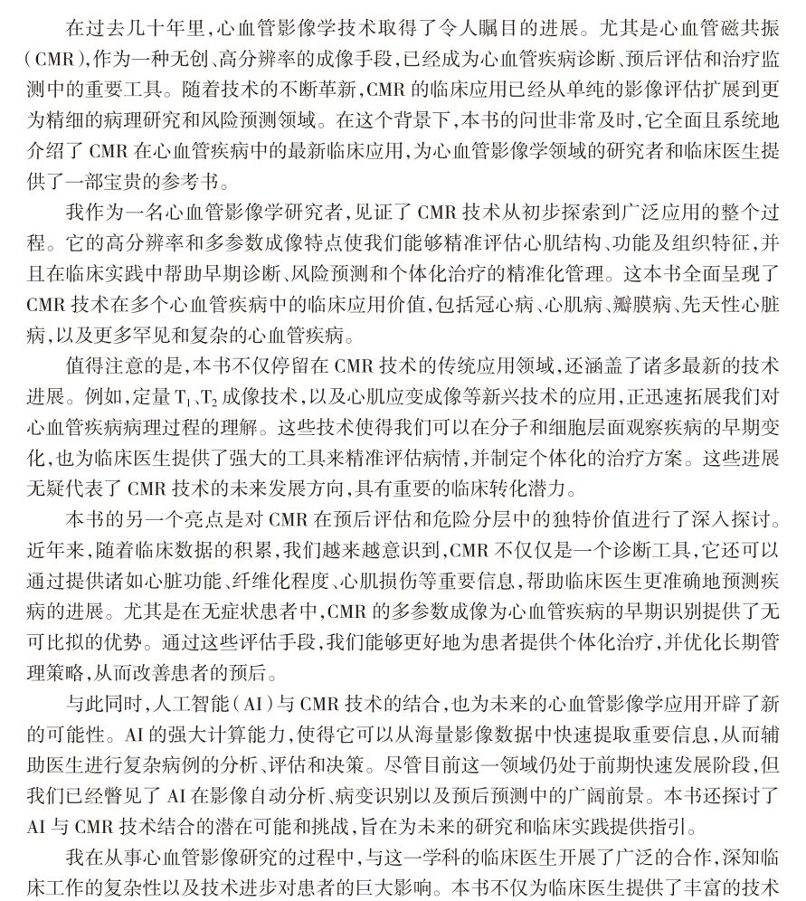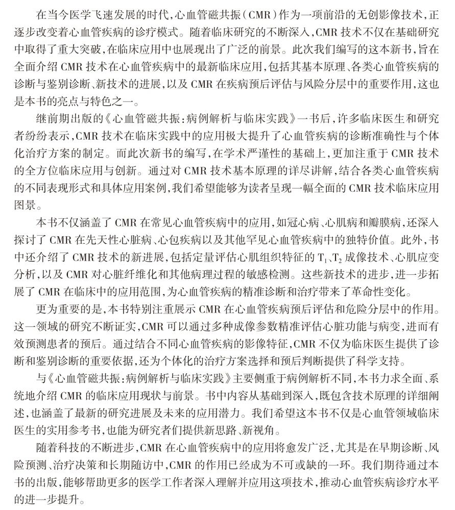 本书由人民卫生出版社出版,陆敏杰教授主编,郭应坤教授、王怡宁教授、龚良庚教授和刘辉教授担任副主编。全书共十四章,系统阐述心血管磁共振(CMR)在各类心血管疾病中的临床应用价值,涵盖从技术到临床、从现状到前沿、从诊断到预后与危险分层。书中还聚焦了心肌应变、T1/T2 mapping、4D Flow及全自由呼吸CMR等前沿技术,为心血管医生、影像学专业人员及研究人员提供权威实用的技术参考,以推动心血管疾病诊疗进入精准影像新时代。