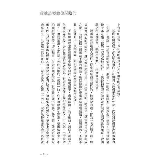 職場不僅僅是幾間辦公室,一群泡茶喝水的人,而且是一個大的生態場,足以讓你窺一孔而知全豹,從中洞明世事,參透人情。如果不懂得變化,多為自己準備幾張面具,做幾個應對的備份,就會臨陣失機,讓人搶了先,出了風頭。而且我們就算為自己留退路,也不可能只備一條「華容道」。手中拿著屠龍刀,懷裡穿著金絲甲,再扛一柄威力無比的霸王槍,能攻能守,進退有據,那才能從容不迫地應對公司的各種突發情況。
