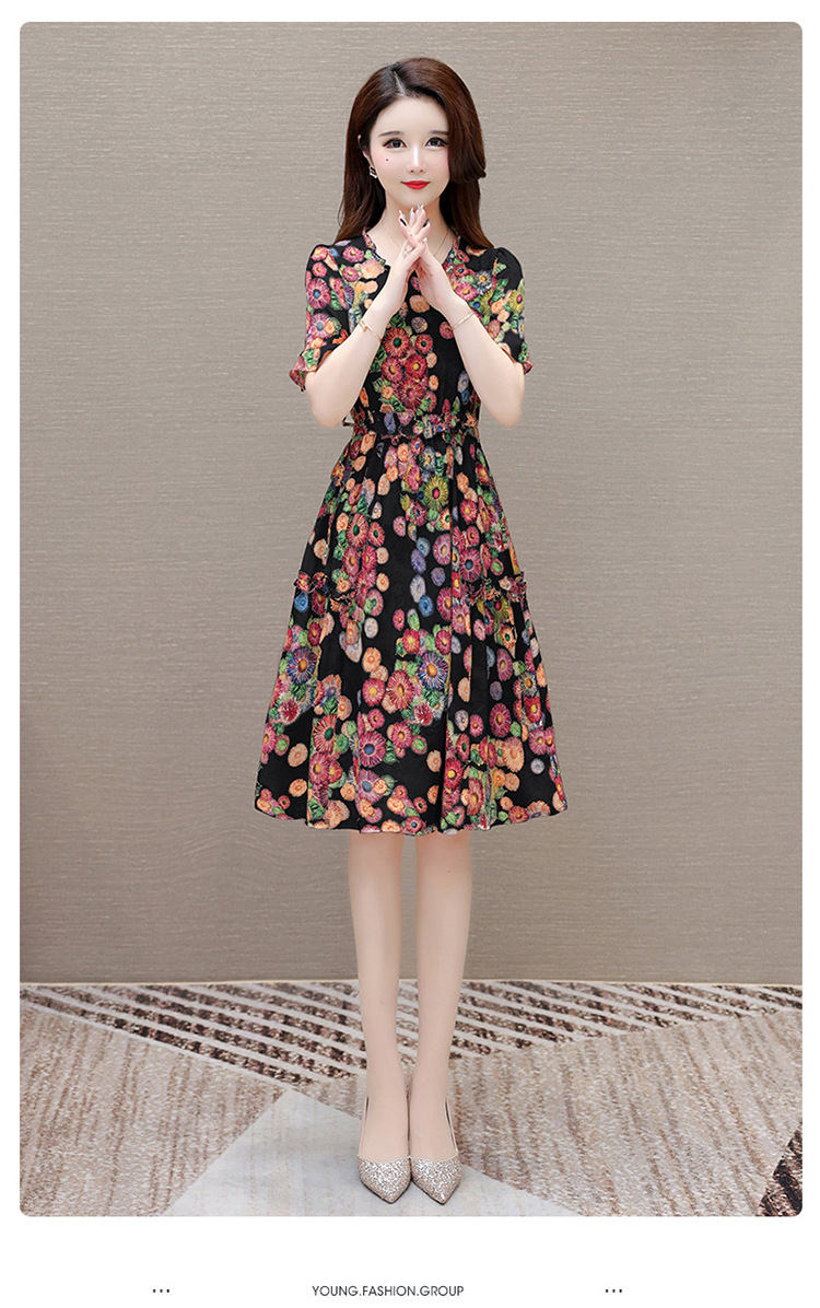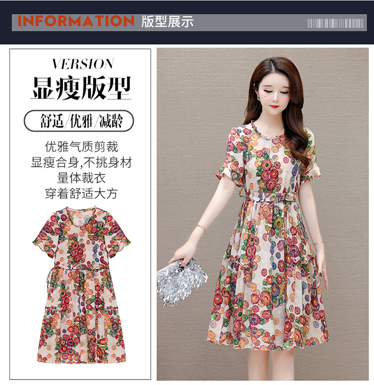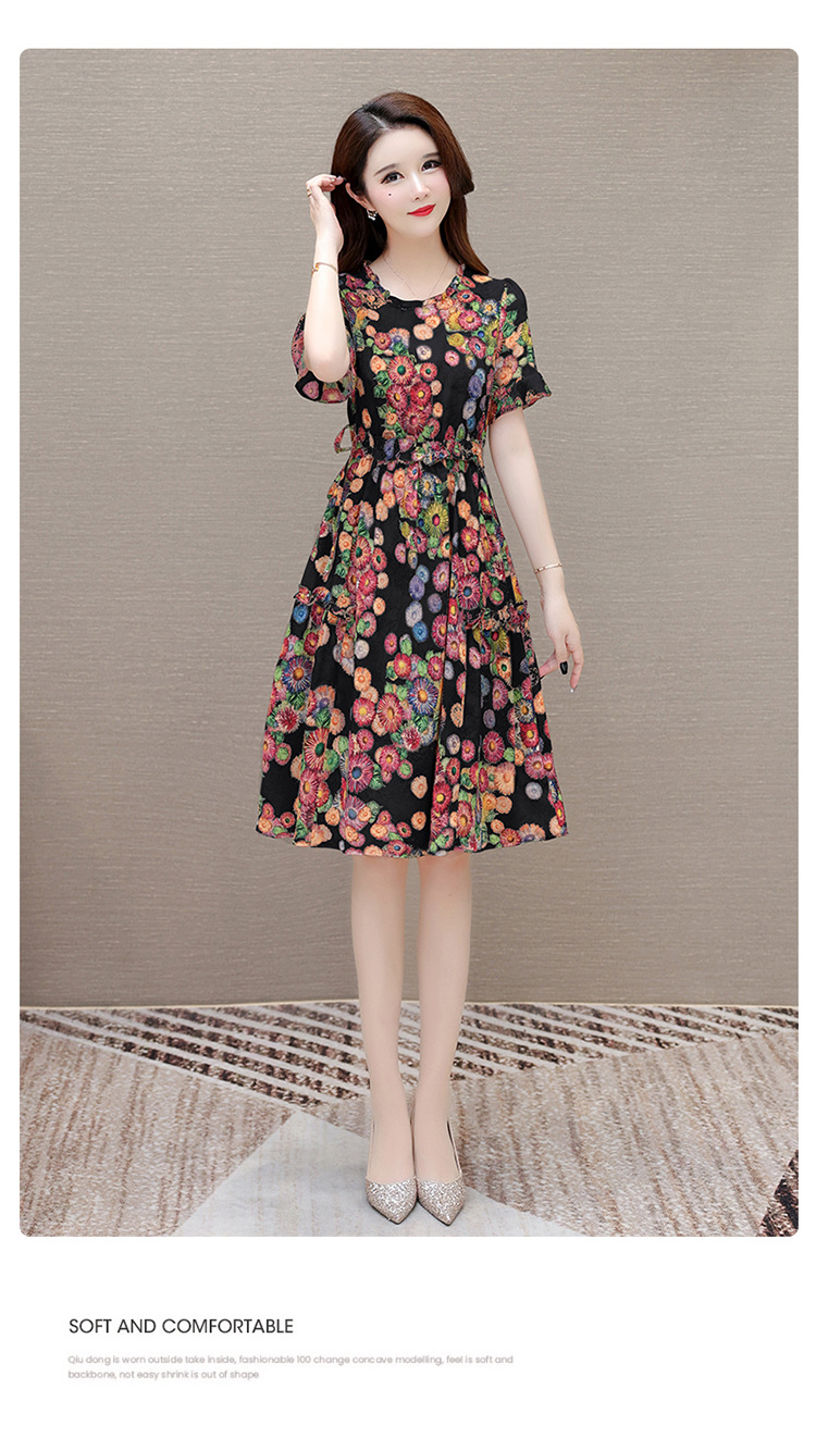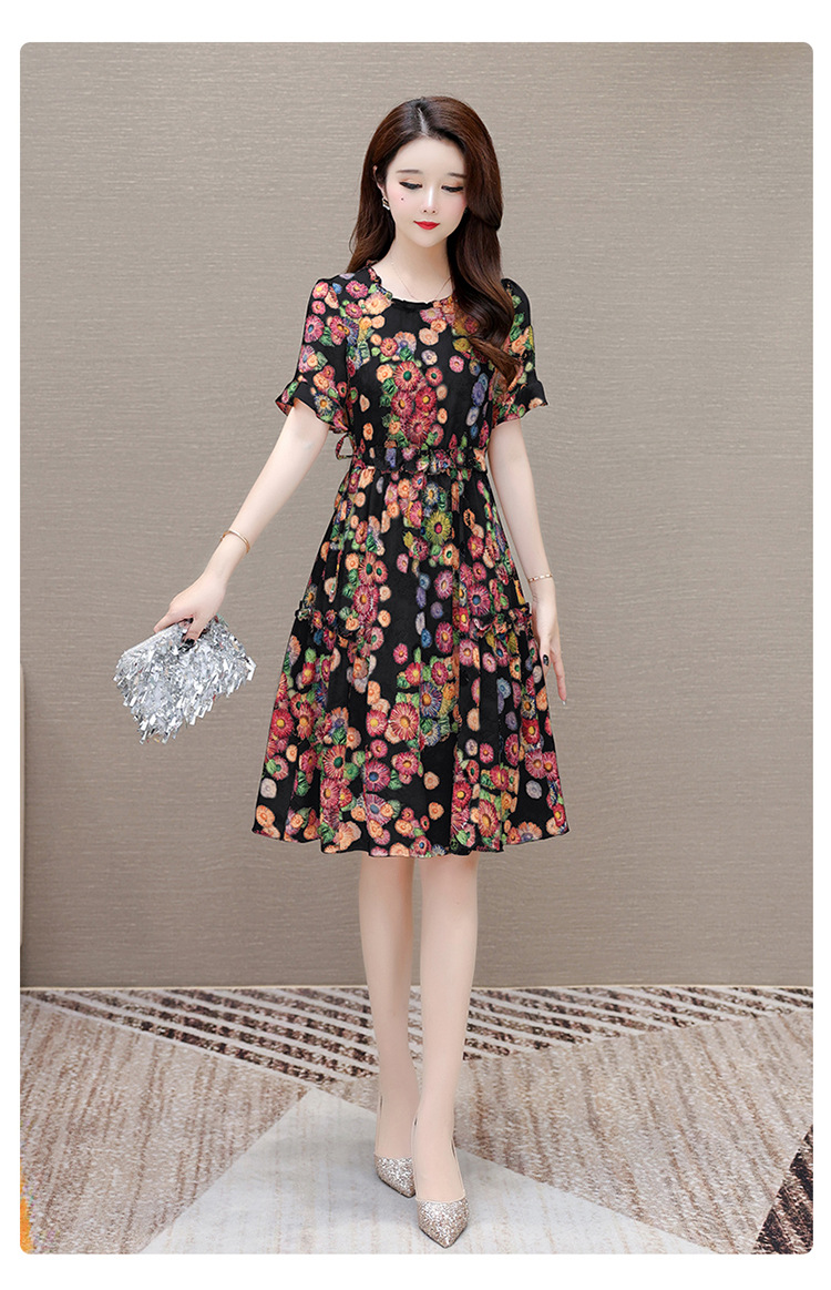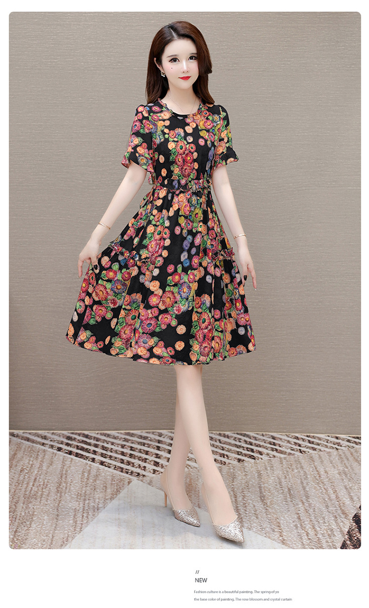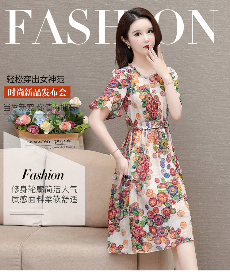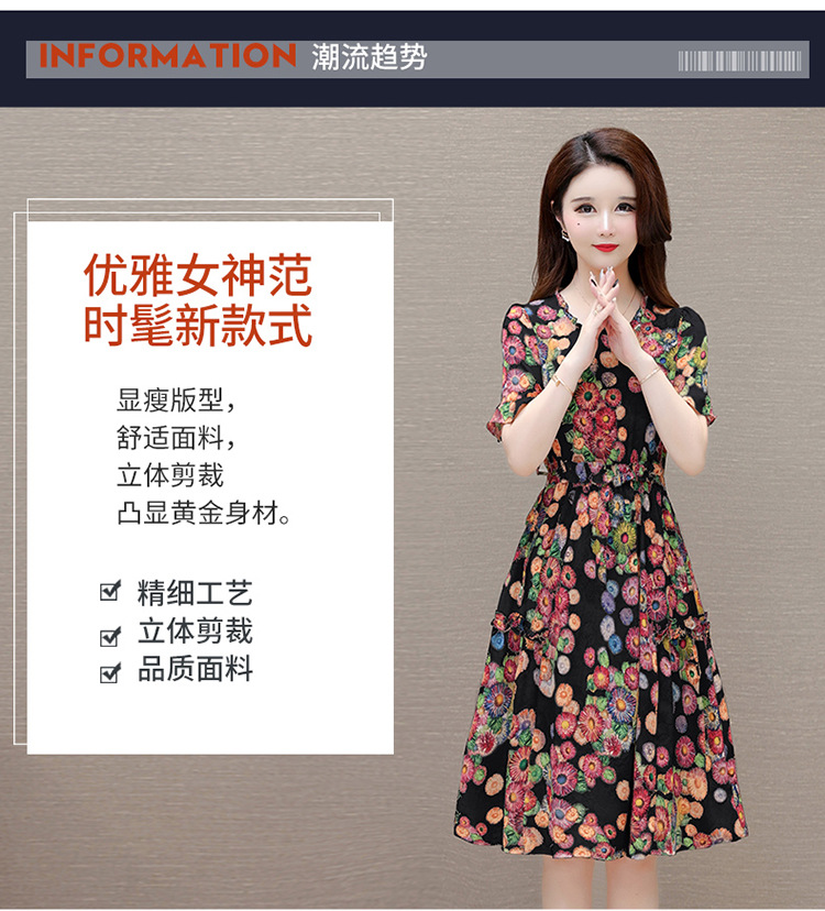 短袖圆领印花连衣裙,洋气收腰中长款A字裙QYM- JJ-HB246623-Y