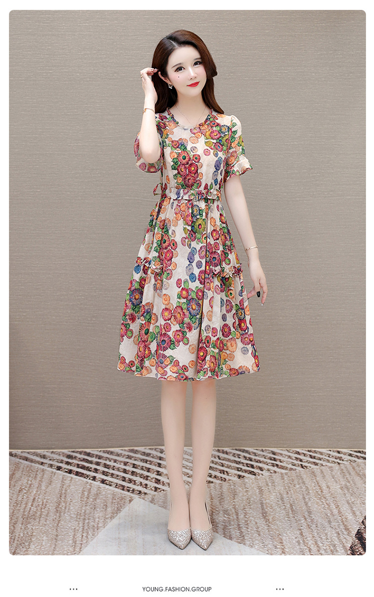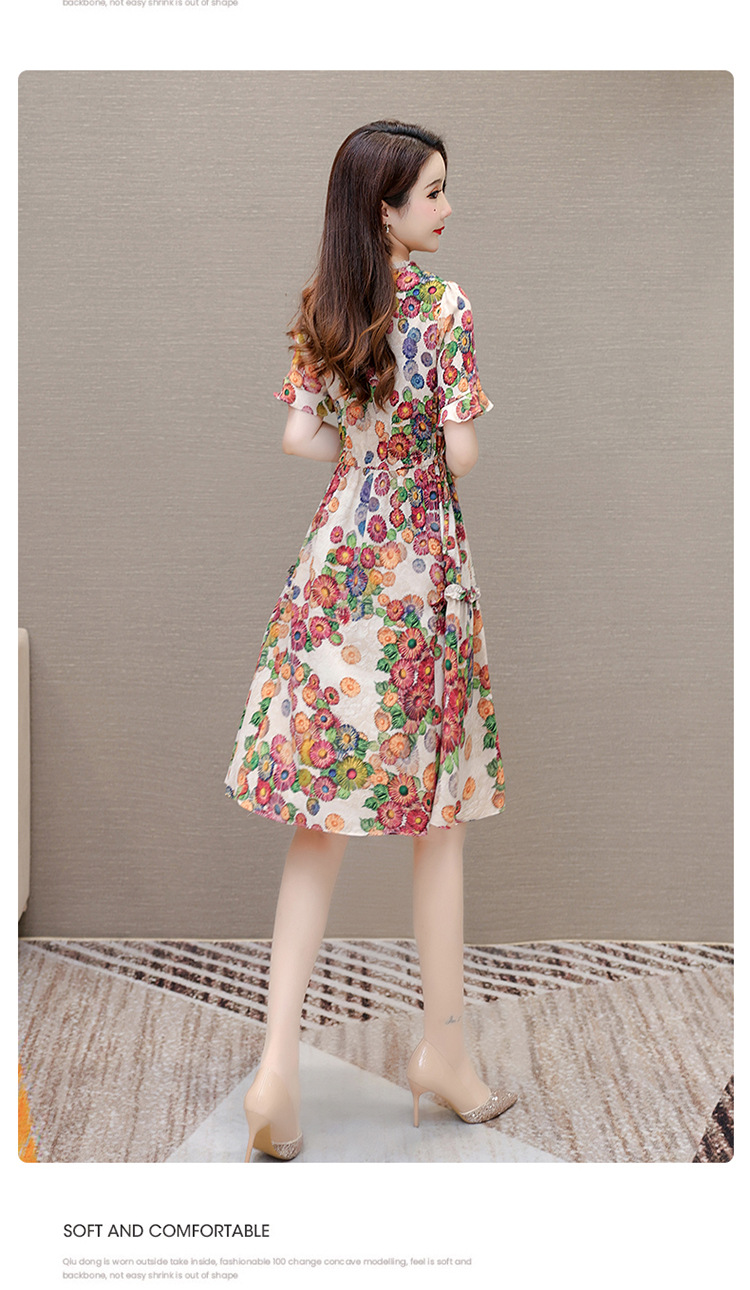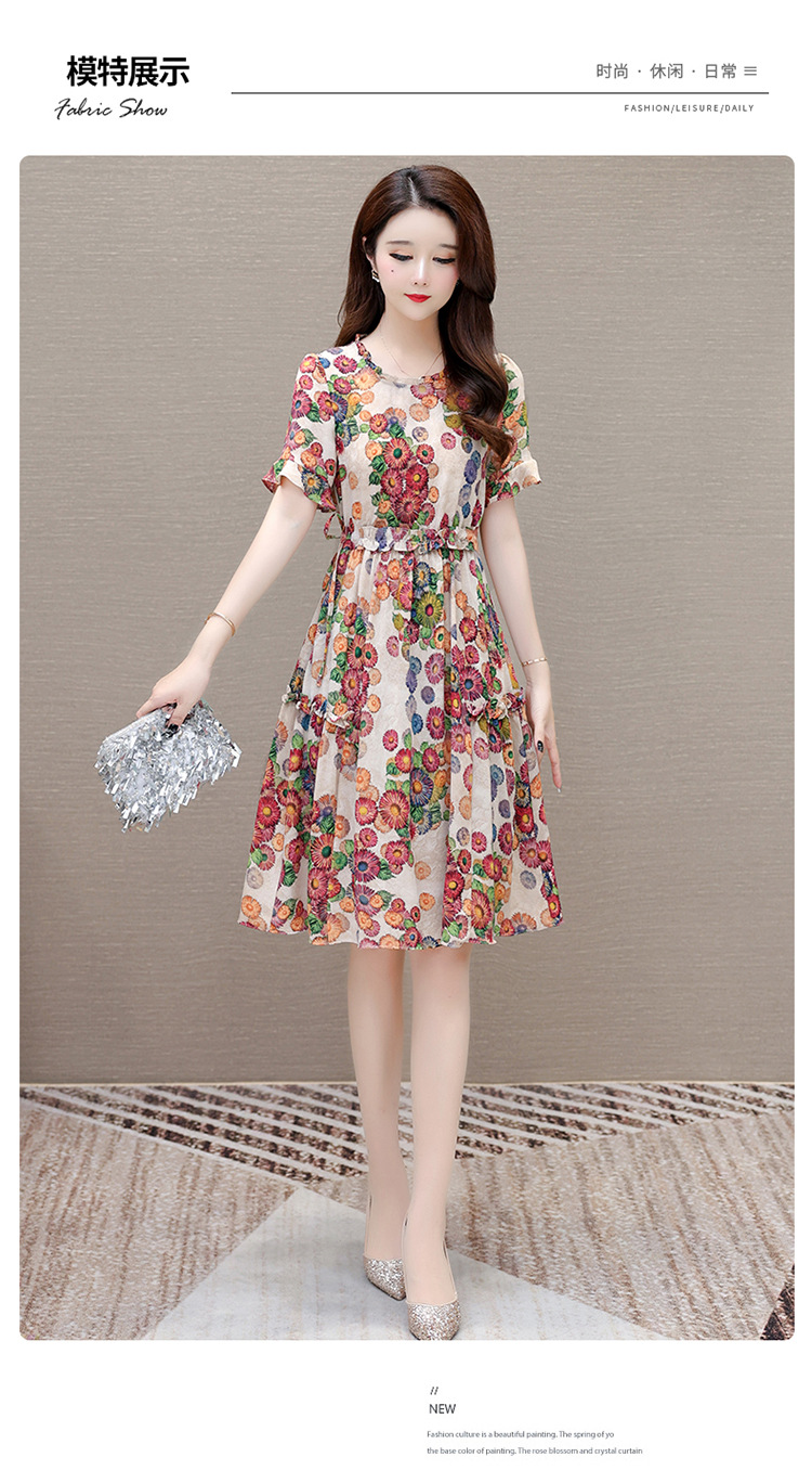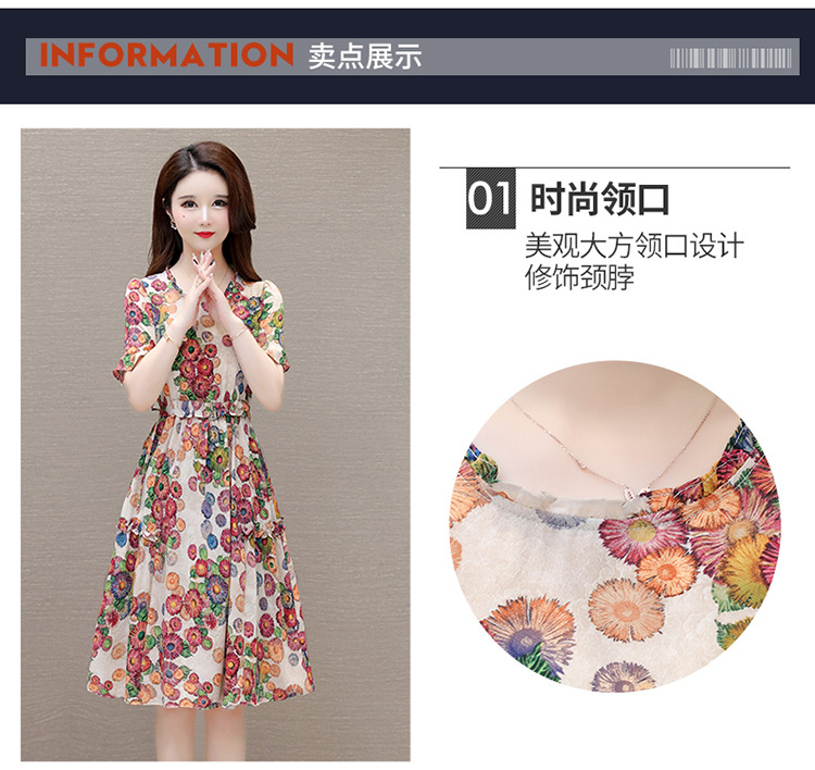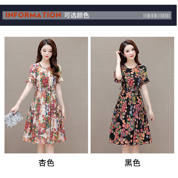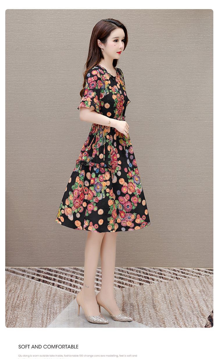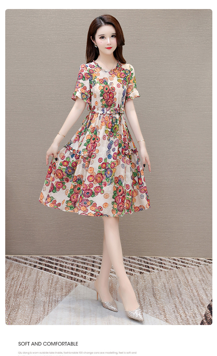 短袖圆领印花连衣裙,洋气收腰中长款A字裙QYM- JJ-HB246623-Y
