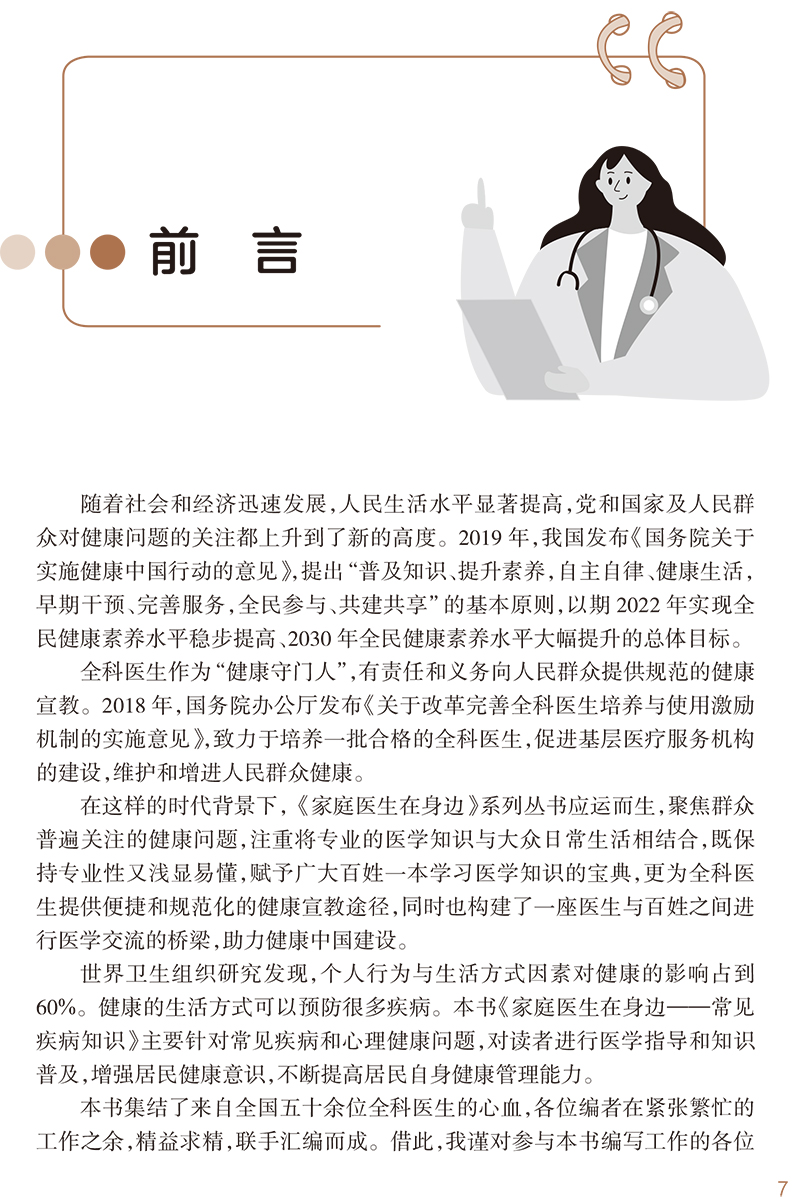 本丛书不仅适用于家庭医生向居民开展健康教育工作时使用;也适合于居民自行翻阅,了解健康知识。在家庭医生签约服务开展如火如荼的今天,本套丛书有助于提高医患双方的健康素养,为健康中国建设作出贡献。本书旨在为家庭医生提供便捷及规范化健康宣教的途径,同时也面向广大居民,将枯燥的医学知识与生活结合,寓教于乐。