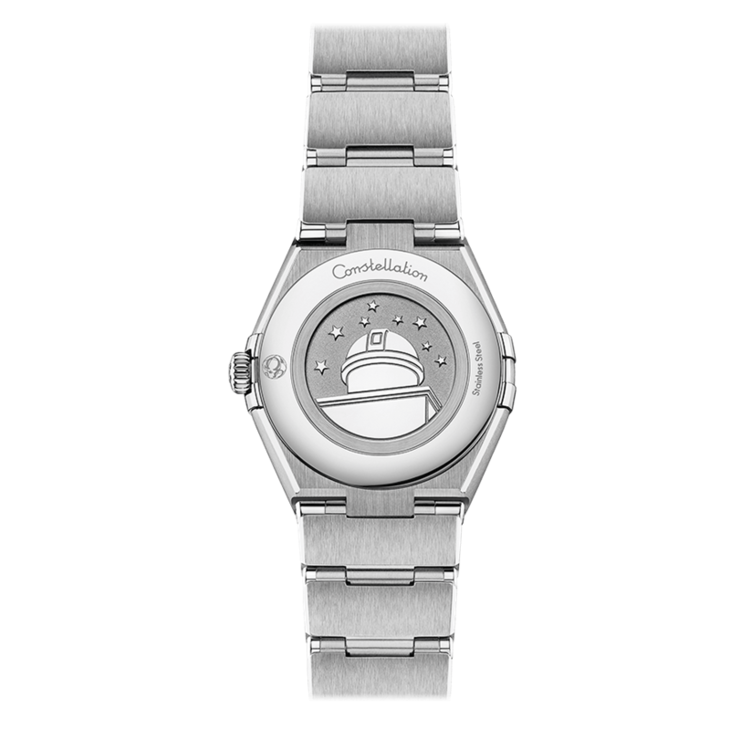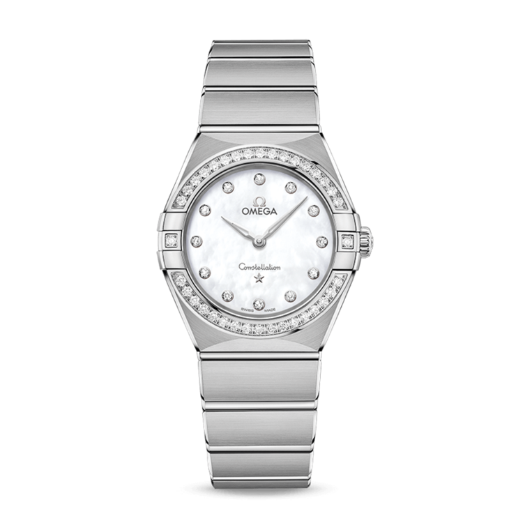 镜面材质 | 蓝宝石水晶玻璃 | 表盘 | 经典的半月形切面、“托爪”以及mono-rang表链。 精钢腕表,表圈铺镶钻石,白色珍珠母贝表盘,饰有钻石小时刻度,覆以耐磨损蓝宝石玻璃表镜。指针、欧米茄品牌标识、星座徽标以及钻石托槽亦以白色18K金打造而成。 密底 |