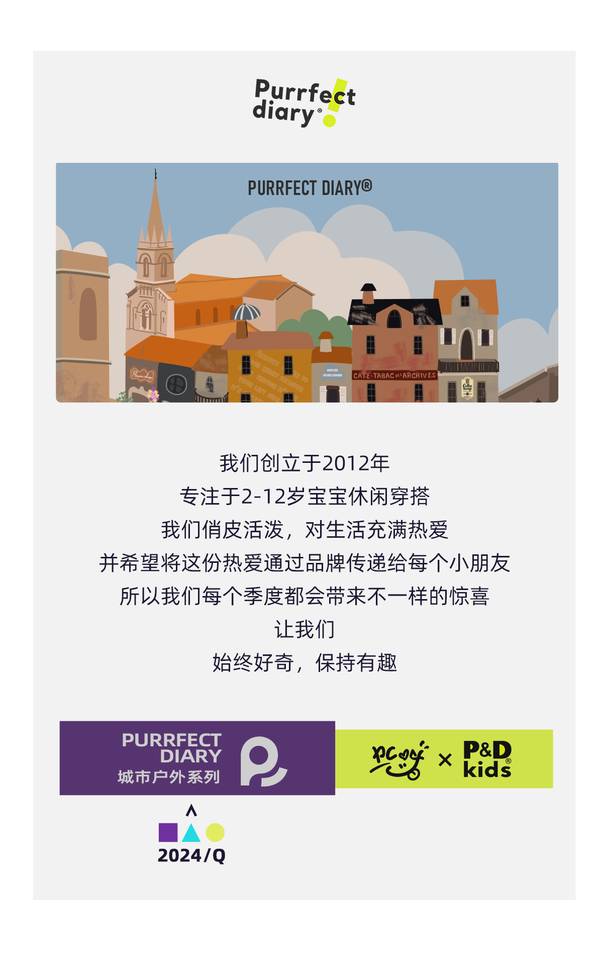 Purrfect-Diary专注于贴近自然随性的穿着概念,轻奢平价的童装文化传播,在产品设计上更加注重婴童穿着的舒适性、安全性、更出众的国际化品牌,将欧美的育婴文化在中国进行深入的传播与推广。