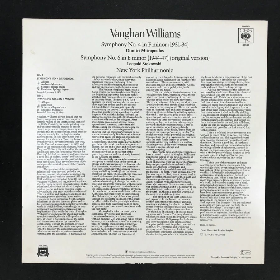 LP黑胶唱片 拉尔夫·沃恩·威廉斯《F小调第4号交响曲》《E小调第6号交响曲》 纽约爱乐乐团 指挥家:米特洛布洛斯/莱奥厂牌:CBS Classics