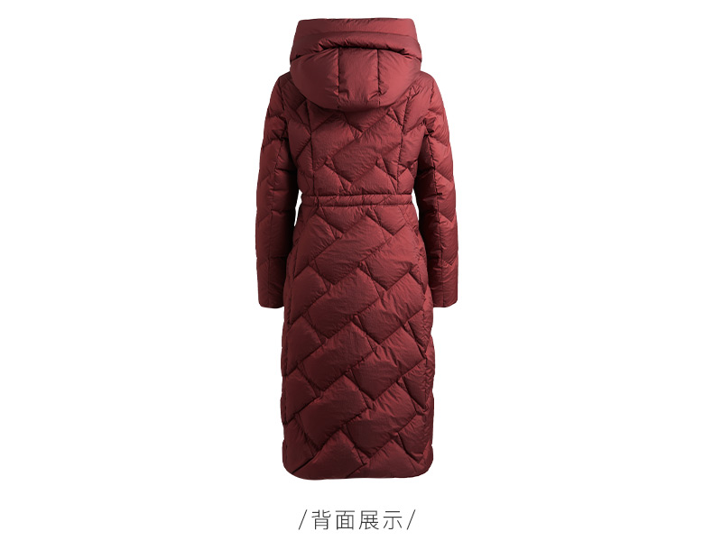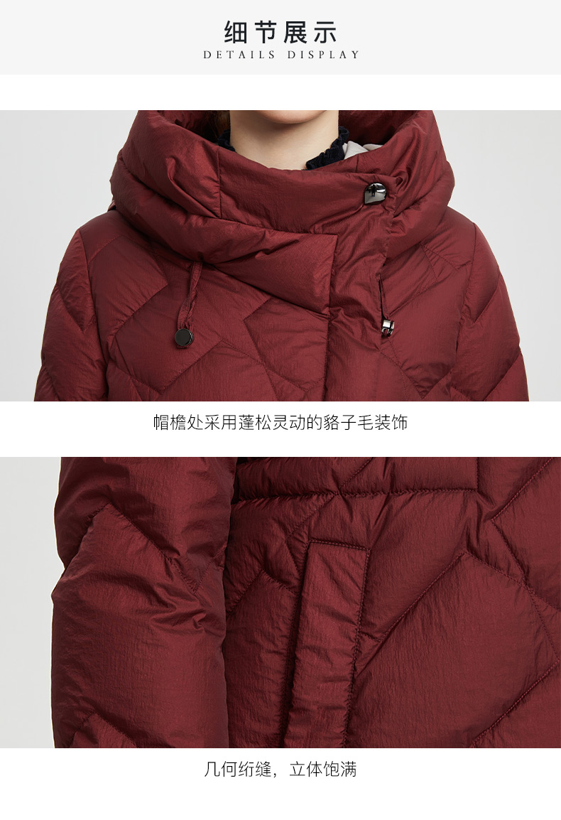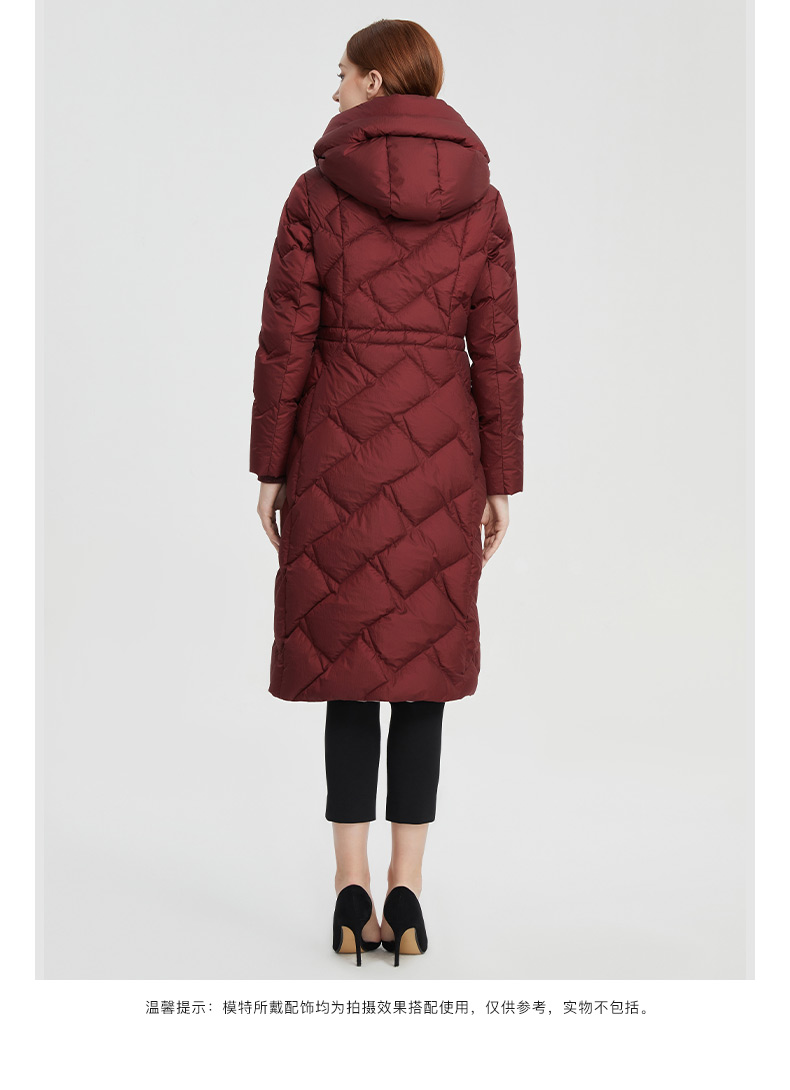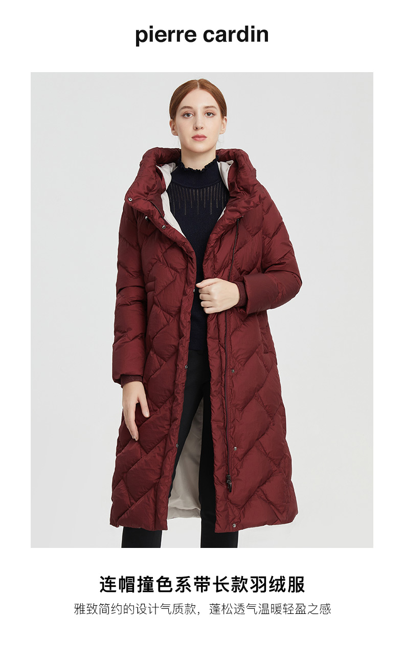 皮尔卡丹女装时尚复古红保暖通勤收腰连帽羽绒服P1489Y1411T0