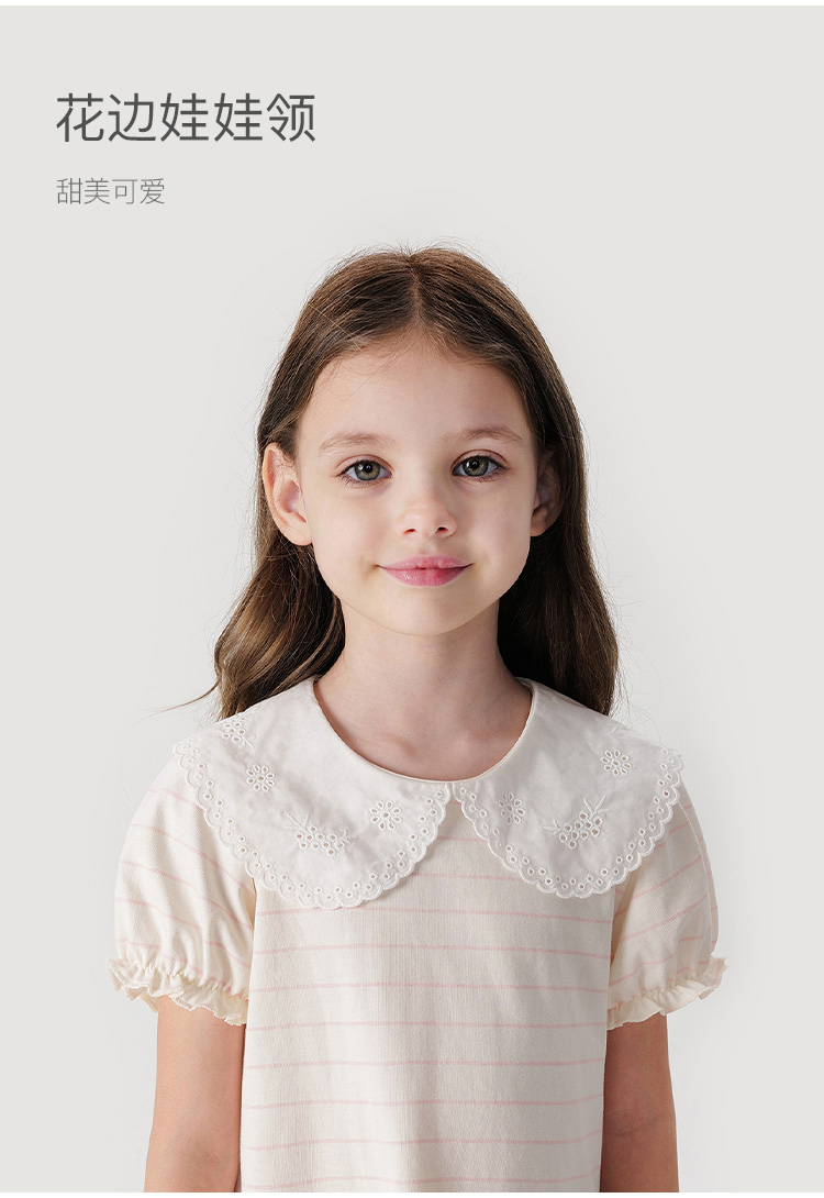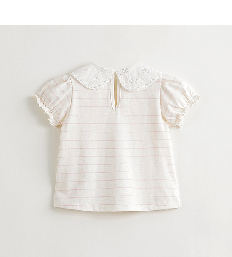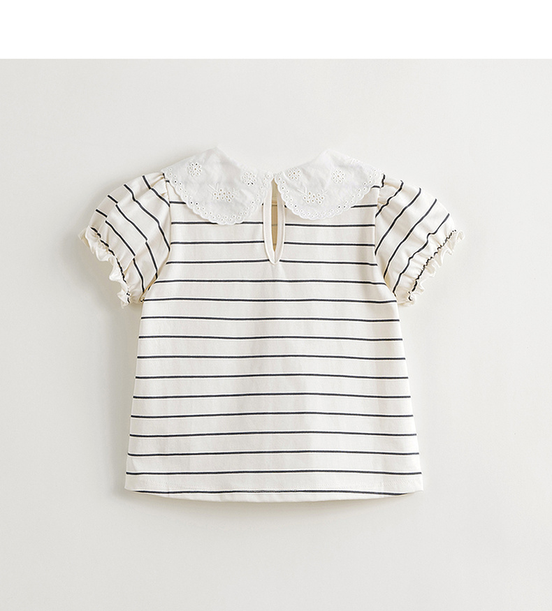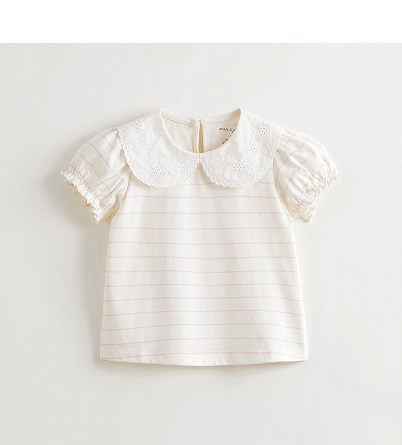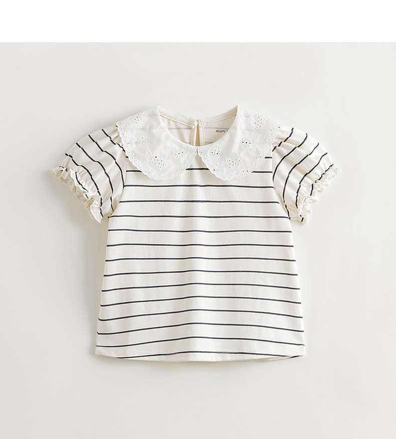 马克珍妮女童花边领泡泡袖条纹短袖T恤 儿童上衣夏装新款240786