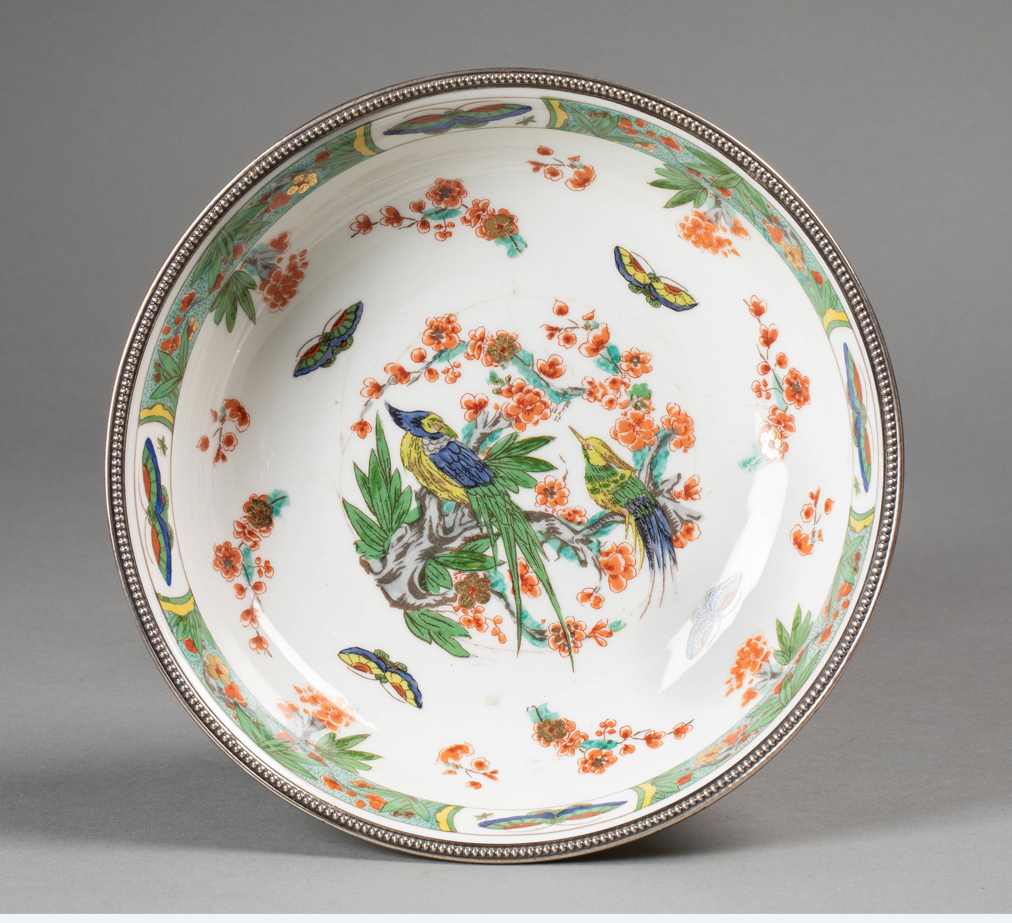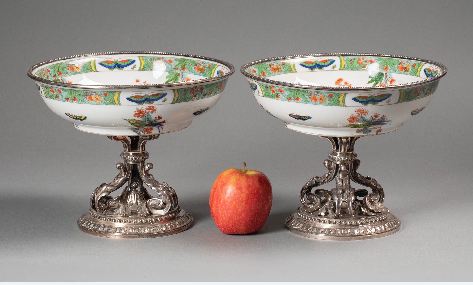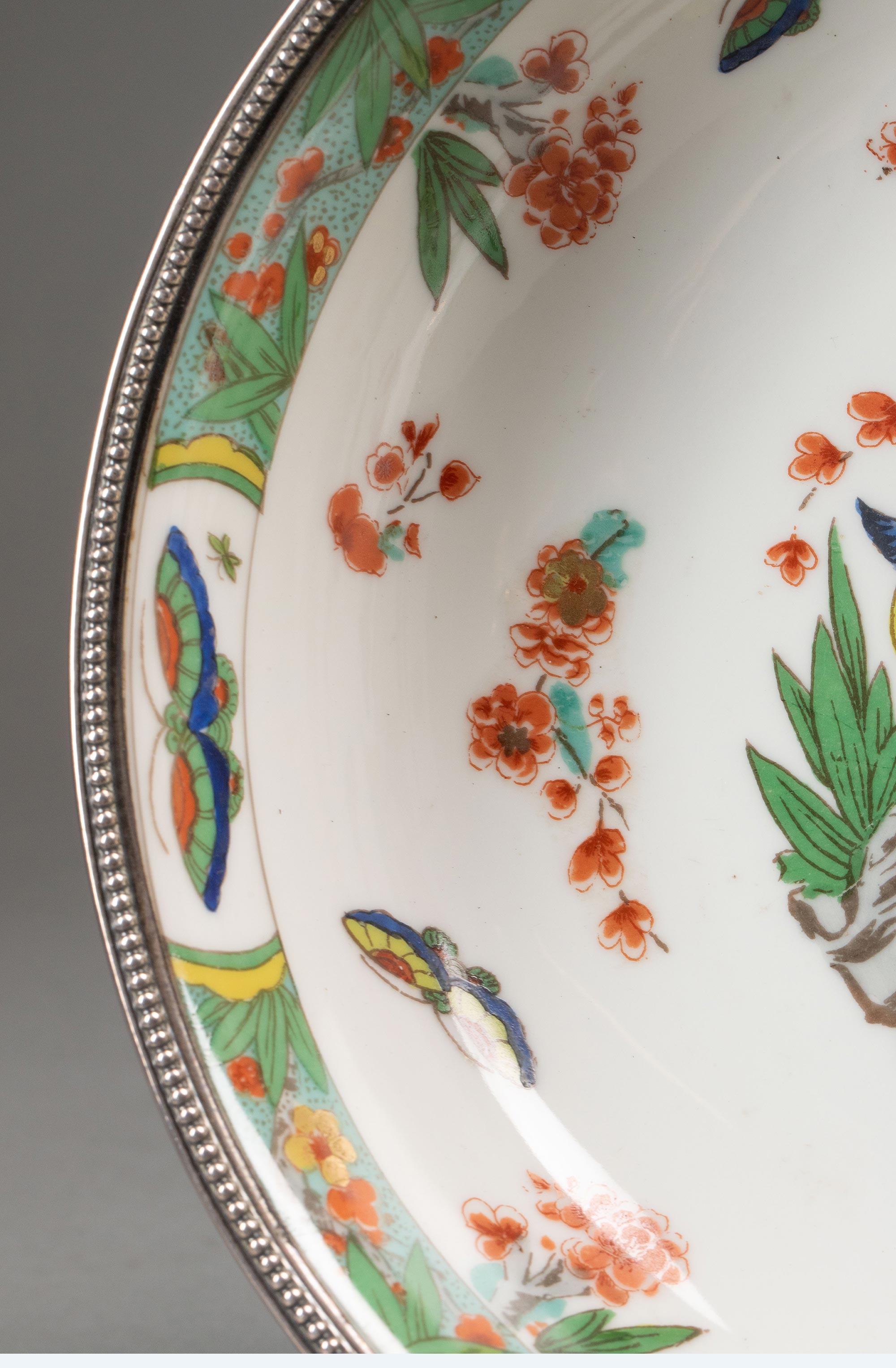 20世纪法国著名金银器工坊ODIOT出品古典卷叶纹纯银精雕装饰繁花蝶雀主题中国粉彩瓷碗一对
