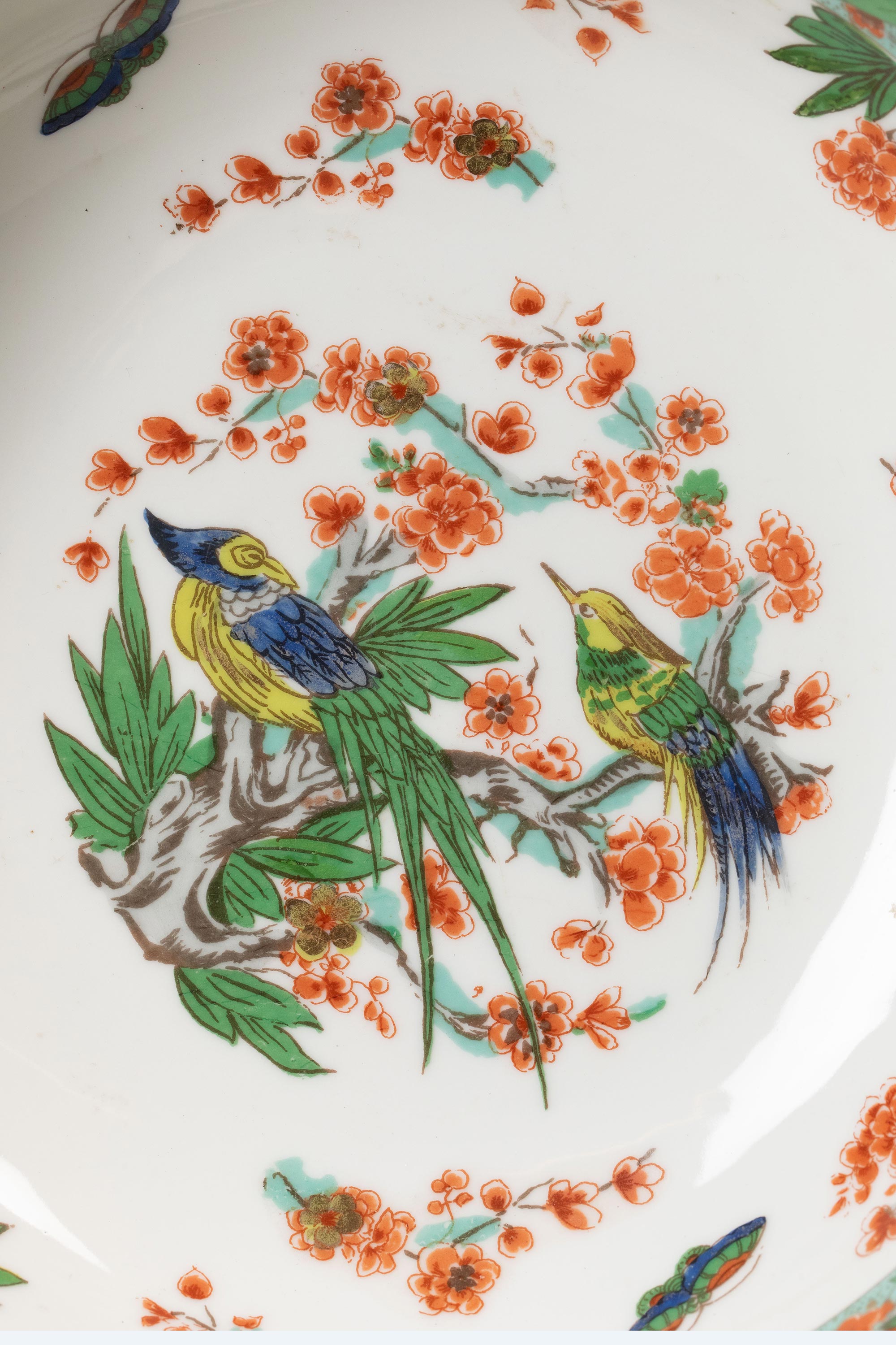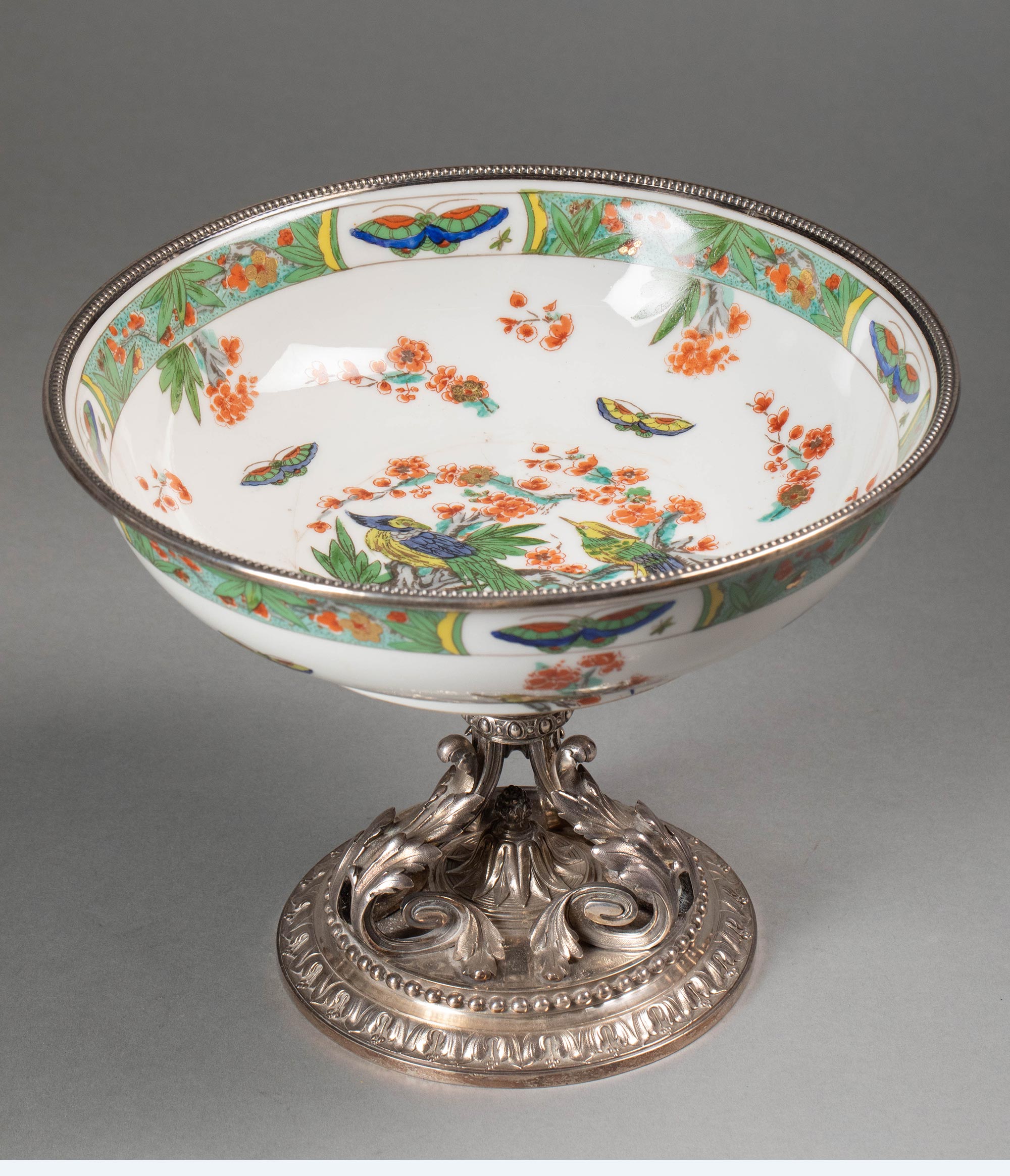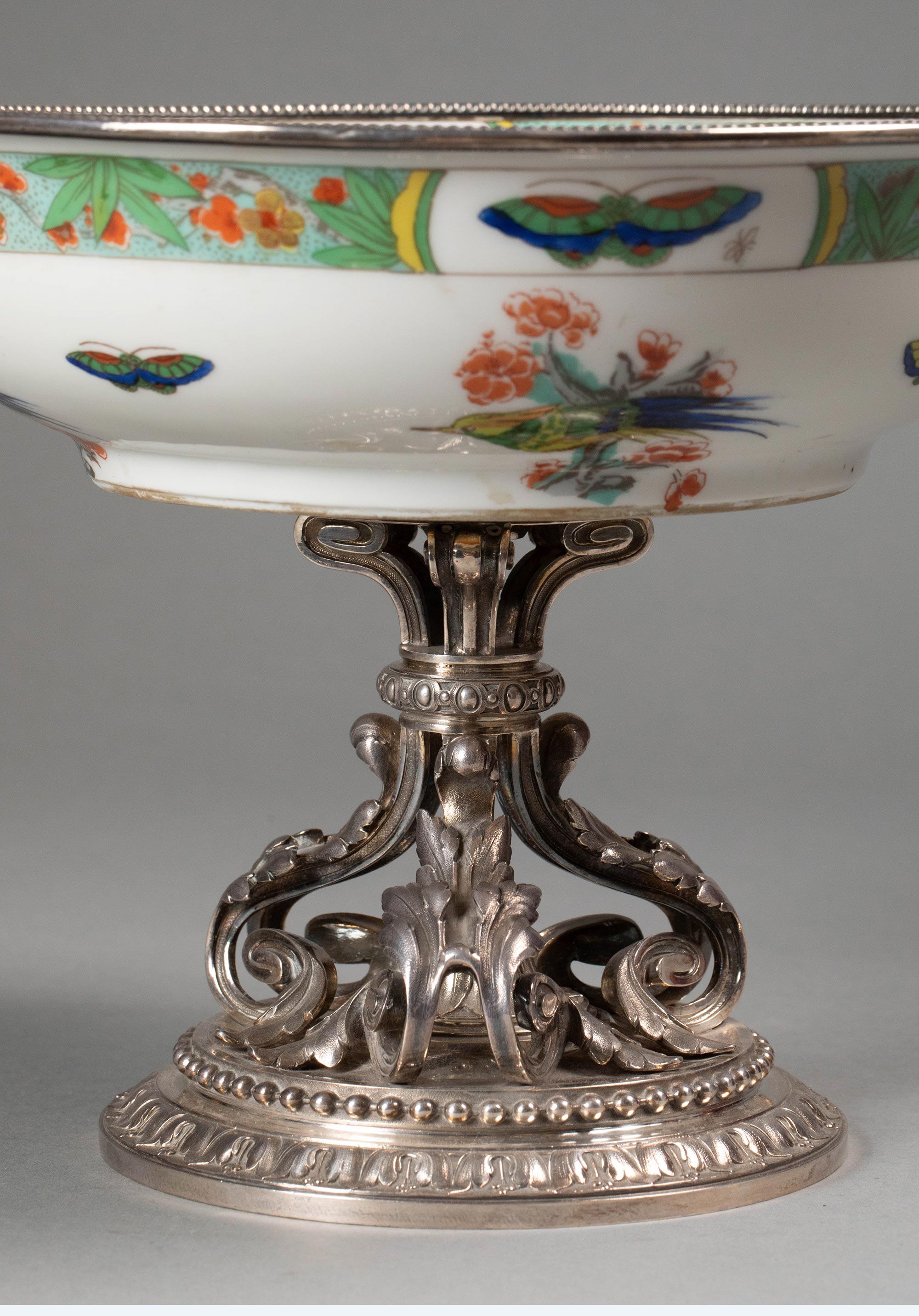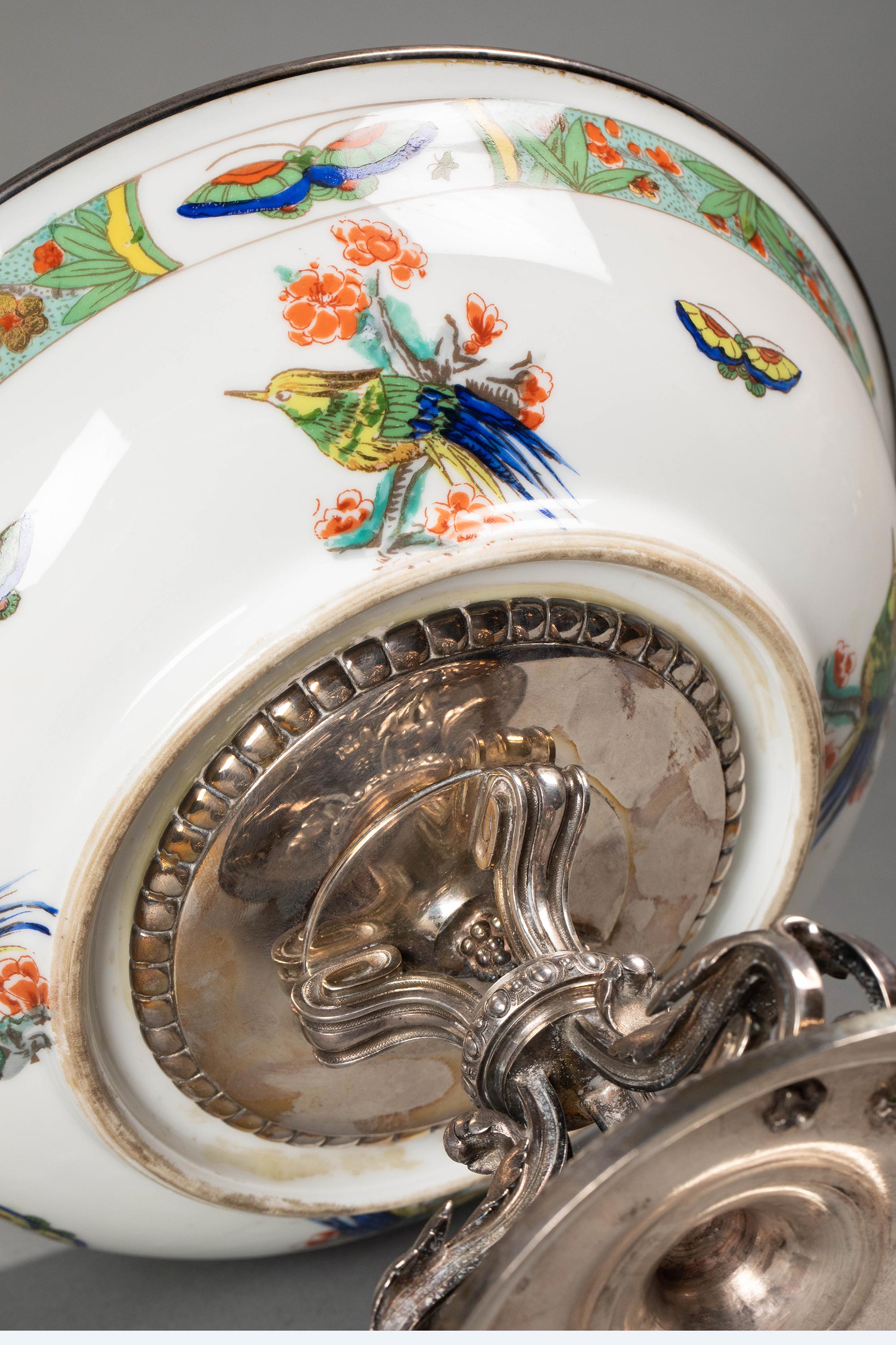 20世纪法国著名金银器工坊ODIOT出品古典卷叶纹纯银精雕装饰繁花蝶雀主题中国粉彩瓷碗一对