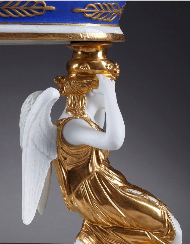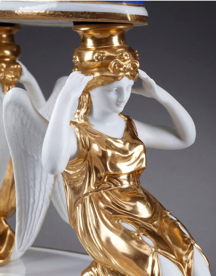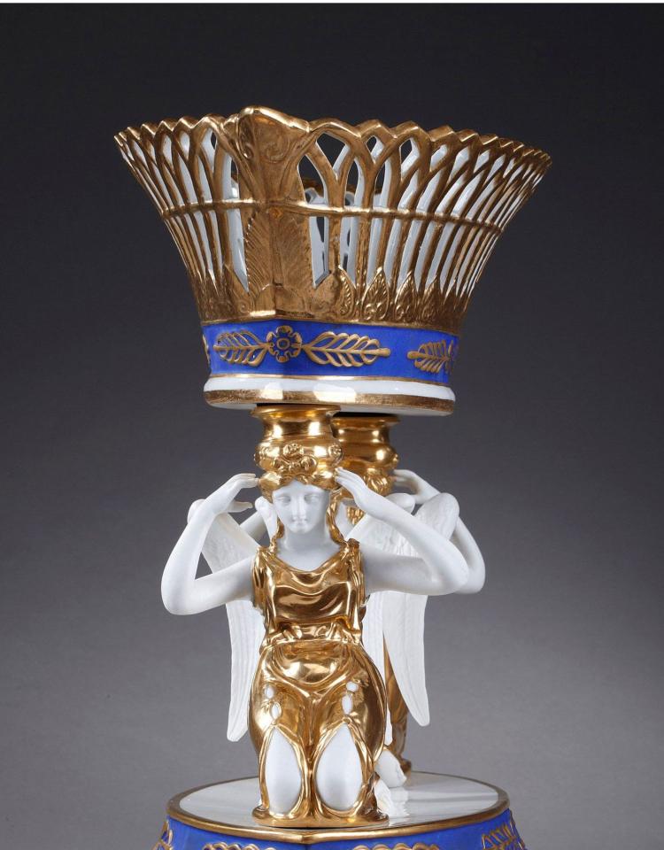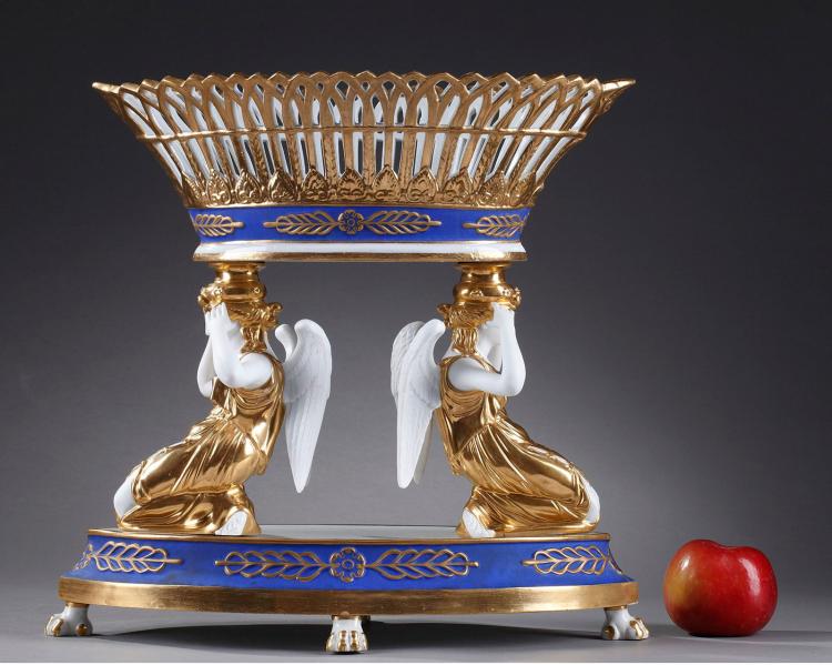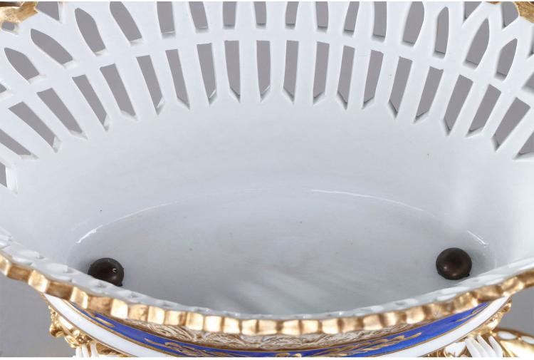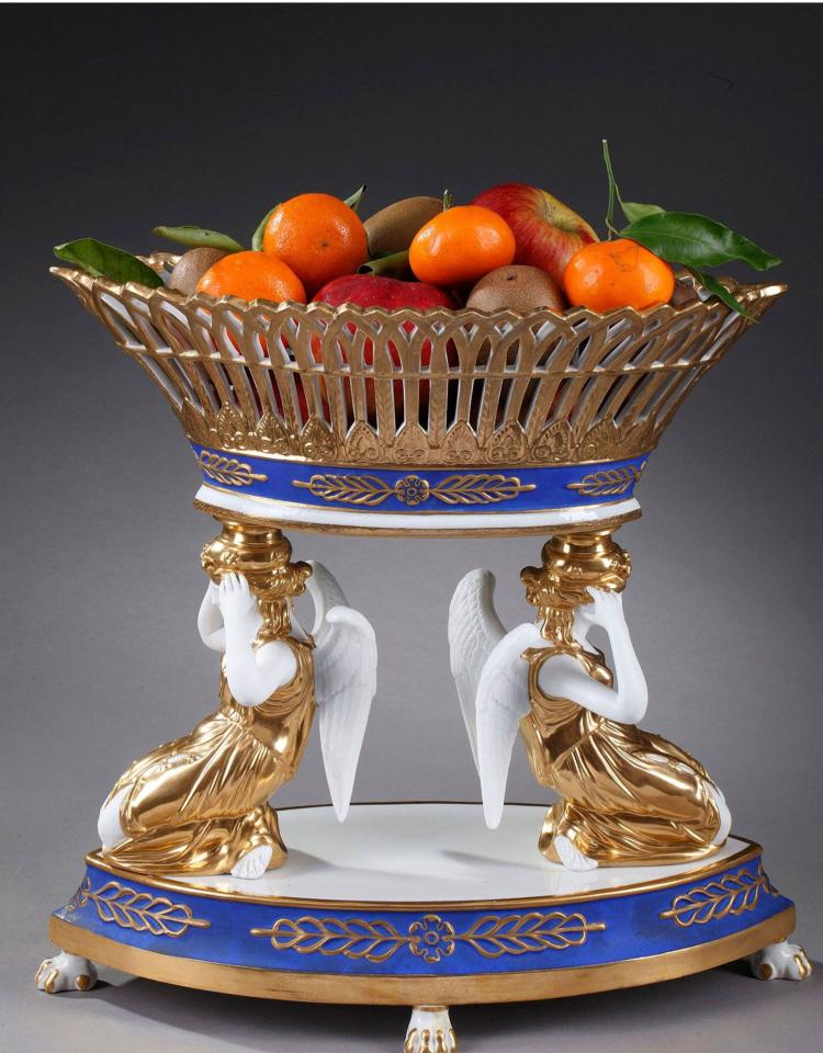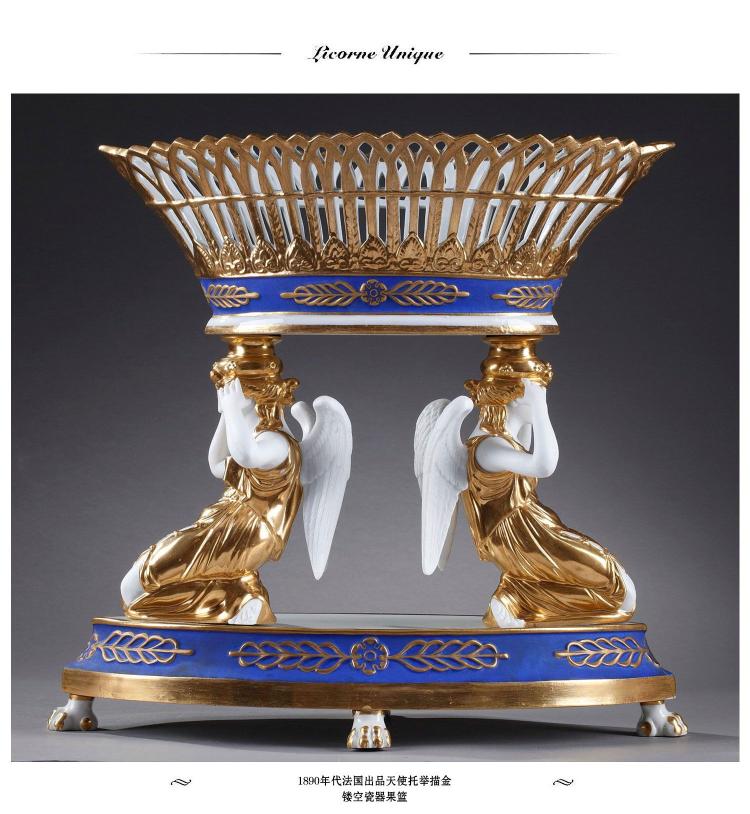 独角鹿西洋古董摆件1890年代法国出品天使托举描金镂空瓷器果篮