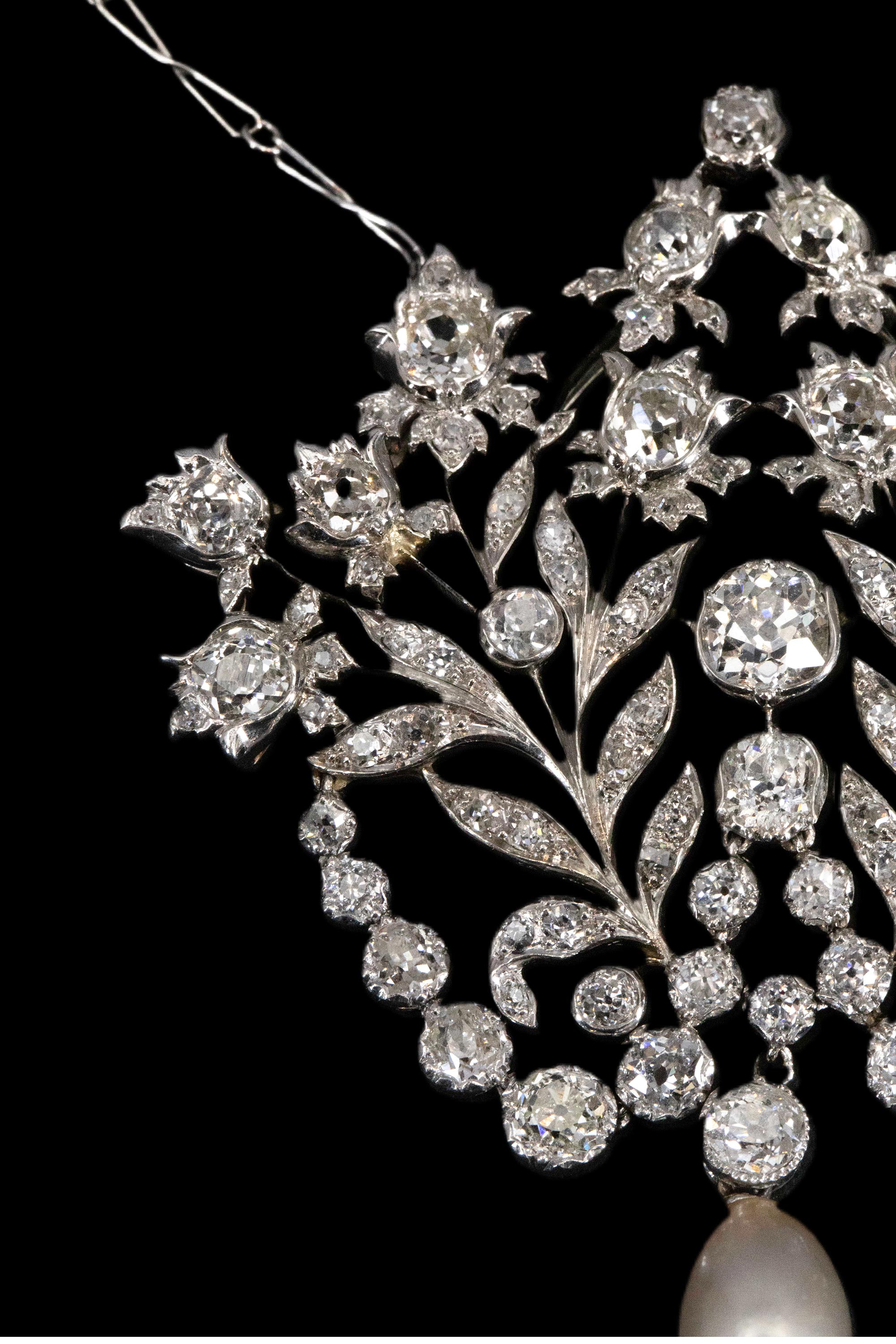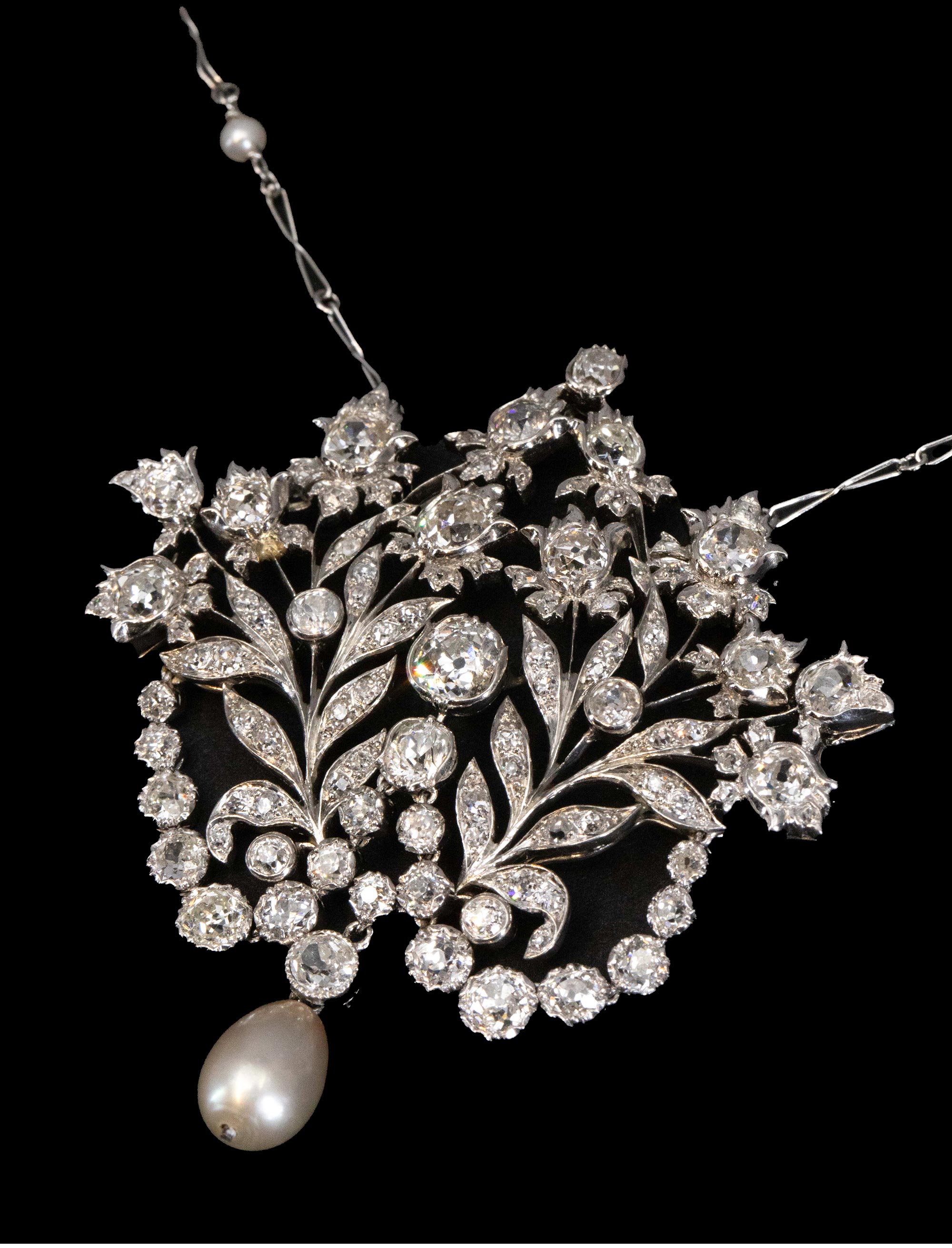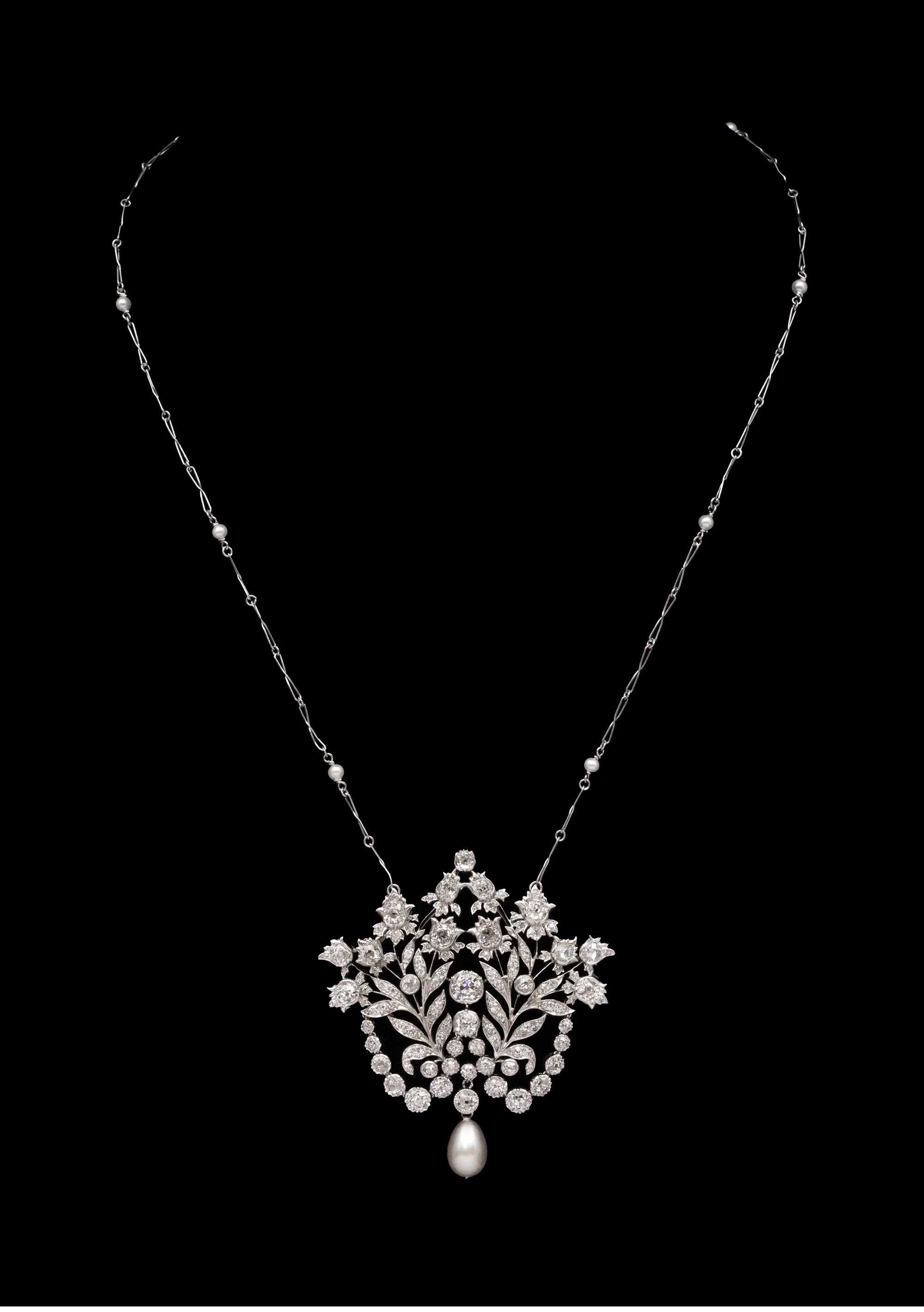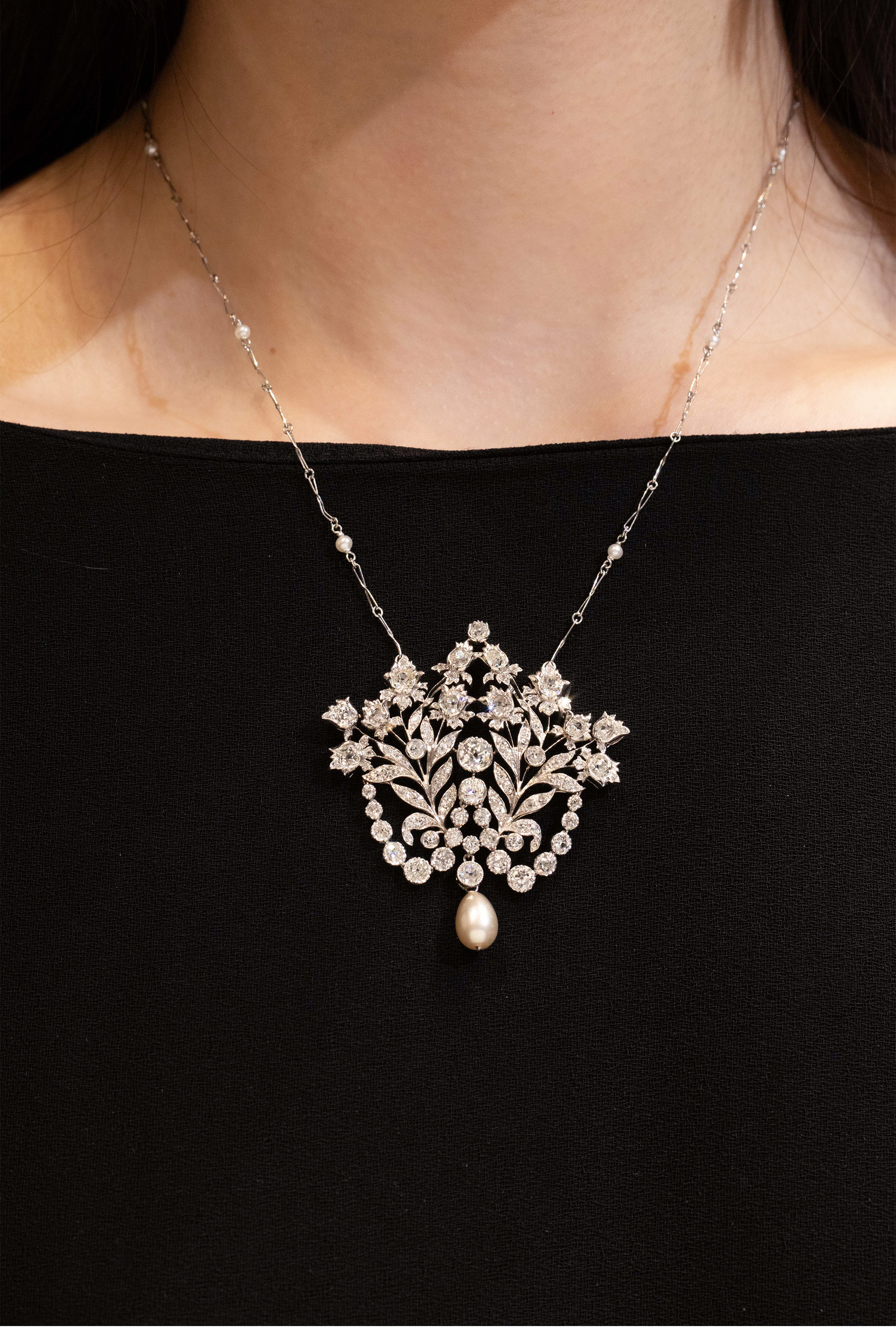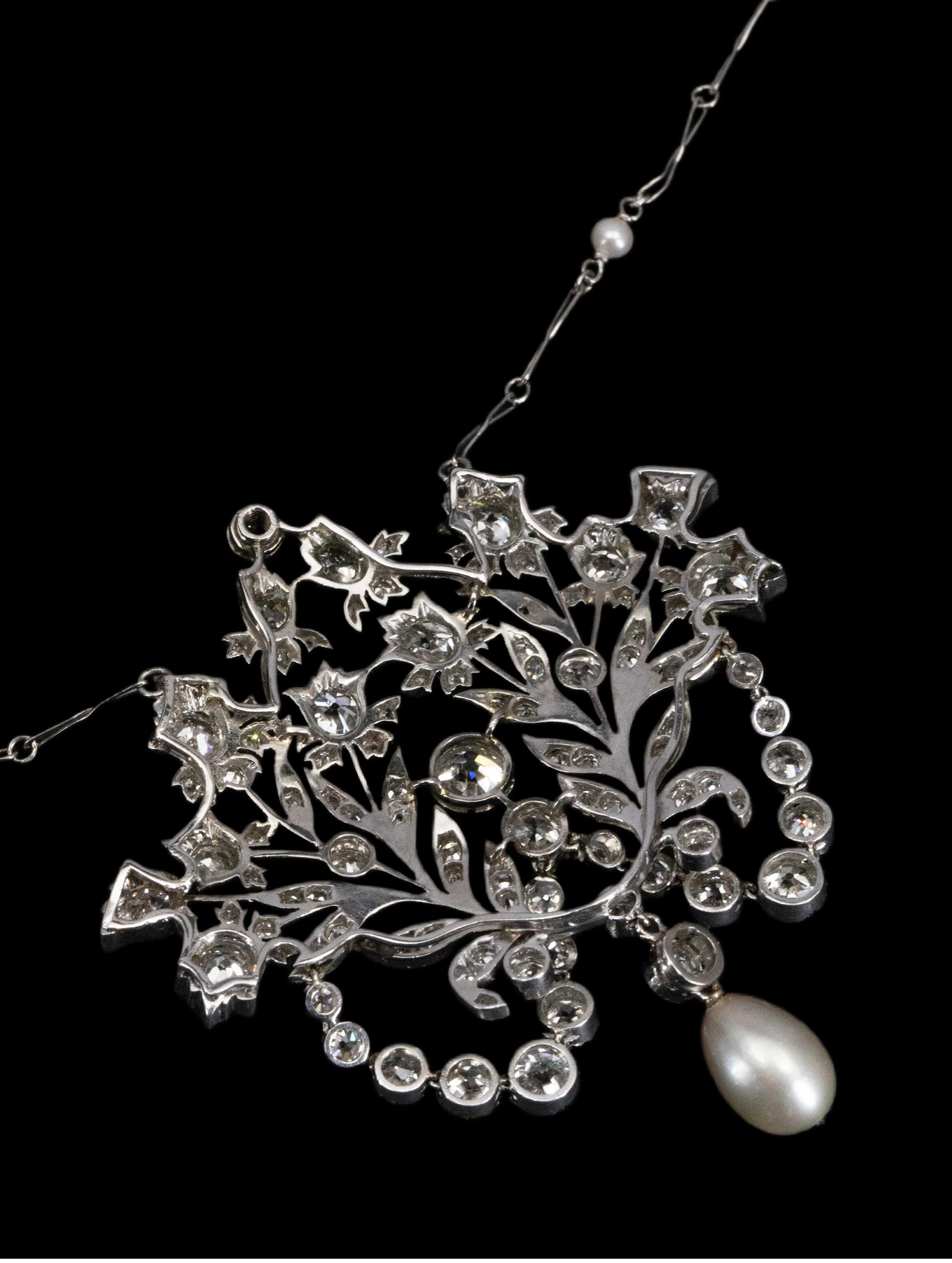 1920年代法国出品美好时代风格花束造型铂金镶嵌钻石及天然海水珍珠吊坠项链