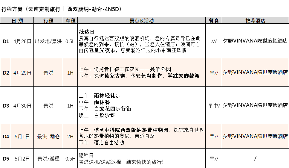 2. 餐食:全程含1正餐(雨林餐),其余全程不含正餐,酒店含双早