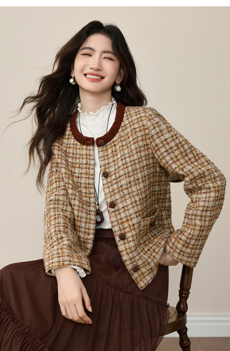 【周末秒杀】熙世界小香风短款外套女粗花呢2025秋冬新款复古格纹正肩圆领上衣