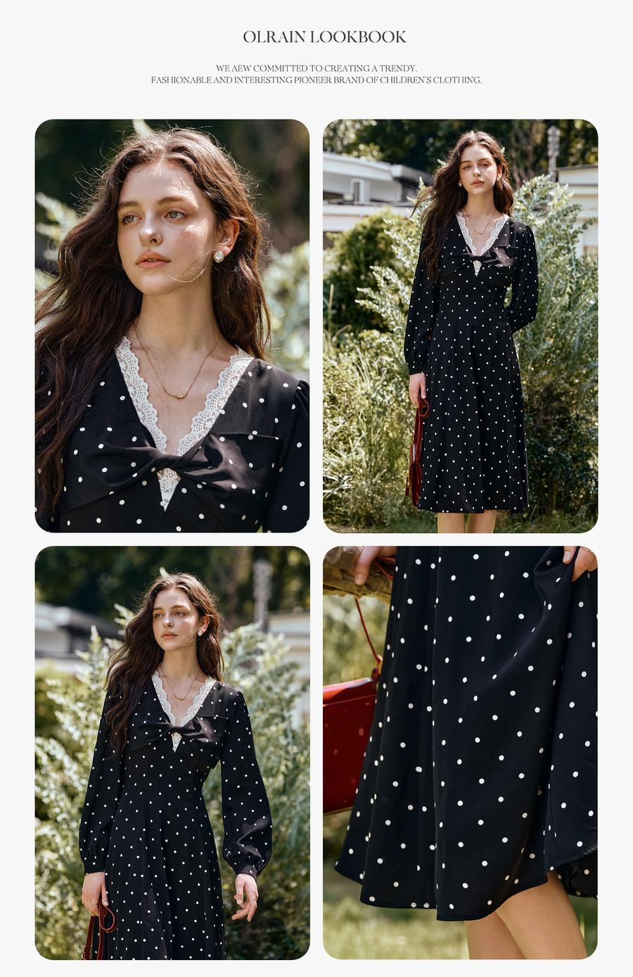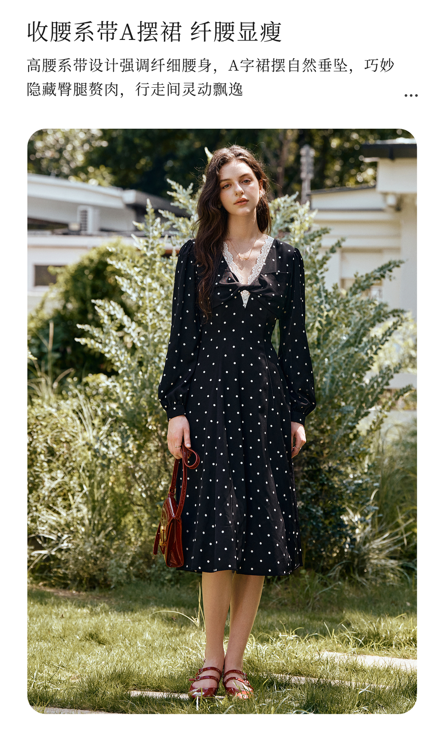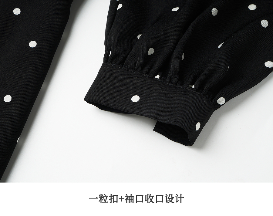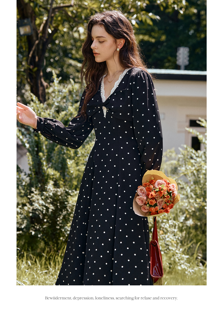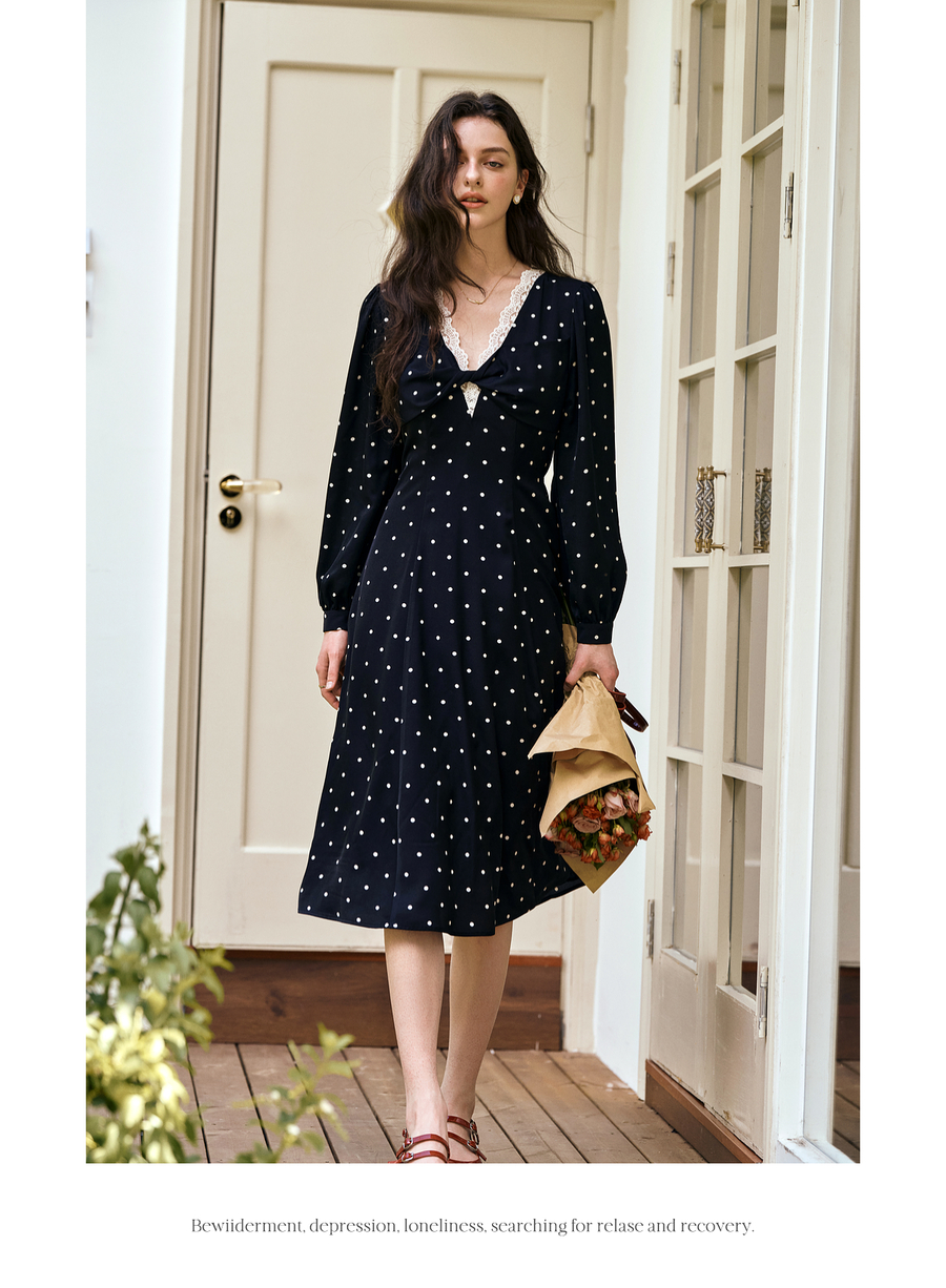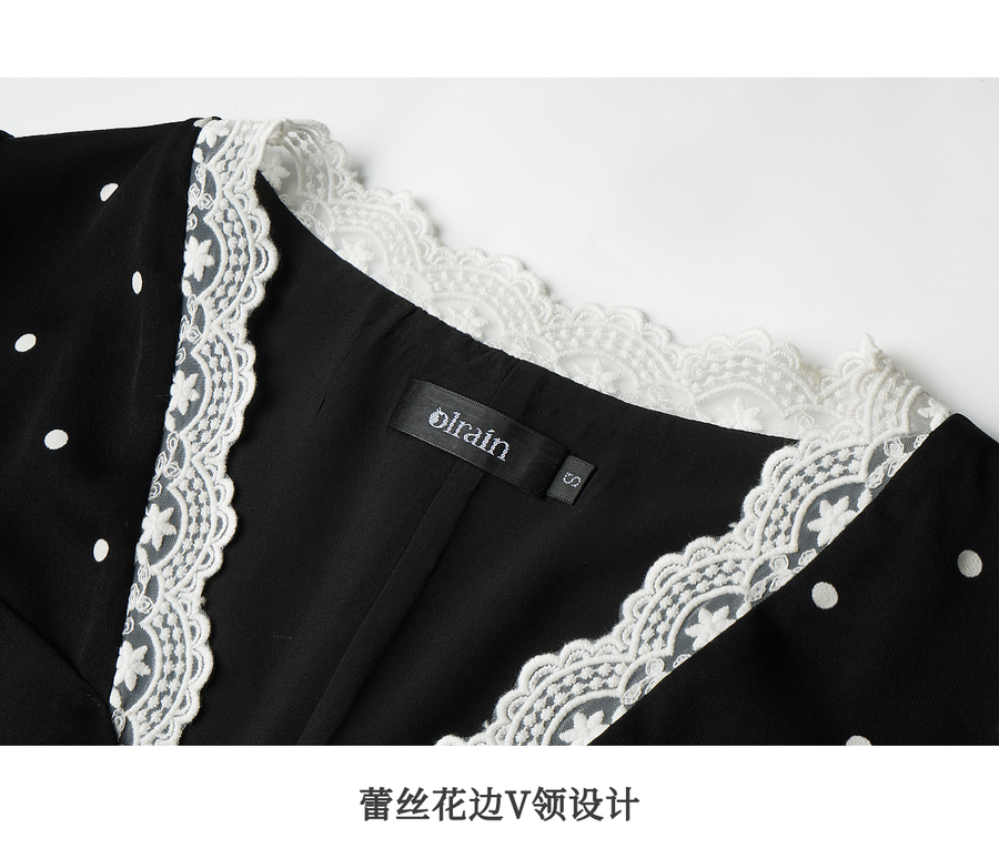 OLrain欧芮儿黑色波点V领扭结收腰显瘦系带连衣裙女秋季2025新款