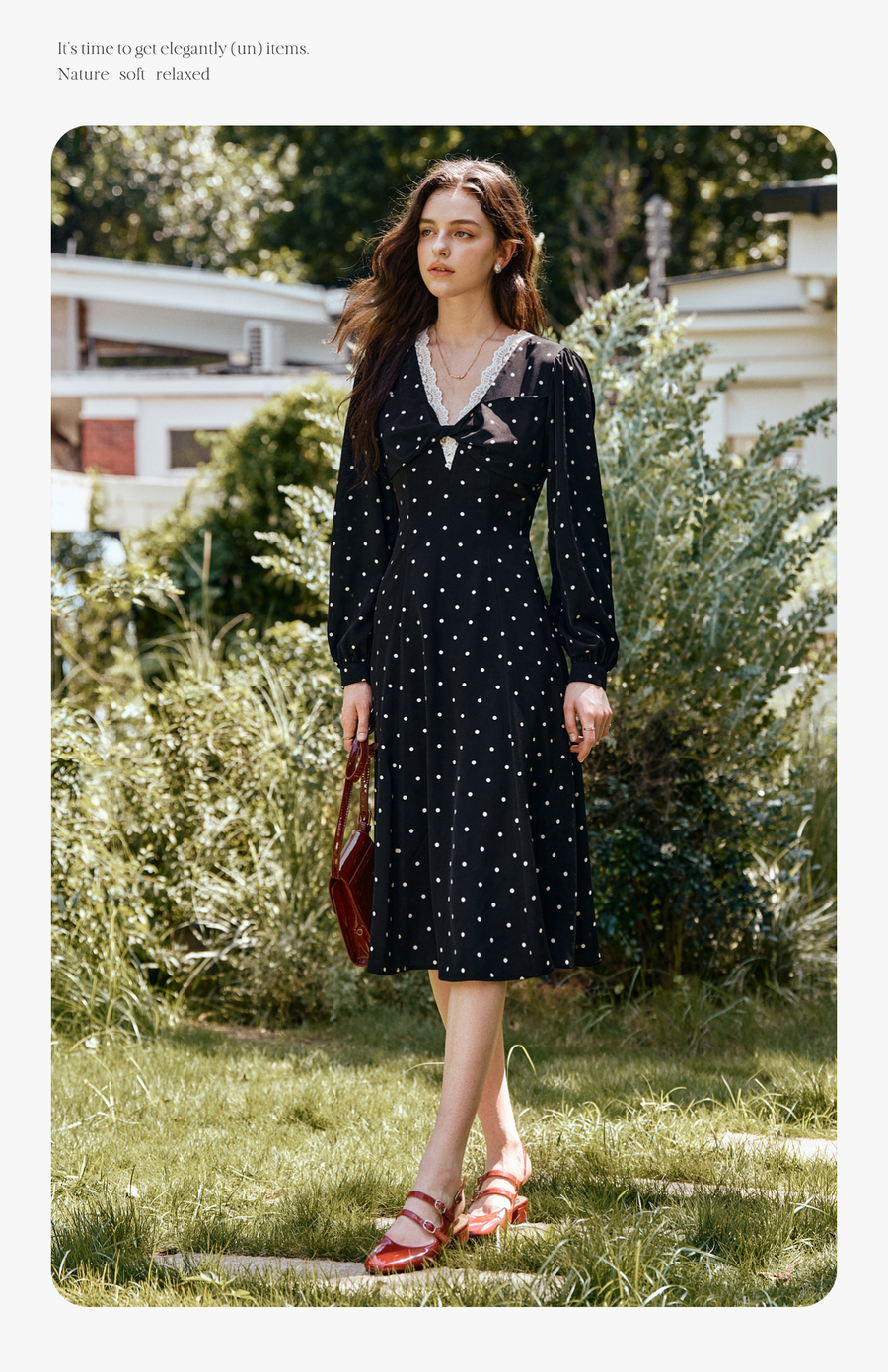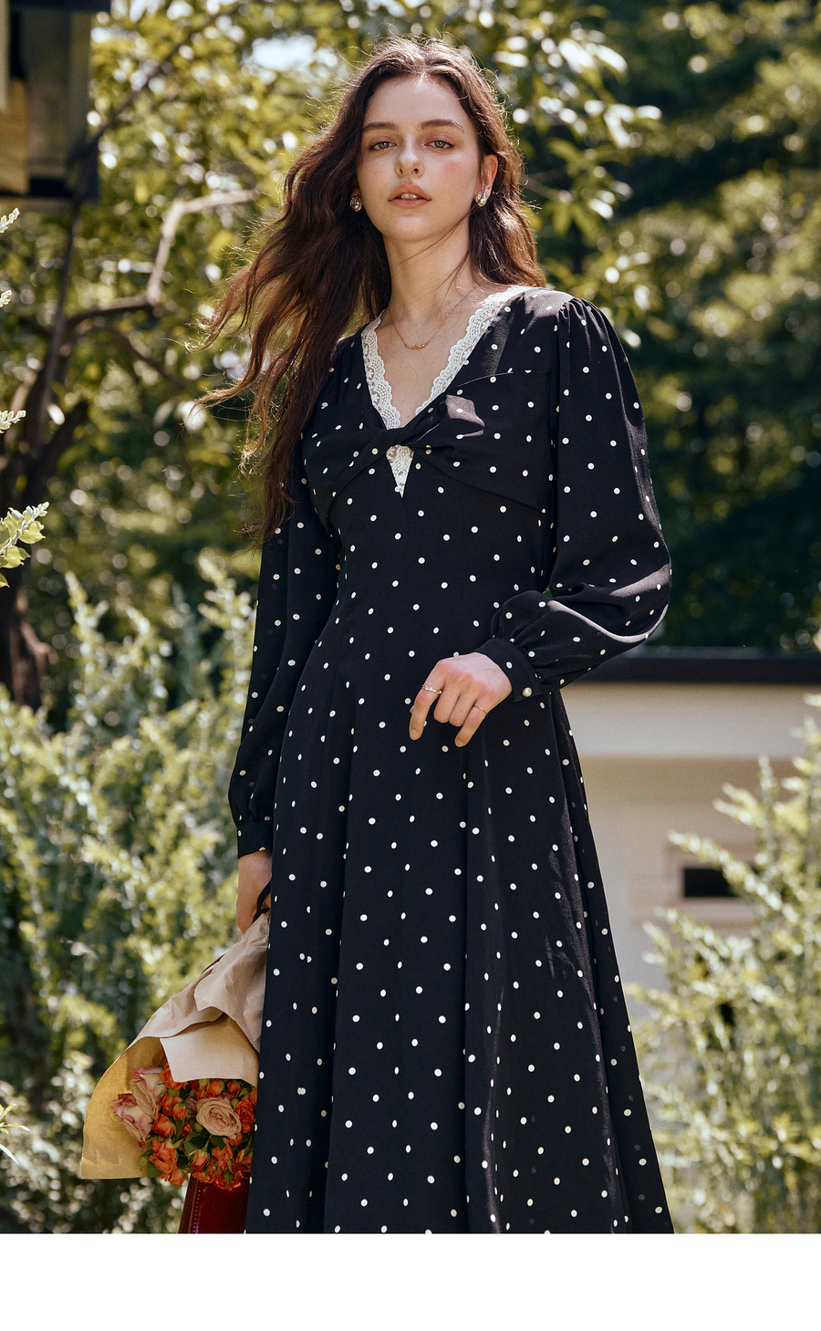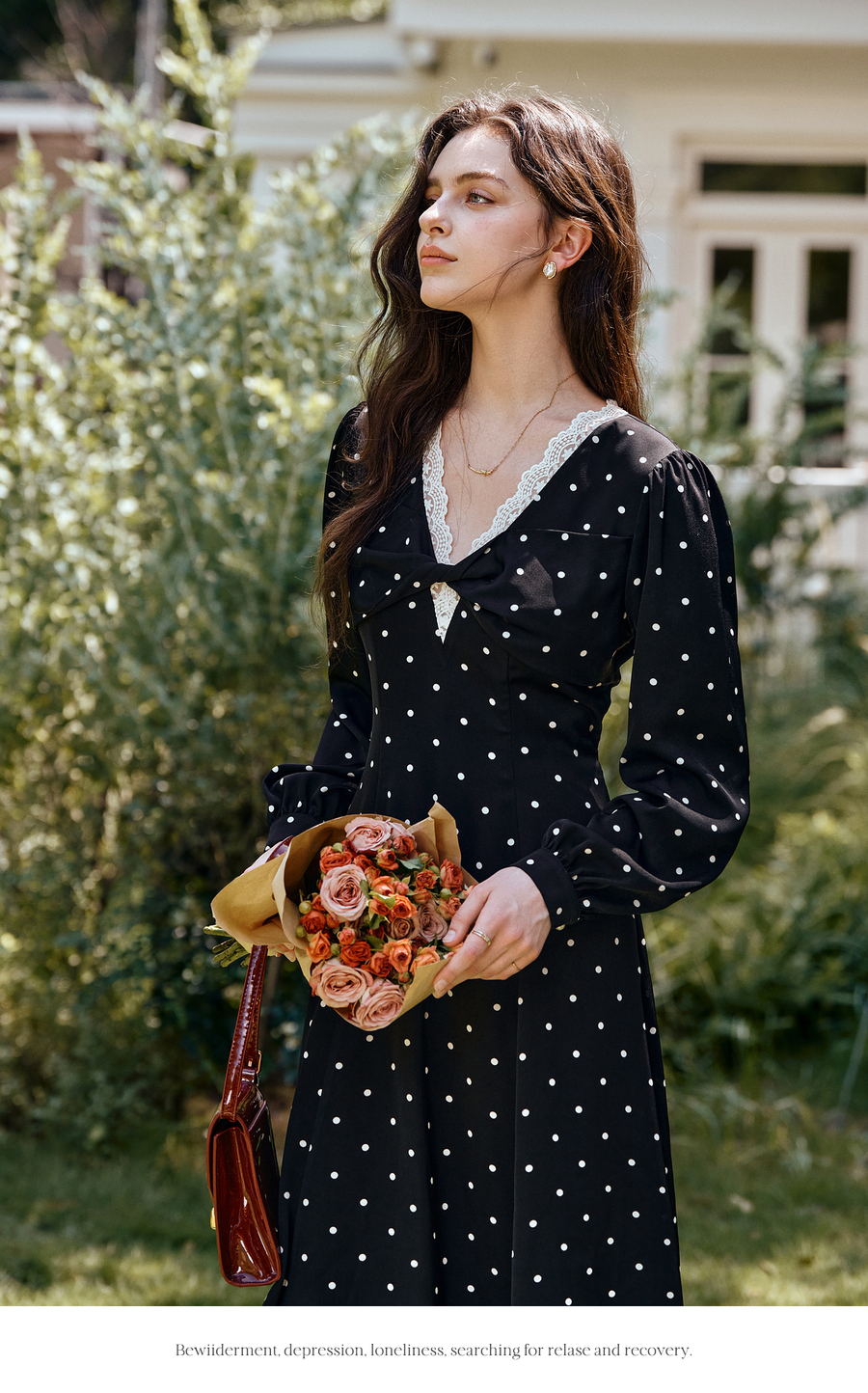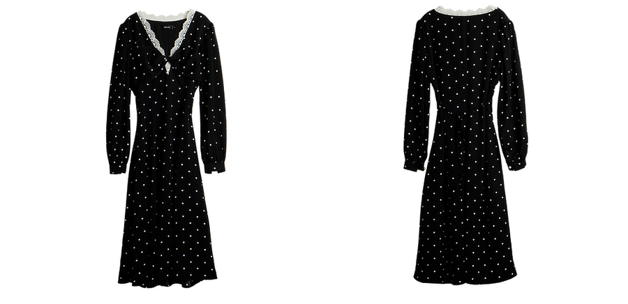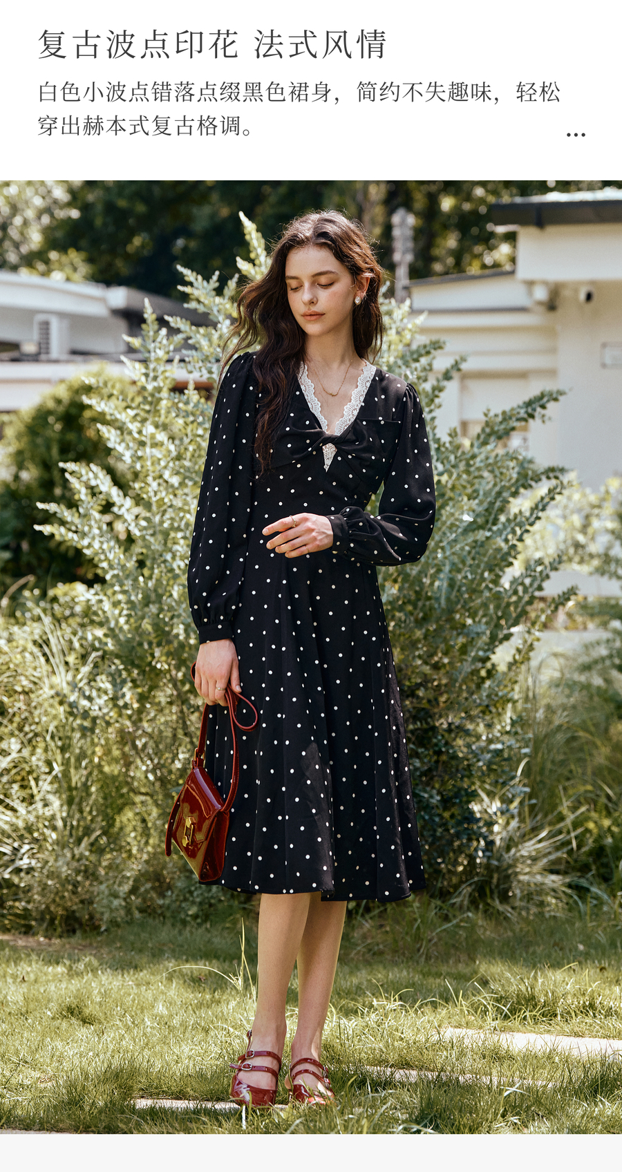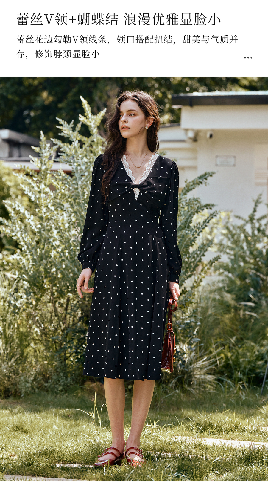 OLrain欧芮儿黑色波点V领扭结收腰显瘦系带连衣裙女秋季2025新款