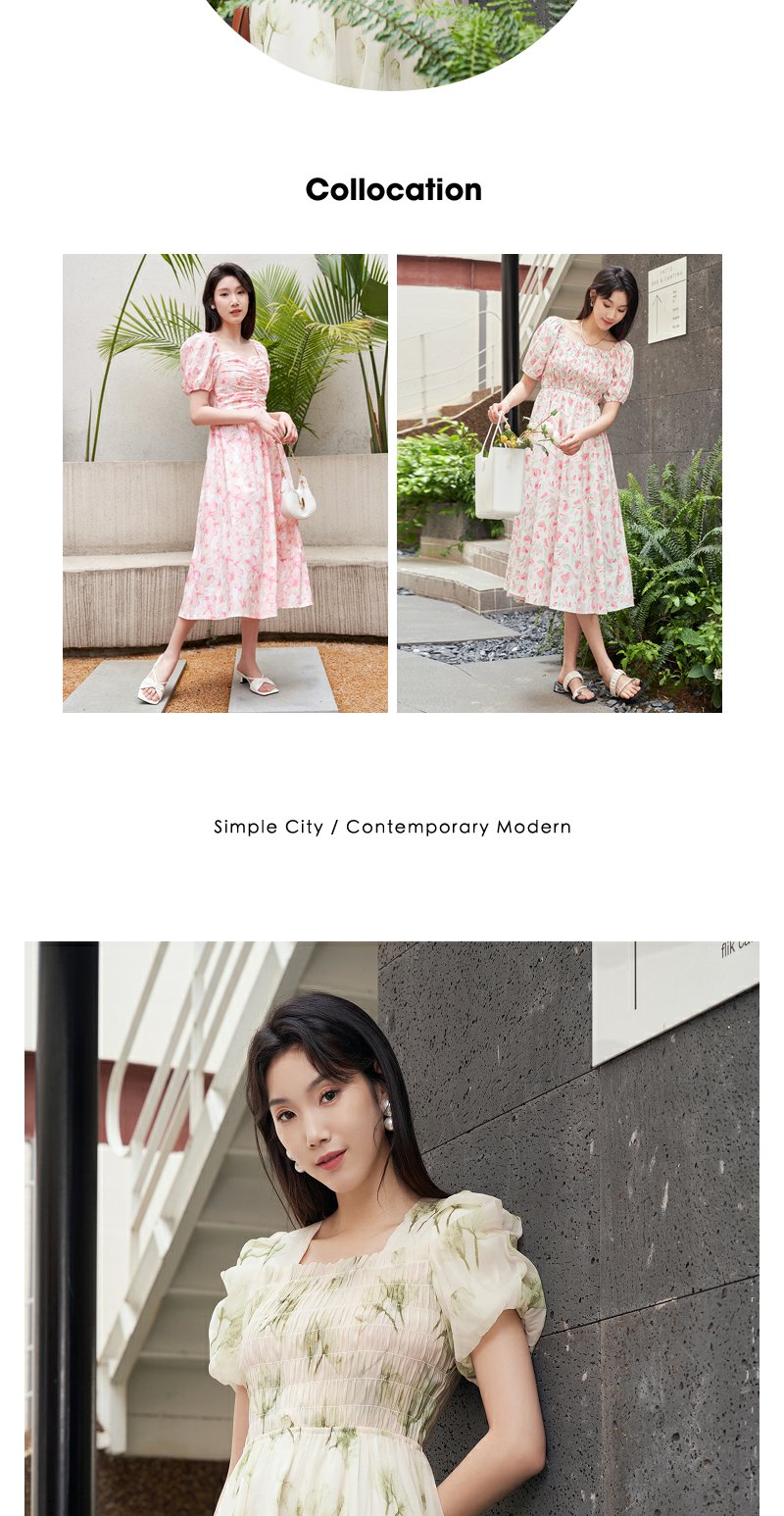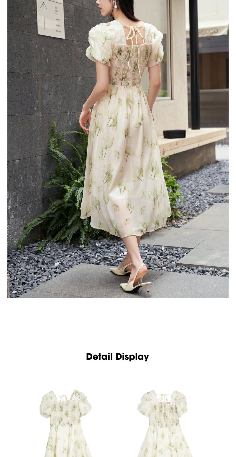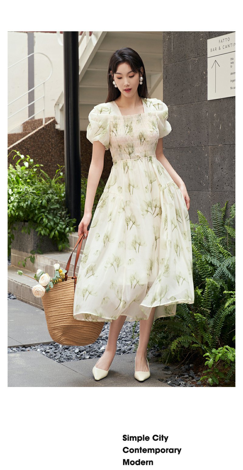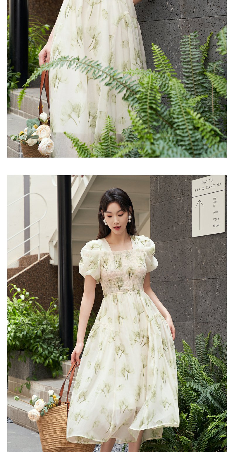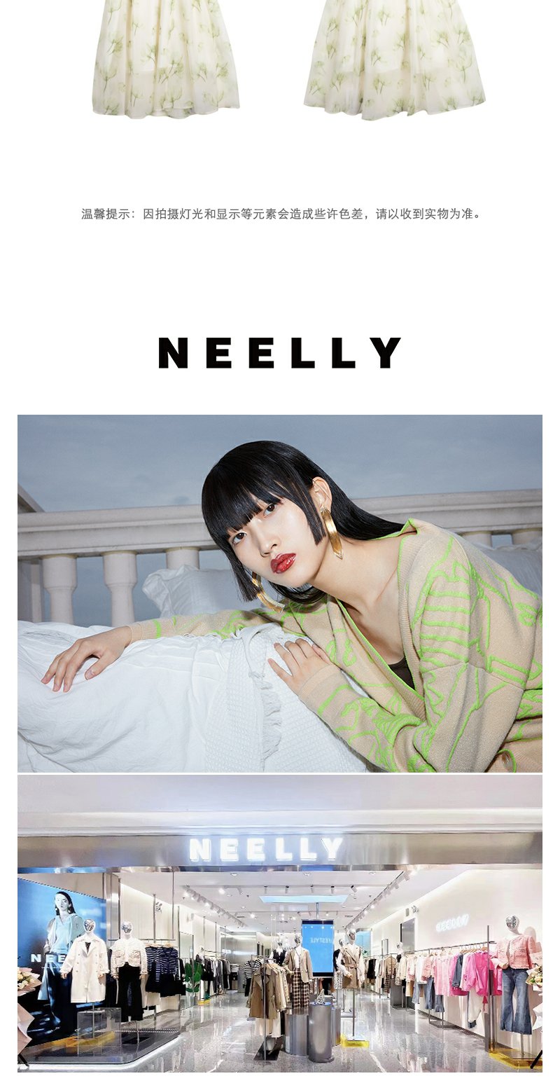 NEELLY纳俪法式方领印花连衣裙女泡泡袖水墨画气质收腰显瘦裙子夏N23044Y05522
