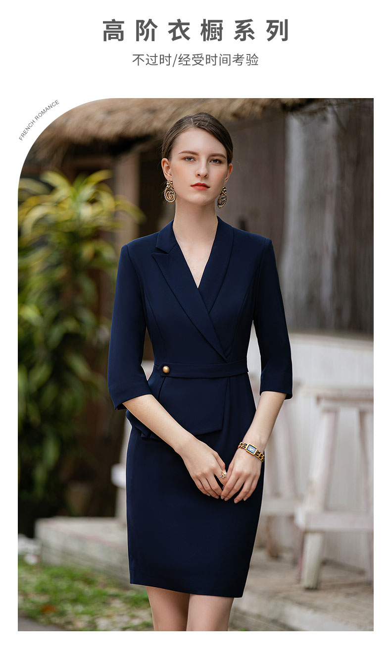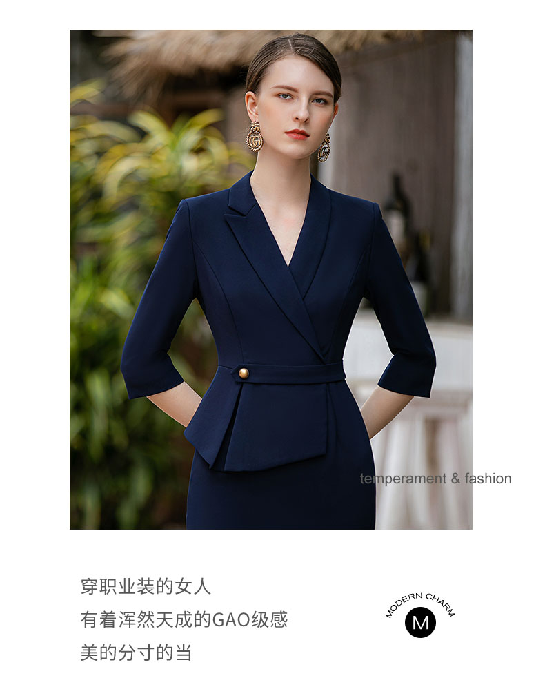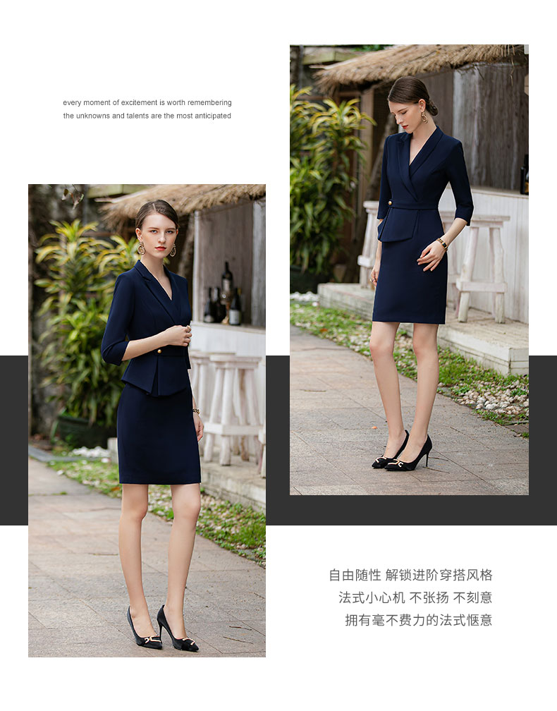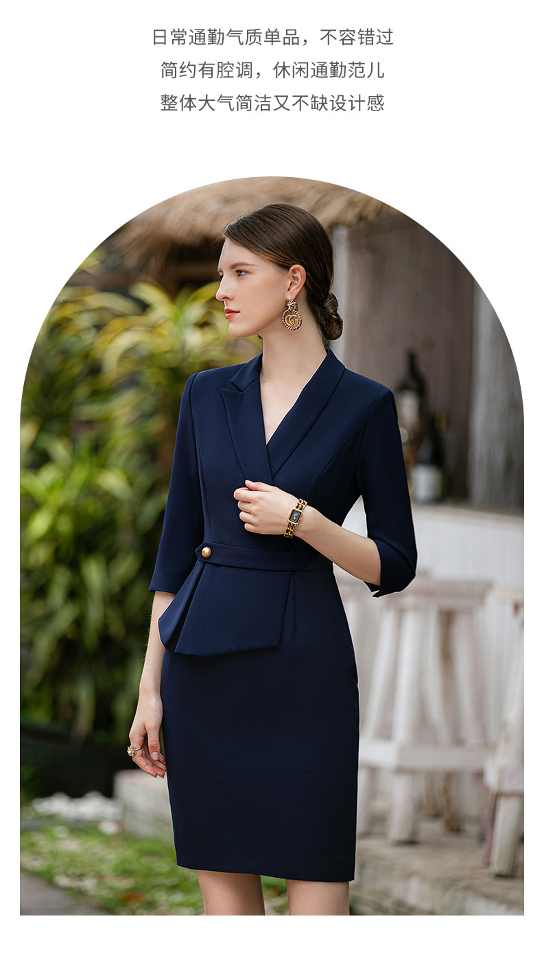IWY/藏青色职业连衣裙女士七分袖收腰显瘦售楼部正装西装套裙Q781