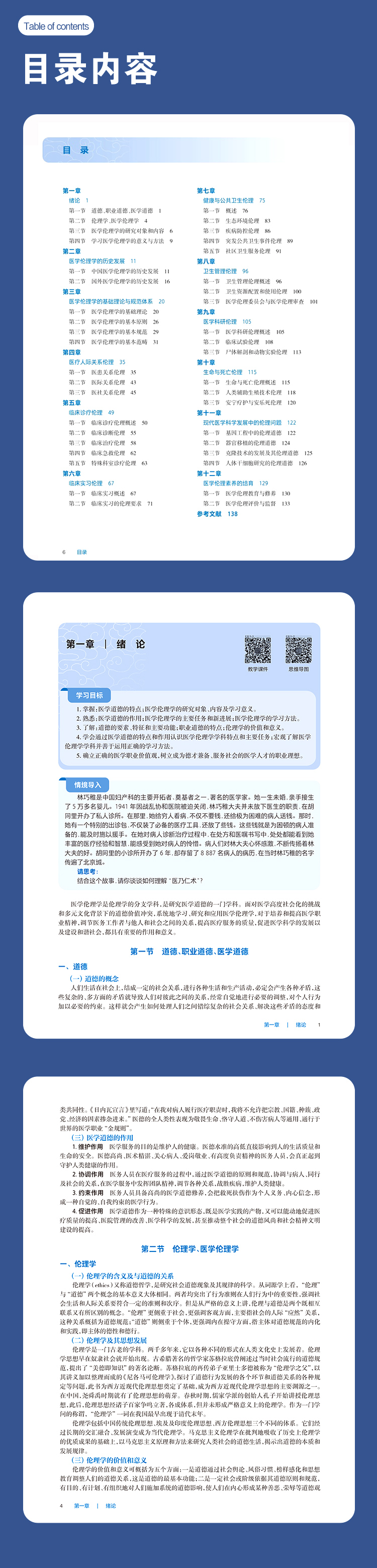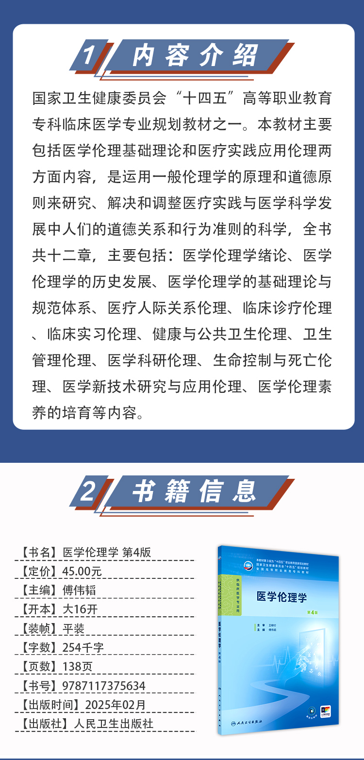 国家卫生健康委员会“十四五”高等职业教育专科临床医学专业规划教材之一。本教材主要包括医学伦理基础理论和医疗实践应用伦理两方面内容,是运用一般伦理学的原理和道德原则来研究、解决和调整医疗实践与医学科学发展中人们的道德关系和行为准则的科学,全书共十二章,主要包括:医学伦理学绪论、医学伦理学的历史发展、医学伦理学的基础理论与规范体系、医疗人际关系伦理、临床诊疗伦理、临床实习伦理、健康与公共卫生伦理、卫生管理伦理、医学科研伦理、生命控制与死亡伦理、医学新技术研究与应用伦理、医学伦理素养的培育等内容。
