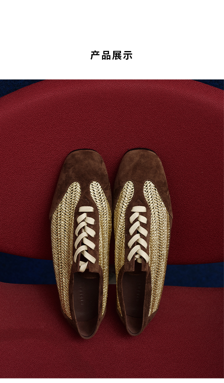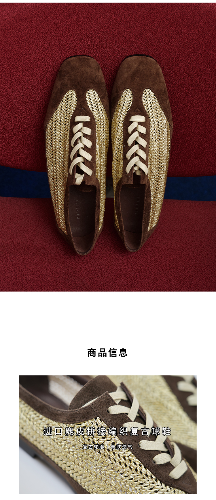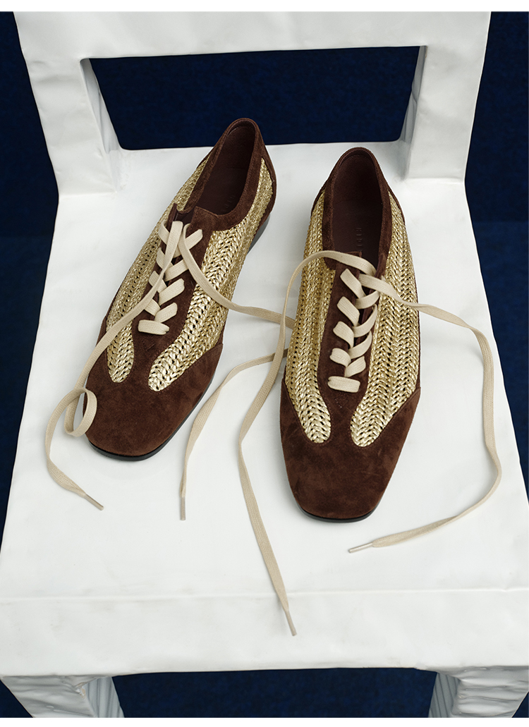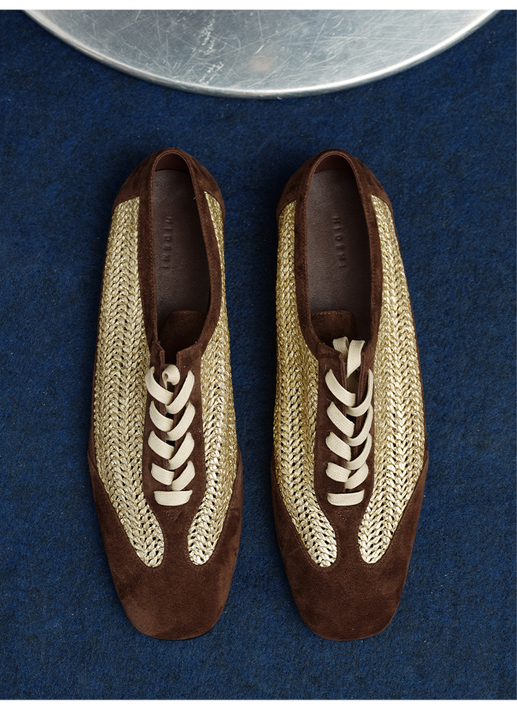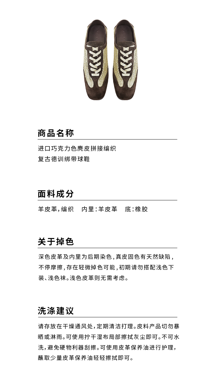HIDEMI 进口巧克力色麂皮拼接编织复古德训绑带球鞋