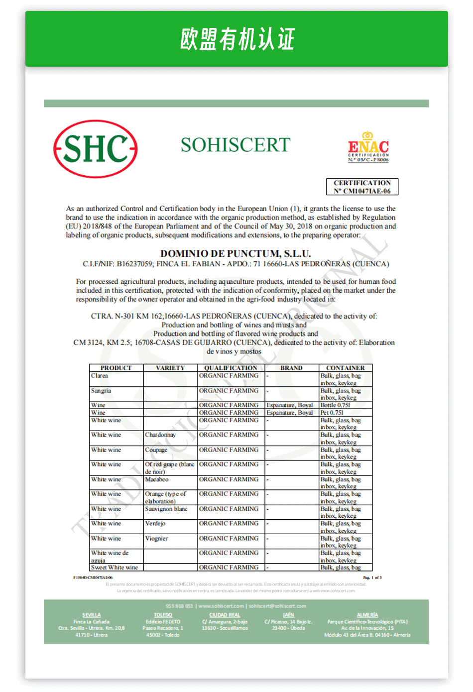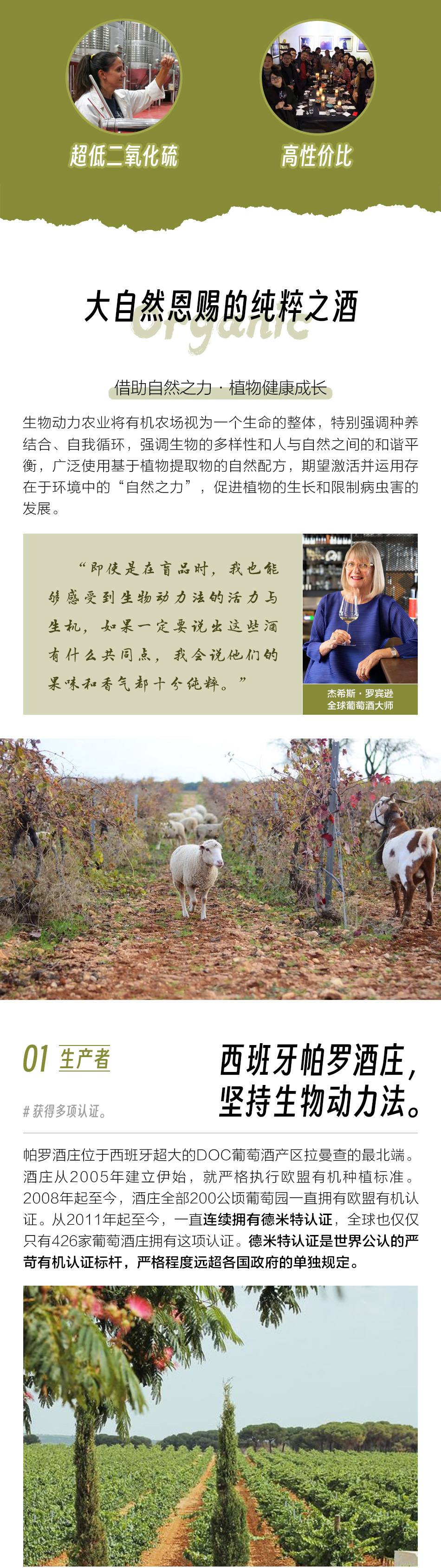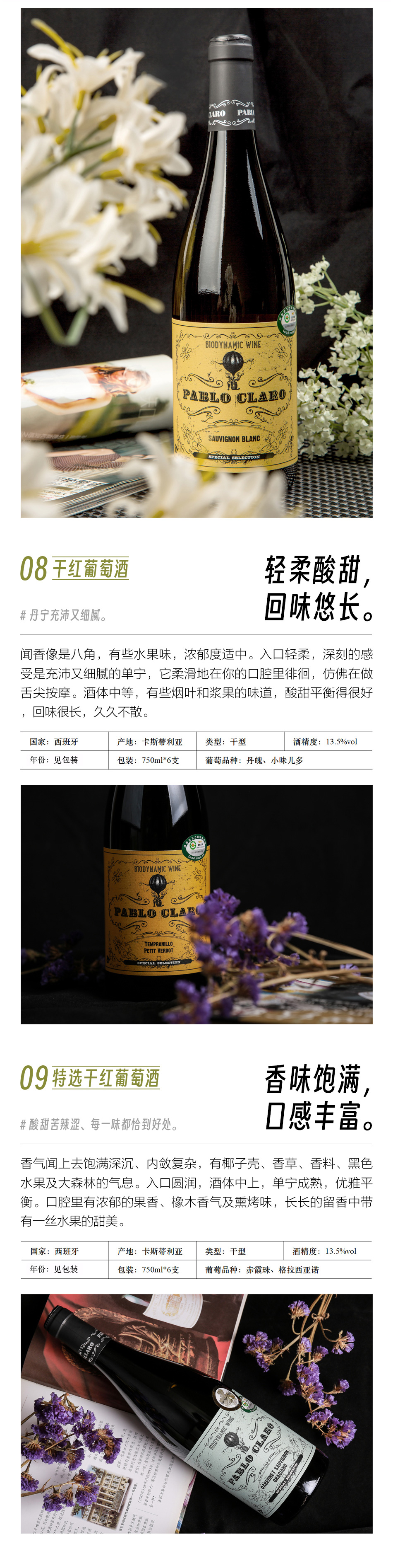 【品名】: 帕罗酒庄天然高泡葡萄酒(冰镇后饮用更佳) 帕罗酒庄长相思干白葡萄酒(冰镇后饮用更佳) 帕罗酒庄干红葡萄酒 帕罗酒庄特选干红葡萄酒 【净含量】:750ml 【原料与辅料】:葡萄汁、二氧化硫 【葡萄品种】: 帕罗酒庄天然高泡葡萄酒:维欧尼、维尤拉 帕罗酒庄长相思干白葡萄酒:长相思 帕罗酒庄干红葡萄酒:丹魄、小味儿多 帕罗酒庄特选干红葡萄酒:赤霞珠、格拉西亚诺 【酒精度】: 帕罗酒庄天然高泡葡萄酒:12%vol 帕罗酒庄长相思干白葡萄酒:13%vol 帕罗酒庄干红葡萄酒:13.5%vol 帕罗酒庄特选干红葡萄酒:13.5%vol 【二氧化硫含量】: 帕罗酒庄天然高泡葡萄酒:88mg/l 帕罗酒庄长相思干白葡萄酒:69mg/l 帕罗酒庄干红葡萄酒:60mg/l 帕罗酒庄特选干红葡萄酒:53mg/l 【产地】:西班牙卡斯蒂利亚 【生产方式】:葡萄园2011年开始有机种植,葡萄酒采用自产有机葡萄酿造而成,加工过程全有机,取得种植和加工全有机认证 【生产日期】:见瓶身 【保质期】:20年 【贮藏条件】:常温阴凉避光处保存,开瓶后请尽快饮用
