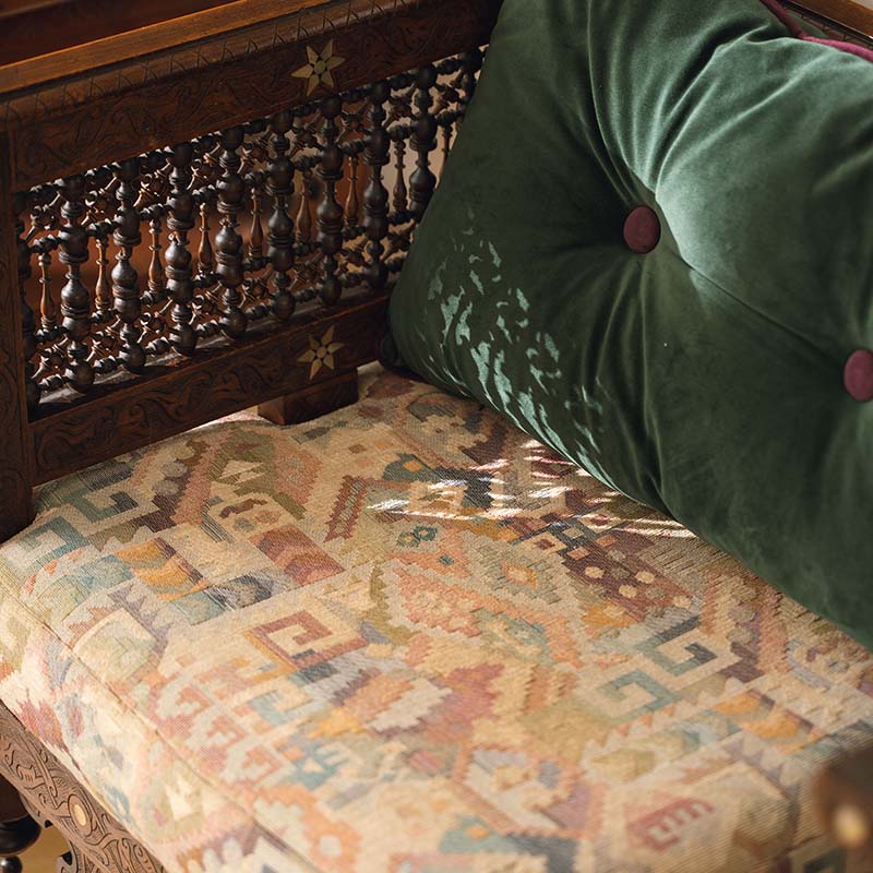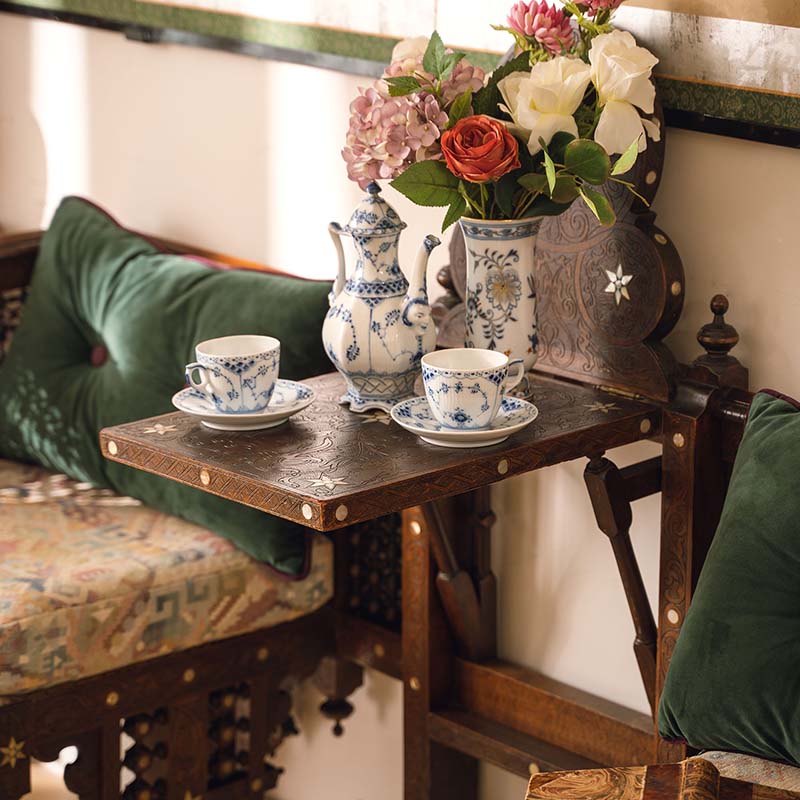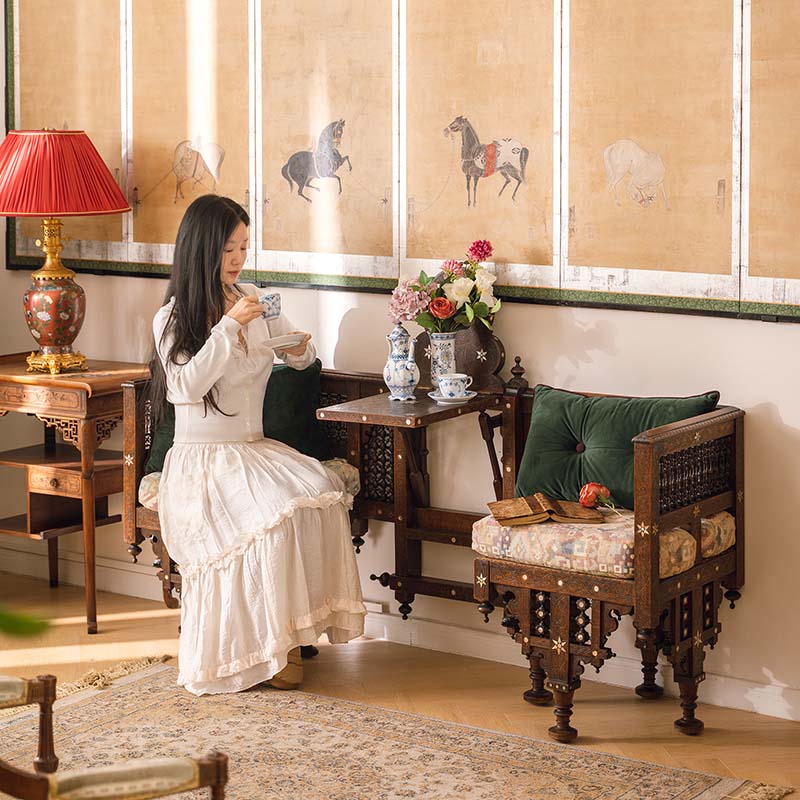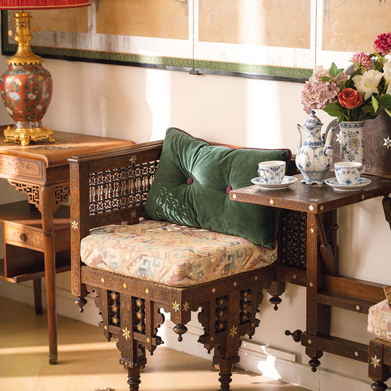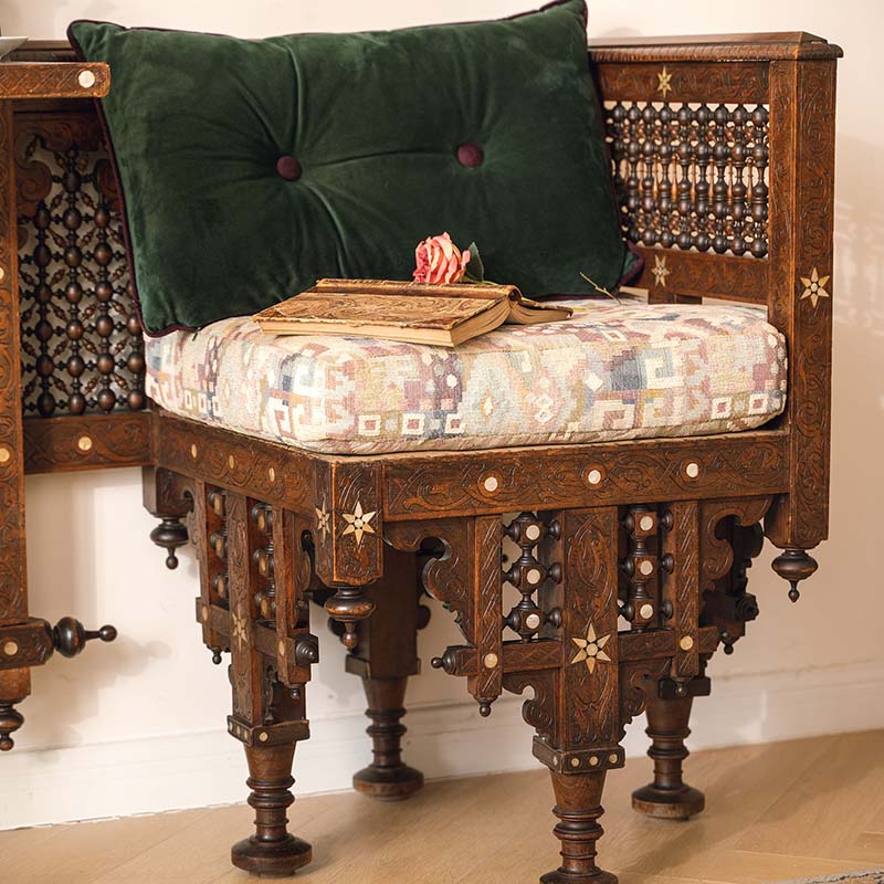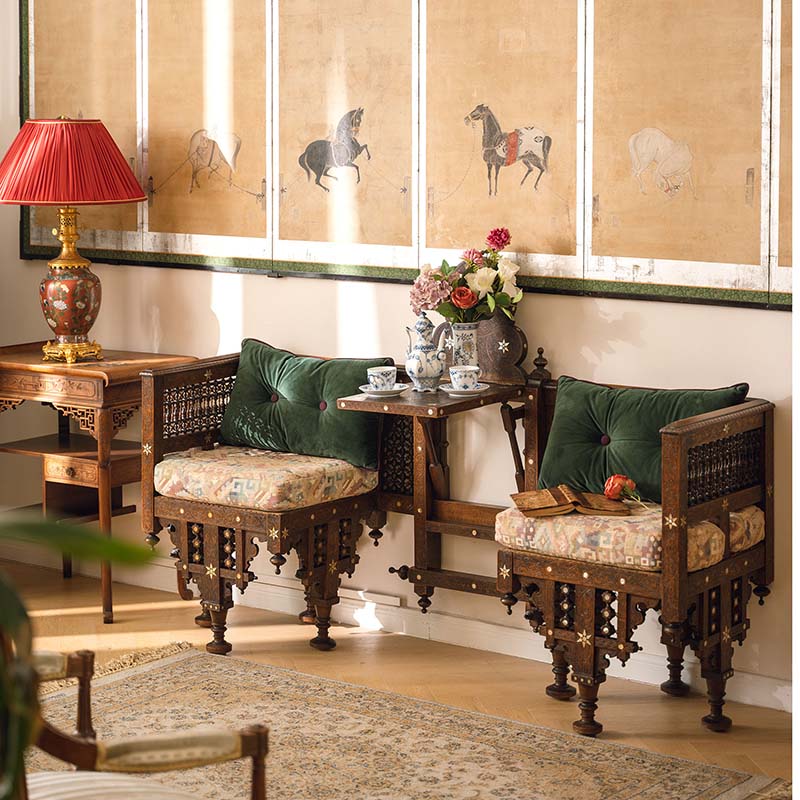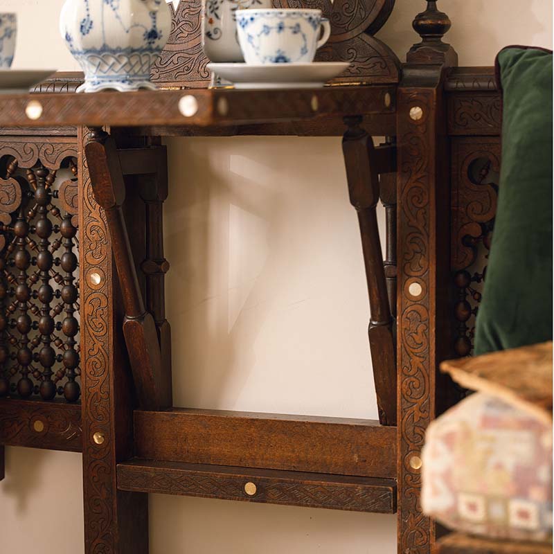 【已售】独角鹿西洋古董 1880年代叙利亚出品伊斯兰风格母贝镶嵌卷叶纹硬木精雕可折叠式双人桌椅套件