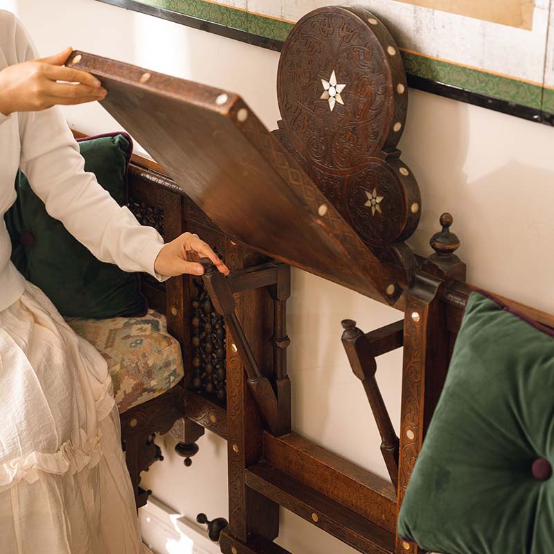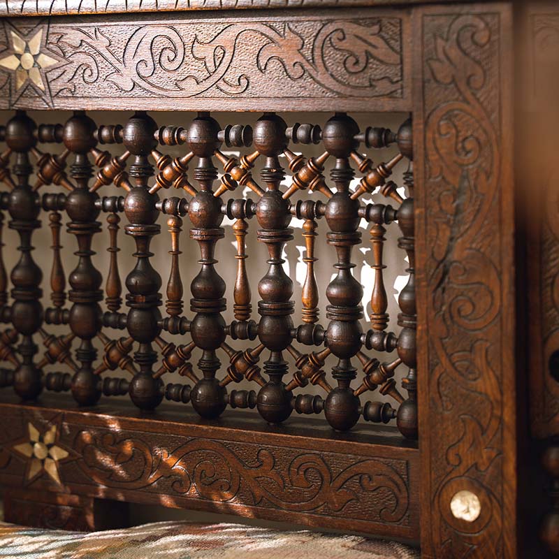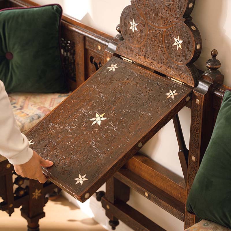 1880年代叙利亚出品伊斯兰风格母贝镶嵌卷叶纹硬木精雕可折叠式双人桌椅套件