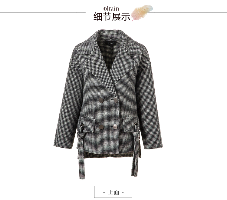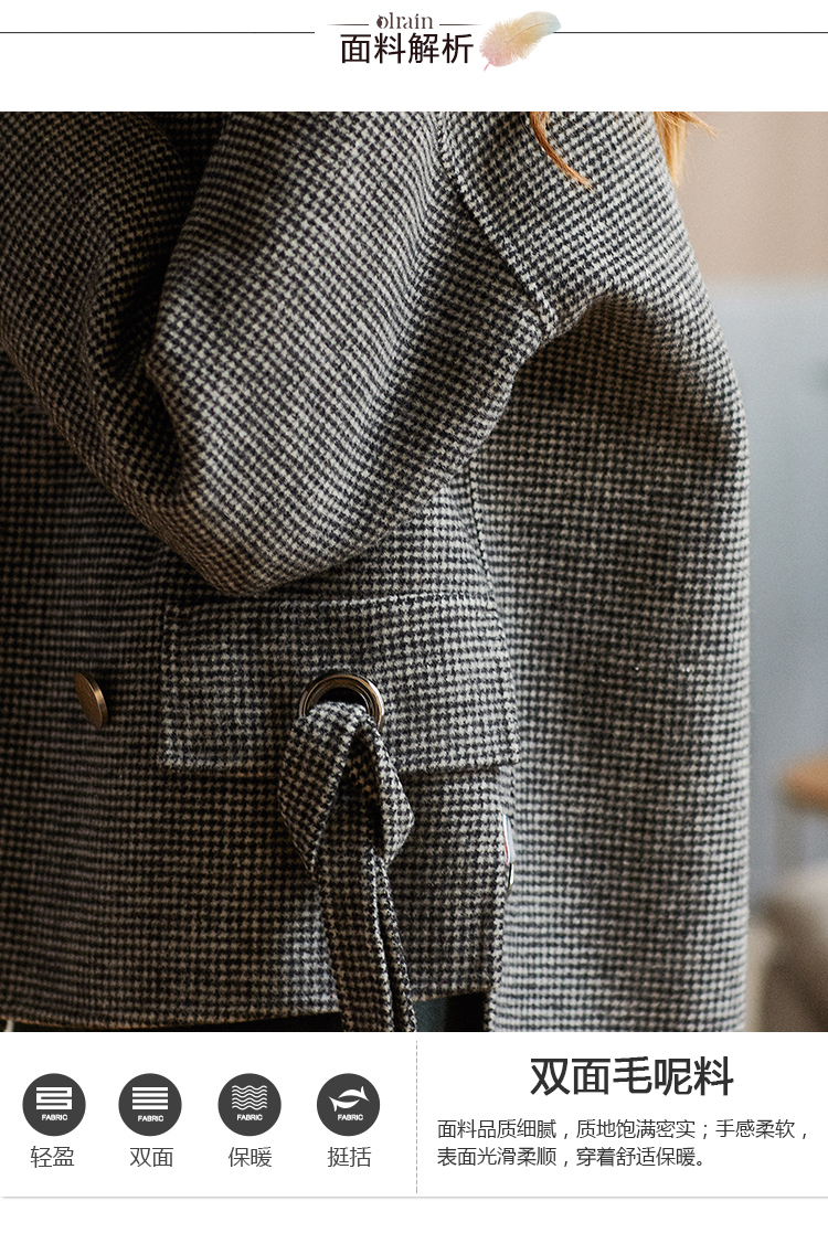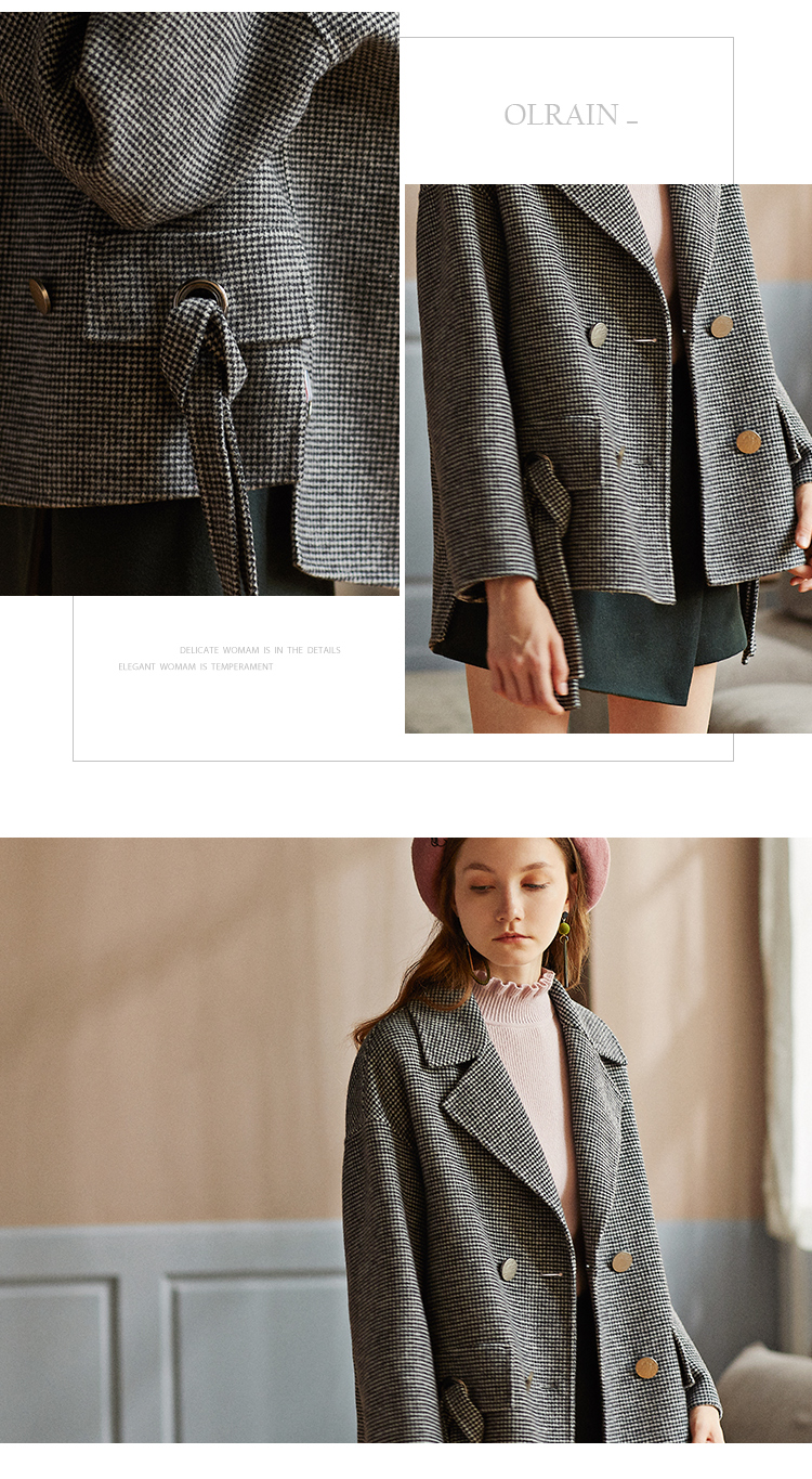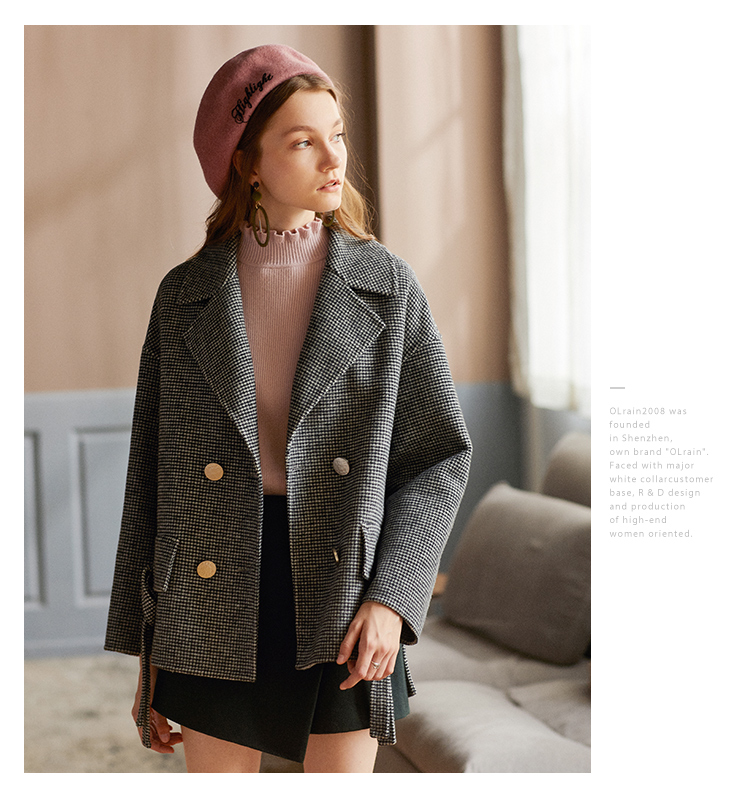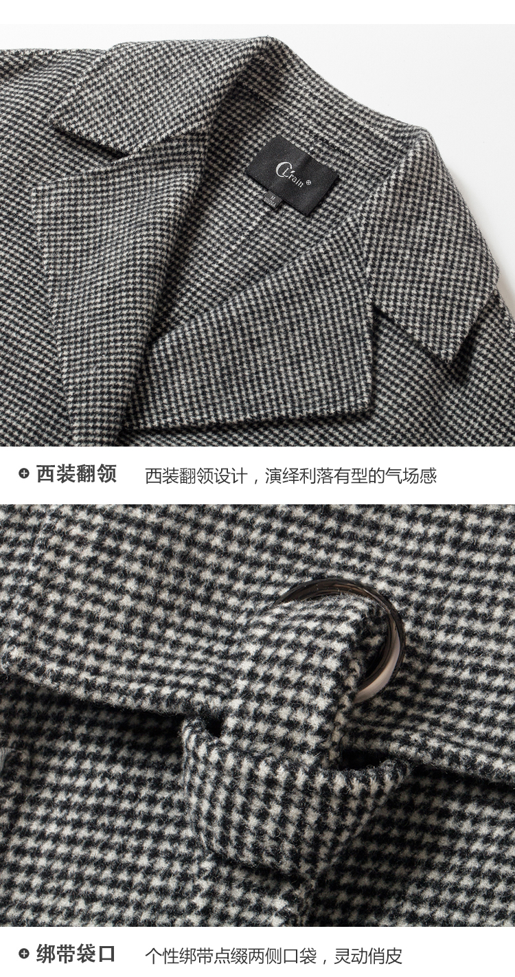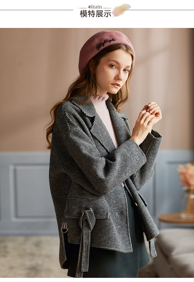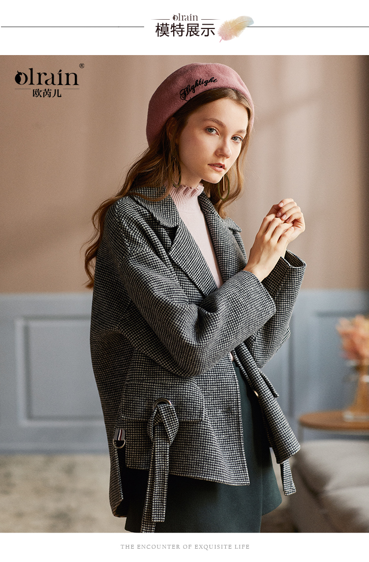 欧芮儿女装2019冬新款翻领格子大衣长袖羊毛双面呢毛呢外套