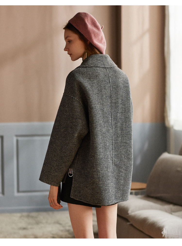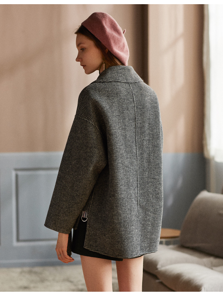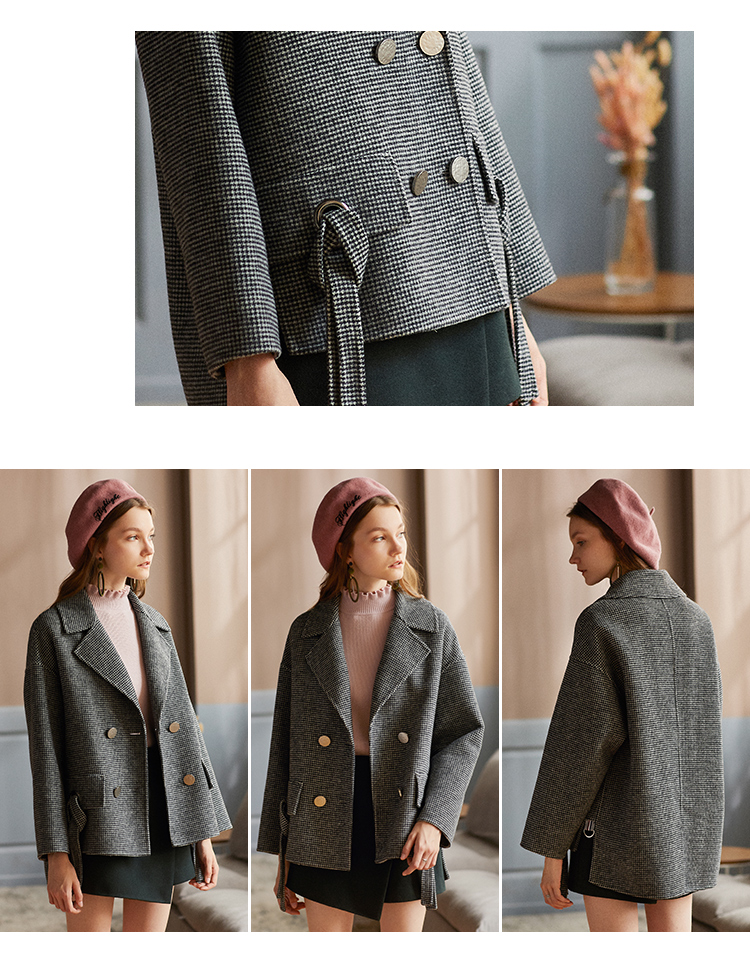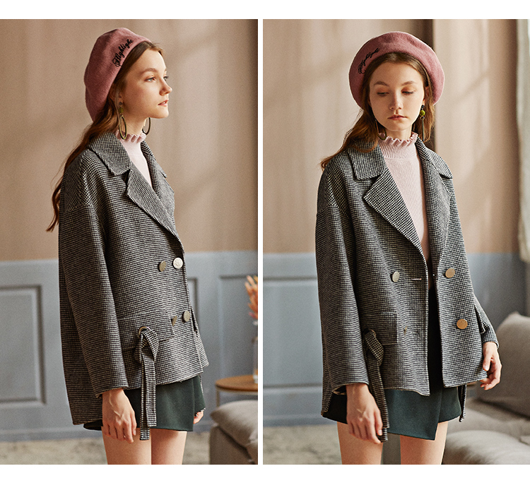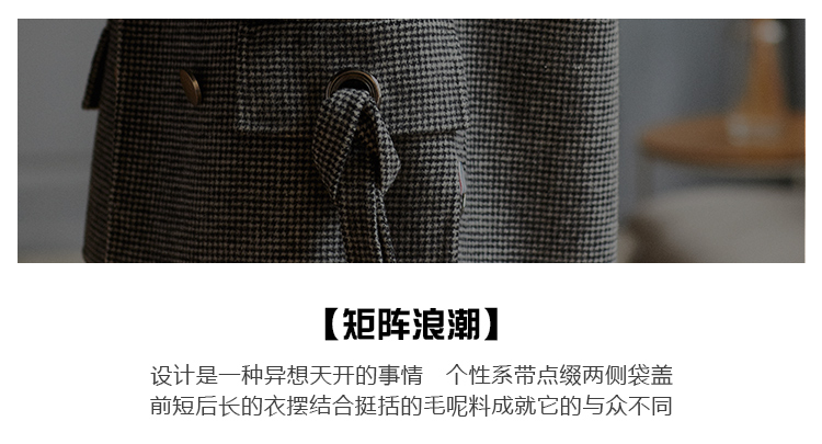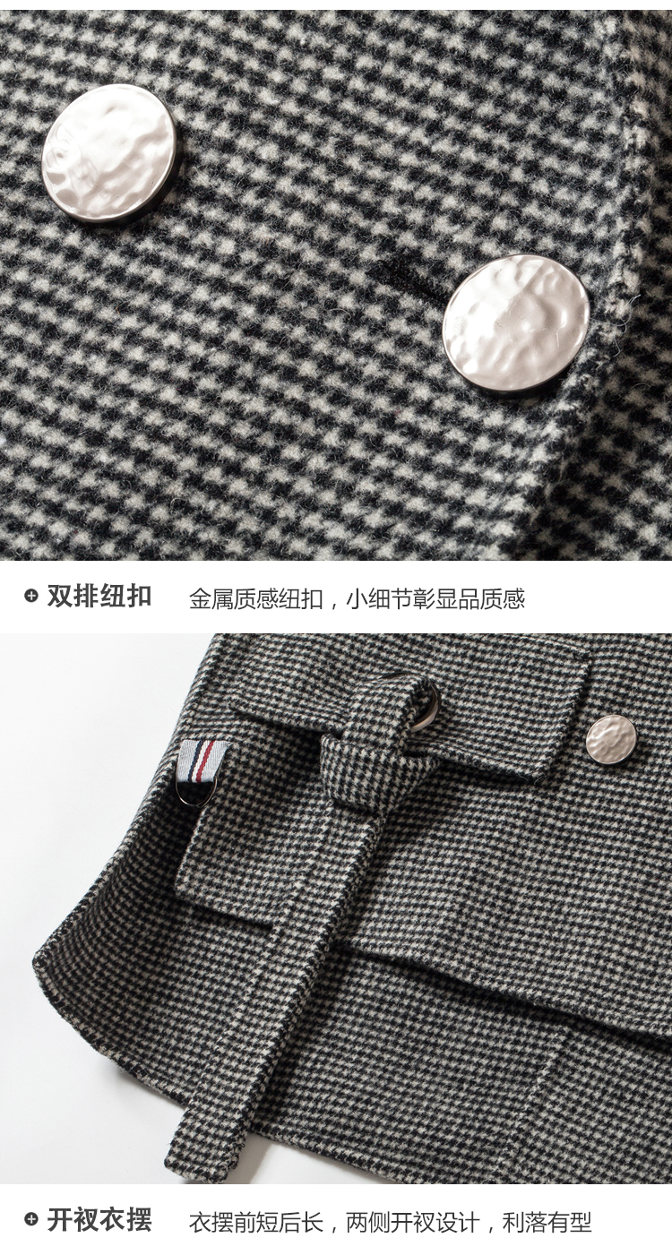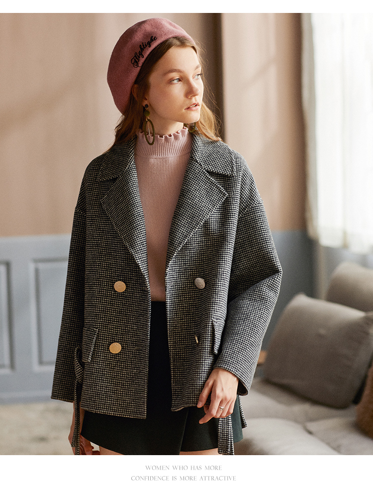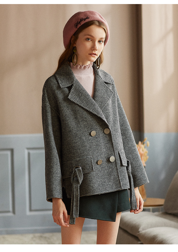 欧芮儿女装2019冬新款翻领格子大衣长袖羊毛双面呢毛呢外套