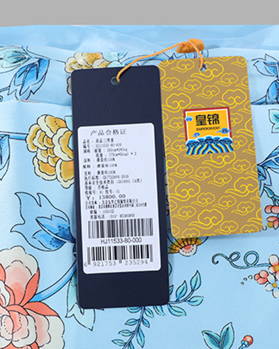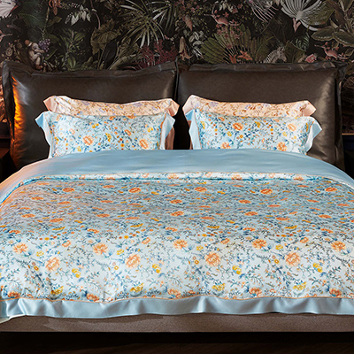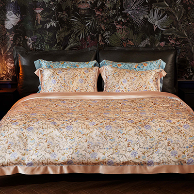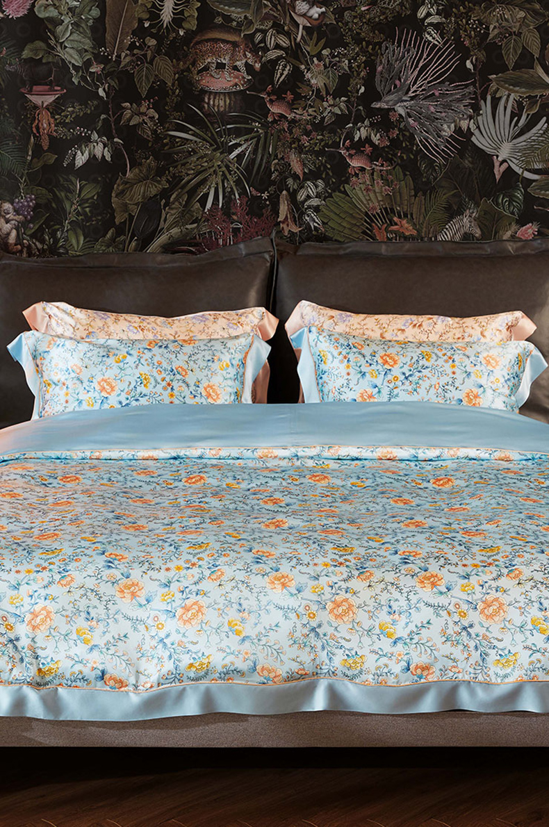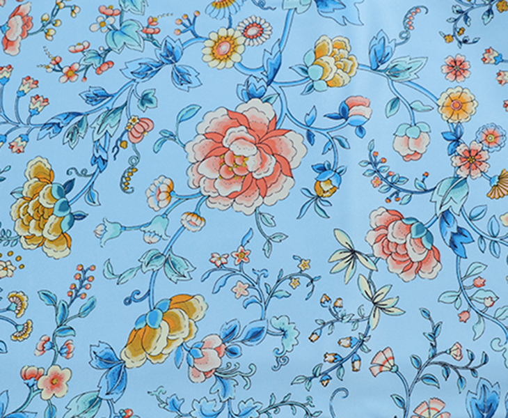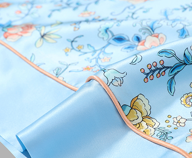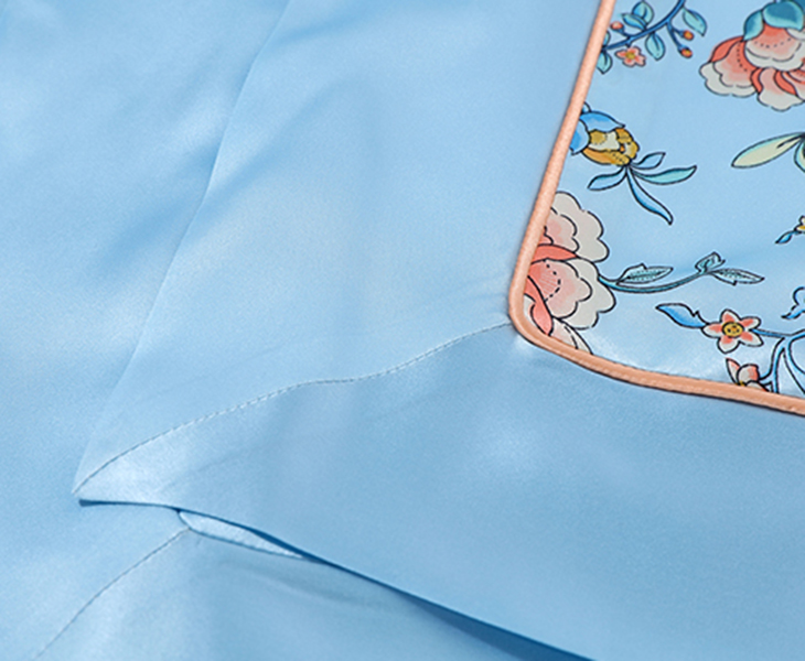 采用柔滑轻盈的桑蚕丝面料,搭配繁花似锦印花,整体布局均衡大气,寓意美好。