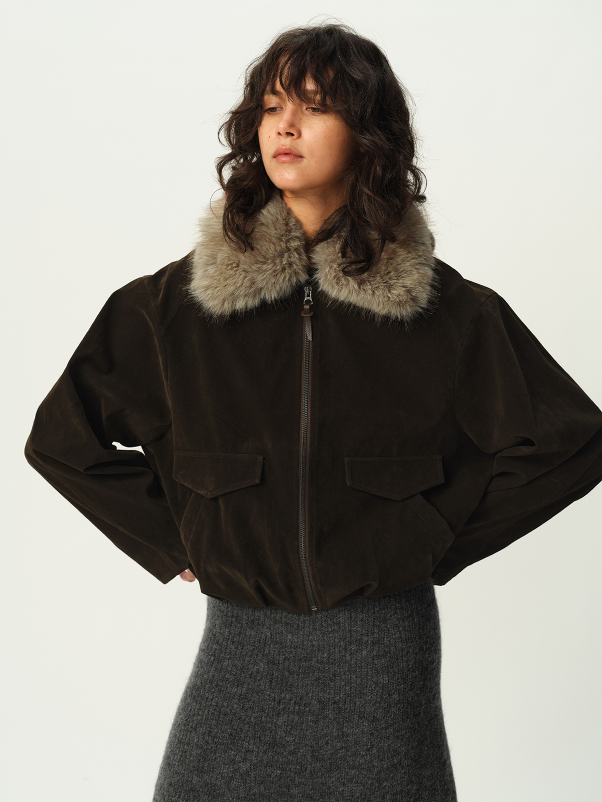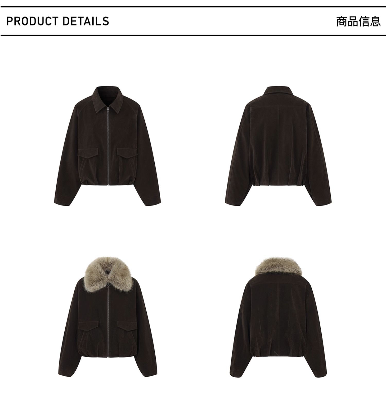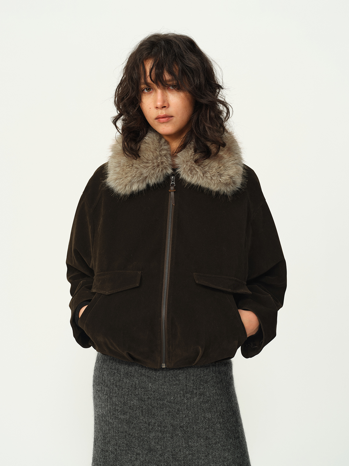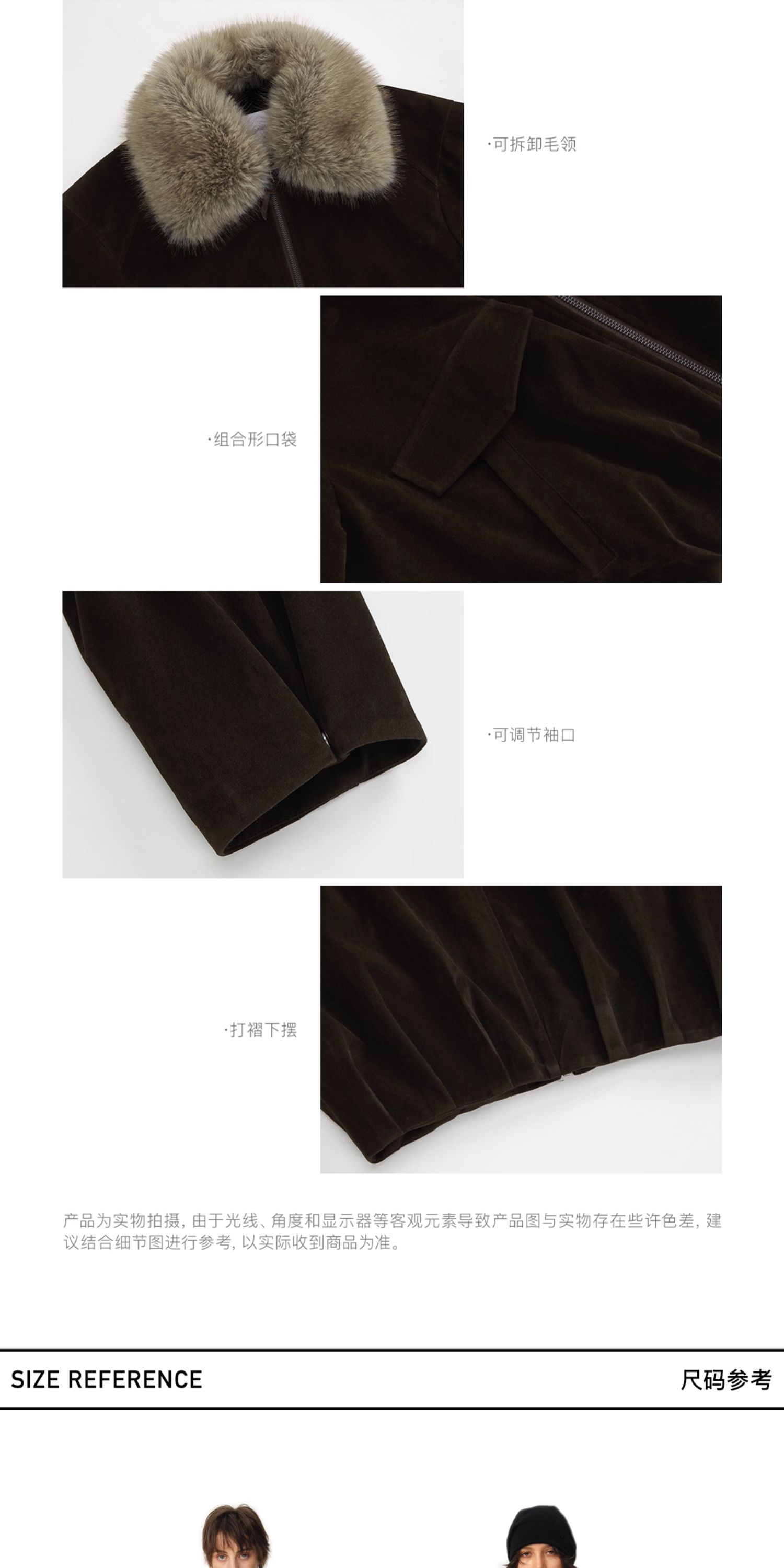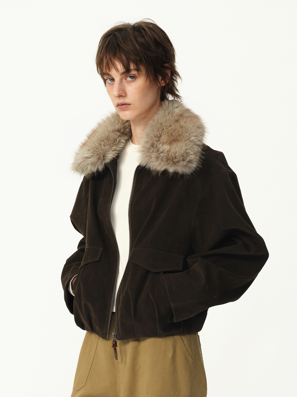 Evistub girls/E-5QWT1236/复古深棕麂皮可拆卸毛领花苞夹克外套